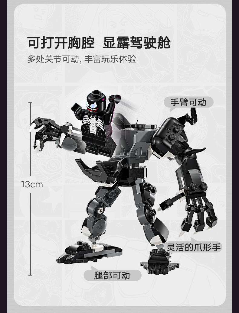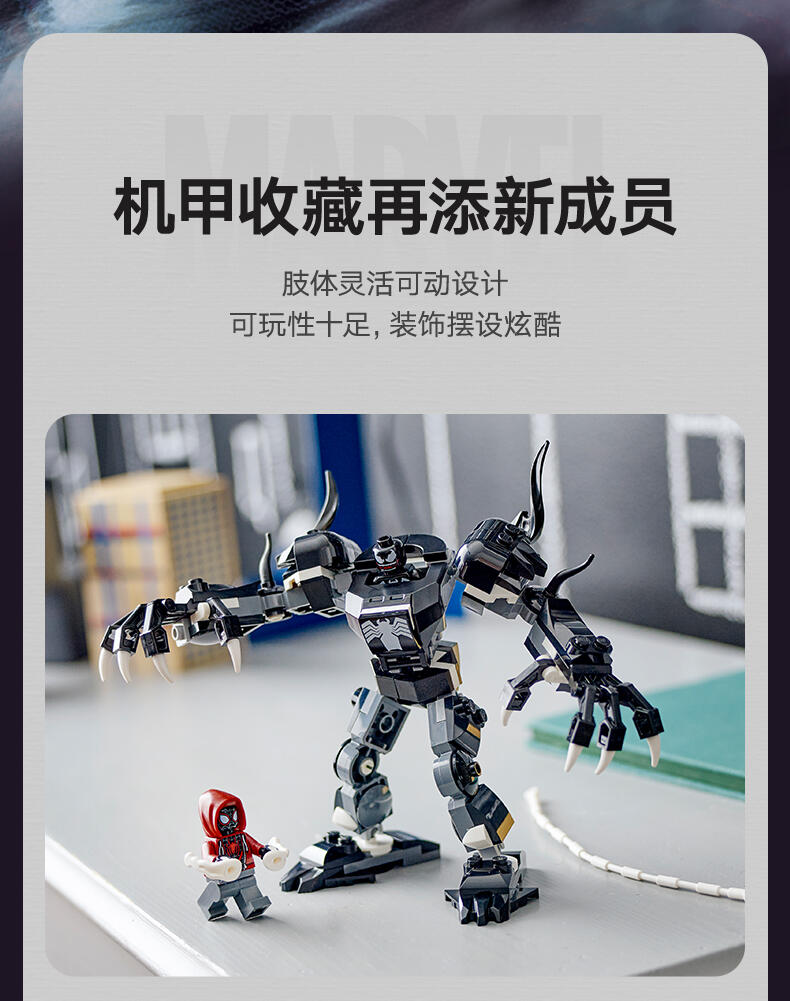 玩乐方式多样——毒液乐高 人仔可以进入机甲的驾驶舱,机甲的肢体灵活可调,可带来无尽的玩乐和展示机会