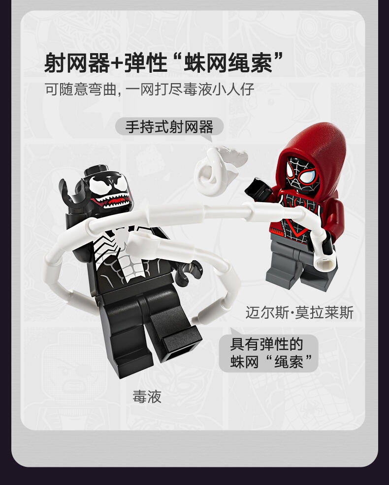 逼真的配件——乐高 威拼搭玩具的粉丝们可以使用 2 把手持式射网器和一条具有弹性的蛛网“绳索”进行角色扮演,其中“绳索”可与毒液机甲多点拼接