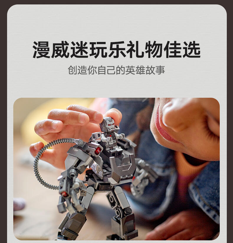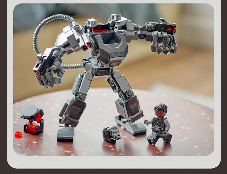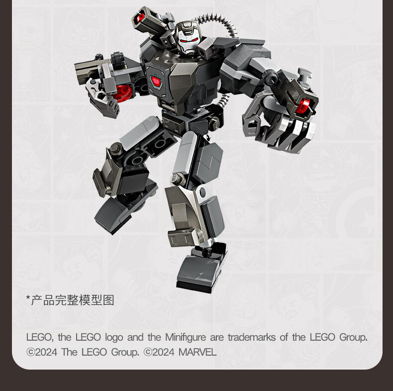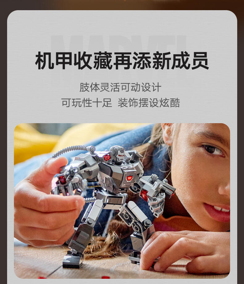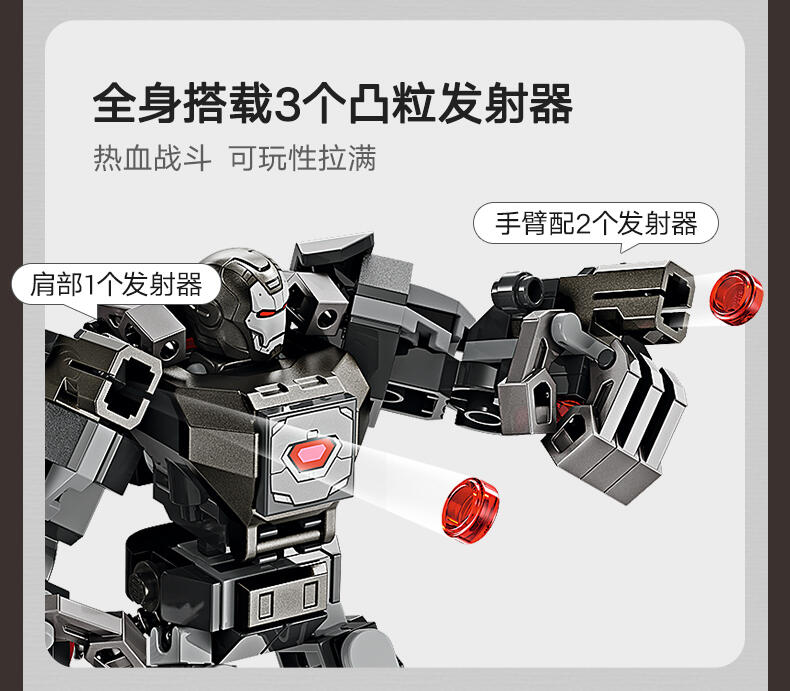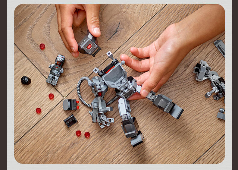 打开这款机甲的胸部,会显露出战争机器小人仔的驾驶舱。此机甲装备有 3 个凸粒发射器:肩膀上一个、手臂上 2 个,后背上还有一个储物箱,可以提供额外的弹药。这款肢体灵活的人偶拥有铰接式手臂、腿和手,以便战争机器和机甲战士粉丝们进行动手玩乐式战斗。孩子们可将此玩具套装与本系列的其它乐高漫威机甲(单独出售)组合,获得更多玩乐机会。如想体验额外的数字乐趣,拼搭师们可以使用直观有趣的 LEGO Builder 应用程序,缩放和旋转三维模型,以及跟踪进度。