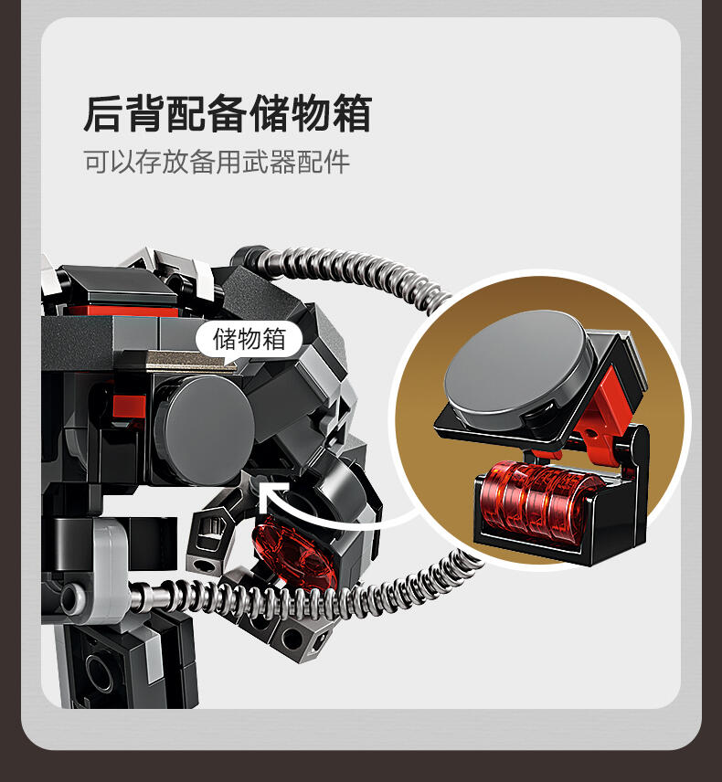 3 个凸粒发射器——孩子们可将小人仔放入机甲可以打开的驾驶舱,然后让机甲投入战斗,它的肩膀上装备有一个凸粒发射器,手臂上配有 2 个,后背上还有一个箱子,可以提供额外的弹药