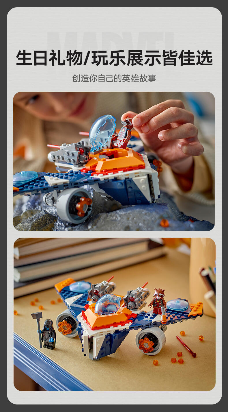 玩乐和展示——当一天的超级英雄行动结束时,可将这款漫威影业《银河护卫队》拼搭玩具展示在孩子的房间中