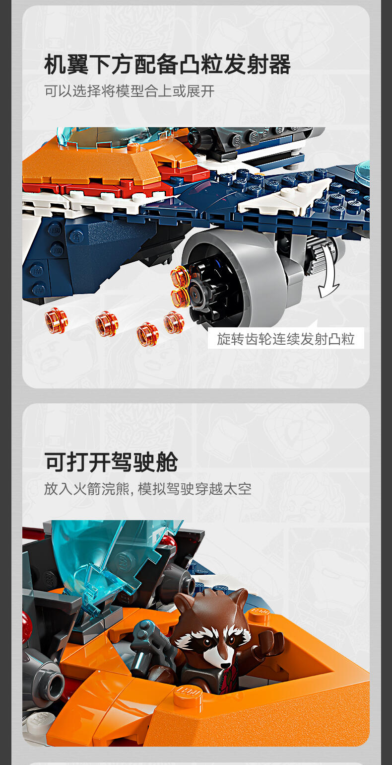这份漫威影业《银河护卫队》礼物非常适合电影、飞行器和超级英雄拼搭玩具爱好者。这艘太空飞船拥有可以打开的驾驶舱,能够容纳一个小人仔,飞船顶部装备有 2 个弹簧发射器,每个机翼下方配有一个巨型的 6 凸粒发射器。本套装包含 2 个小人仔:手持爆能枪的火箭浣熊,身披斗篷、手握 Cosmi-Rod 战锤的指控者·罗南。如想体验额外的数字乐趣,拼搭师们可以使用直观有趣的 LEGO Builder 应用程序,缩放和旋转三维模型,以及跟踪进度。