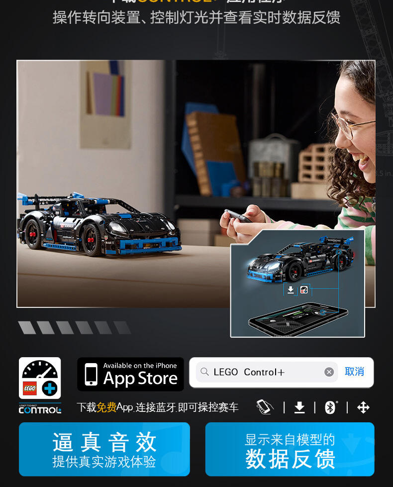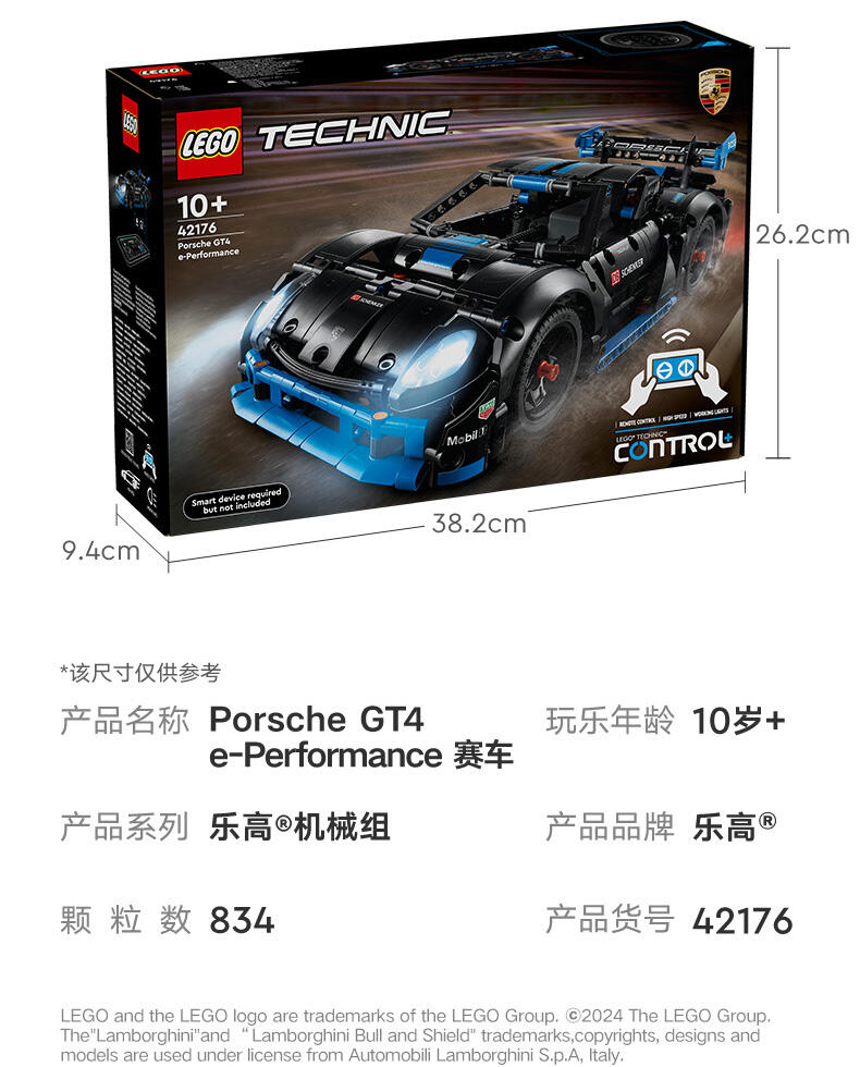 “让10岁以上的孩子在组装这款LEGO Technic保时捷GT4电子性能赛车玩具(42176)时,参加一个激动人心的项目。这款遥控赛车玩具模型具有许多互动功能,是LEGO Technics CONTROL+系列中最快的汽车(截至2024年8月)。访问CONTROL+应用程序操作转向、控制灯光,并在孩子们完善驾驶技能时查看实时数据反馈。
