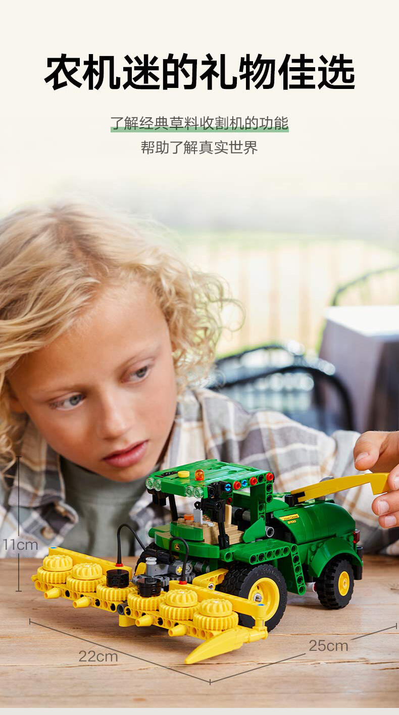 喜欢农场玩具的孩子们可以使用乐高技术John Deere 9700 Forage Harvester(42168)拖拉机玩具,为9岁以上的男孩和女孩们玩得很有创意。该模型构建套件采用经典的John Deere颜色,具有后轮转向和前部的饲料收割台工具,孩子们可以抬起、放下和旋转这些工具,以复制真正的玉米切割机的动作。这款乐高农场套装是送给喜爱乐高汽车和富有想象力游戏的孩子、男孩和女孩的绝佳生日礼物。LEGO Technic男孩和女孩的汽车玩具以逼真的细节为特色,以一种平易近人的方式向年轻的乐高建设者介绍工程。使用乐高积木应用程序,给孩子们一次有趣的建筑冒险。在这里,他们可以放大和旋转三维模型,并跟踪他们的进展。