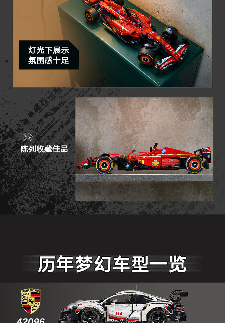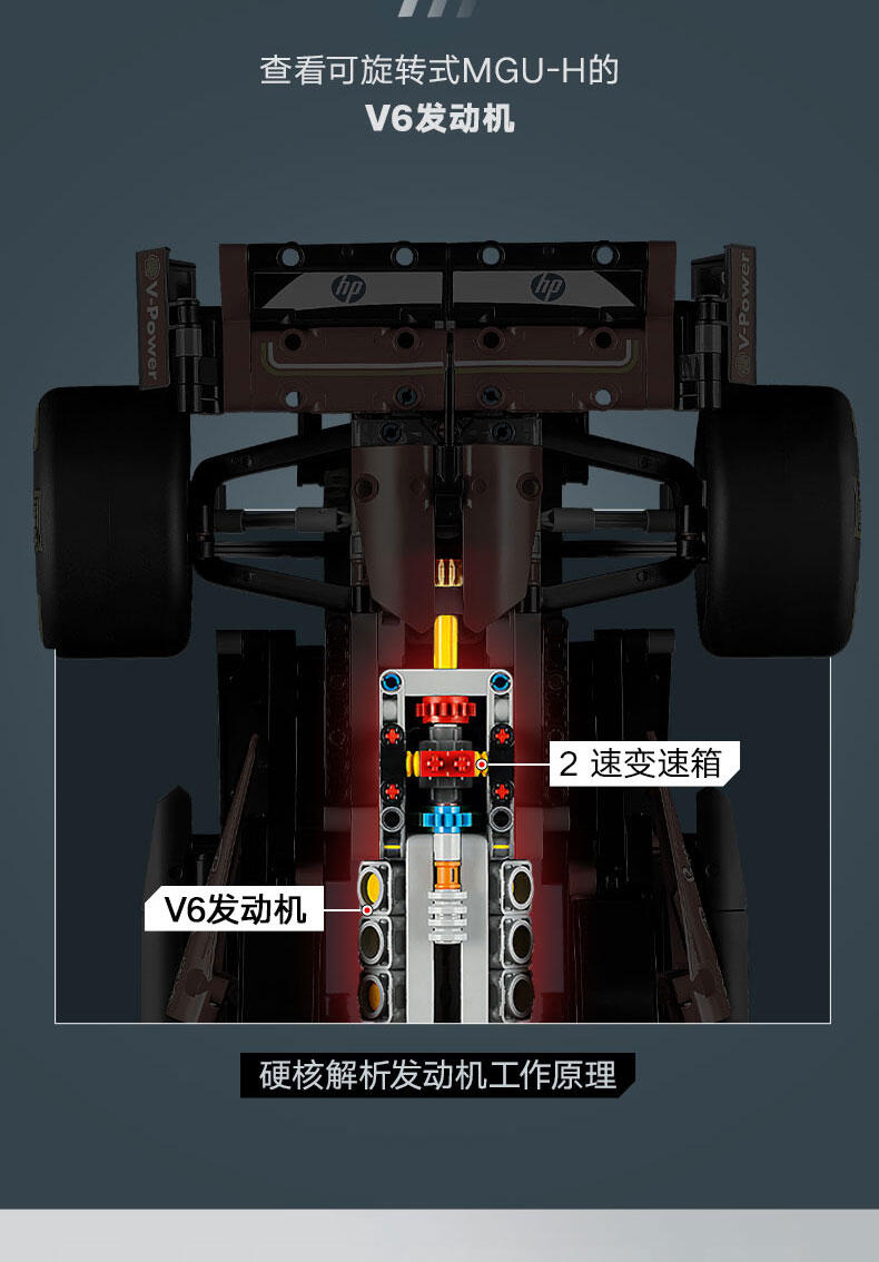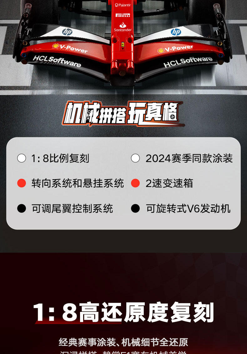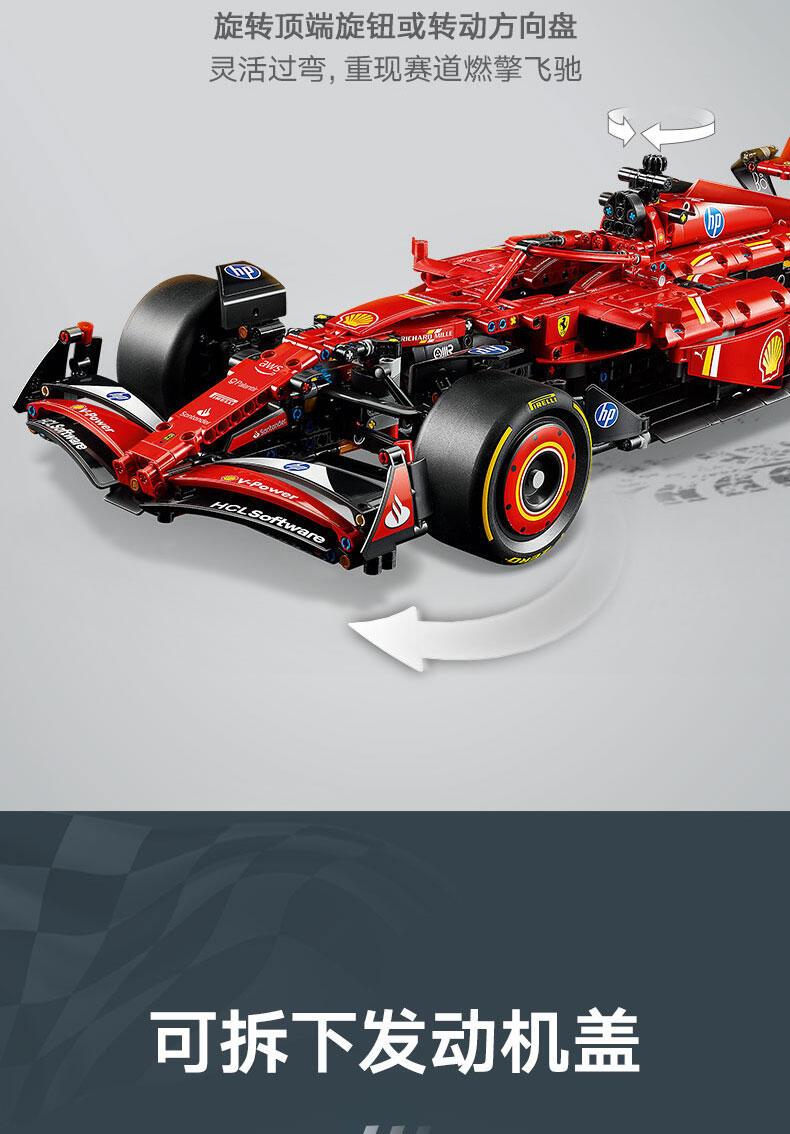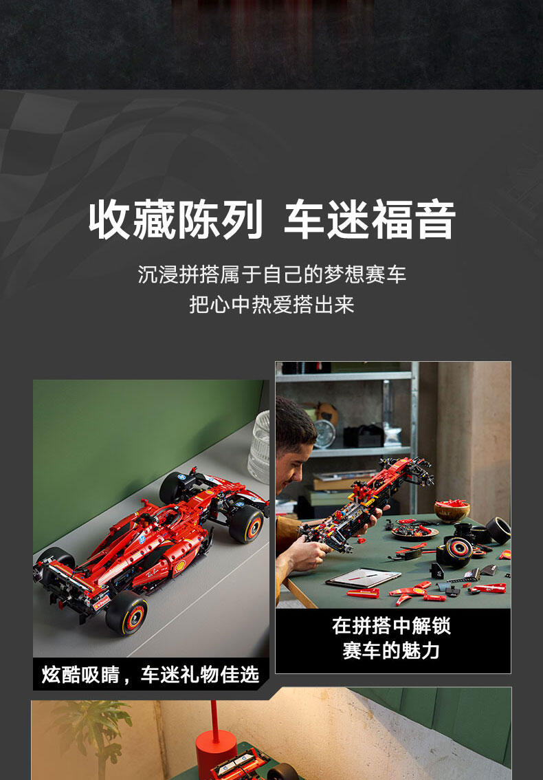 使用这款乐高 echnic 拉利SF-24 F1汽车模型套件(42207)为成年人打造自己的F1模型车,感受赛道的刺激。这套为赛车迷们提供了一个很好的礼物创意,当你组装这辆1:8比例的F1模型车的逼真功能时,它会提供一个身临其境的建筑项目。在构建转向、2速变速箱和印刷轮胎等细节时,培养新的工程技能。通过上下调整扰流板进入DRS区域,然后拆下发动机罩,用旋转的MGU-H检查V6发动机。想象一下在展示您的模型以致敬您对F1的热情之前,最后一圈对决的刺激。用乐高技术成人汽车套件(每件单独出售)建造您的梦想车库。使用LEGO Builder应用程序享受直观的建筑体验,您可以在其中放大和旋转3D模型,跟踪进度并将所有集合保存在一个地方。