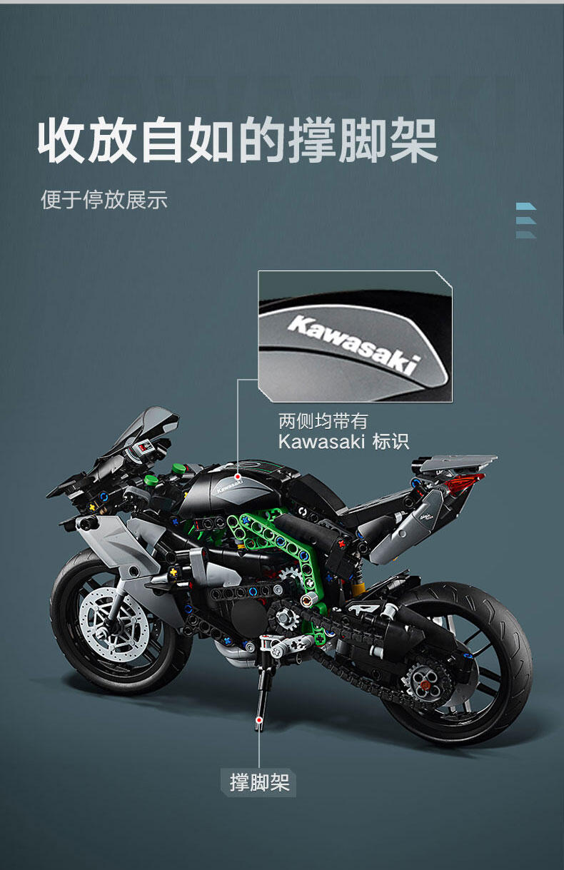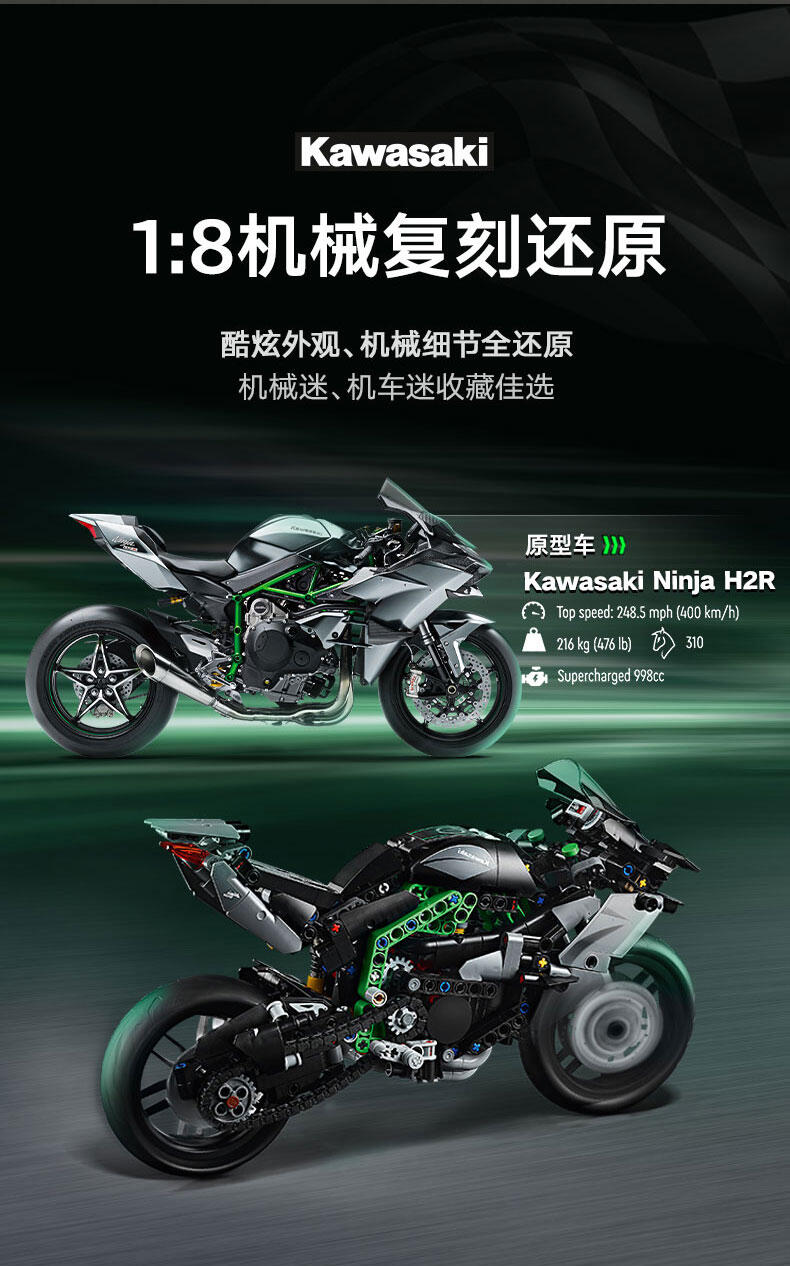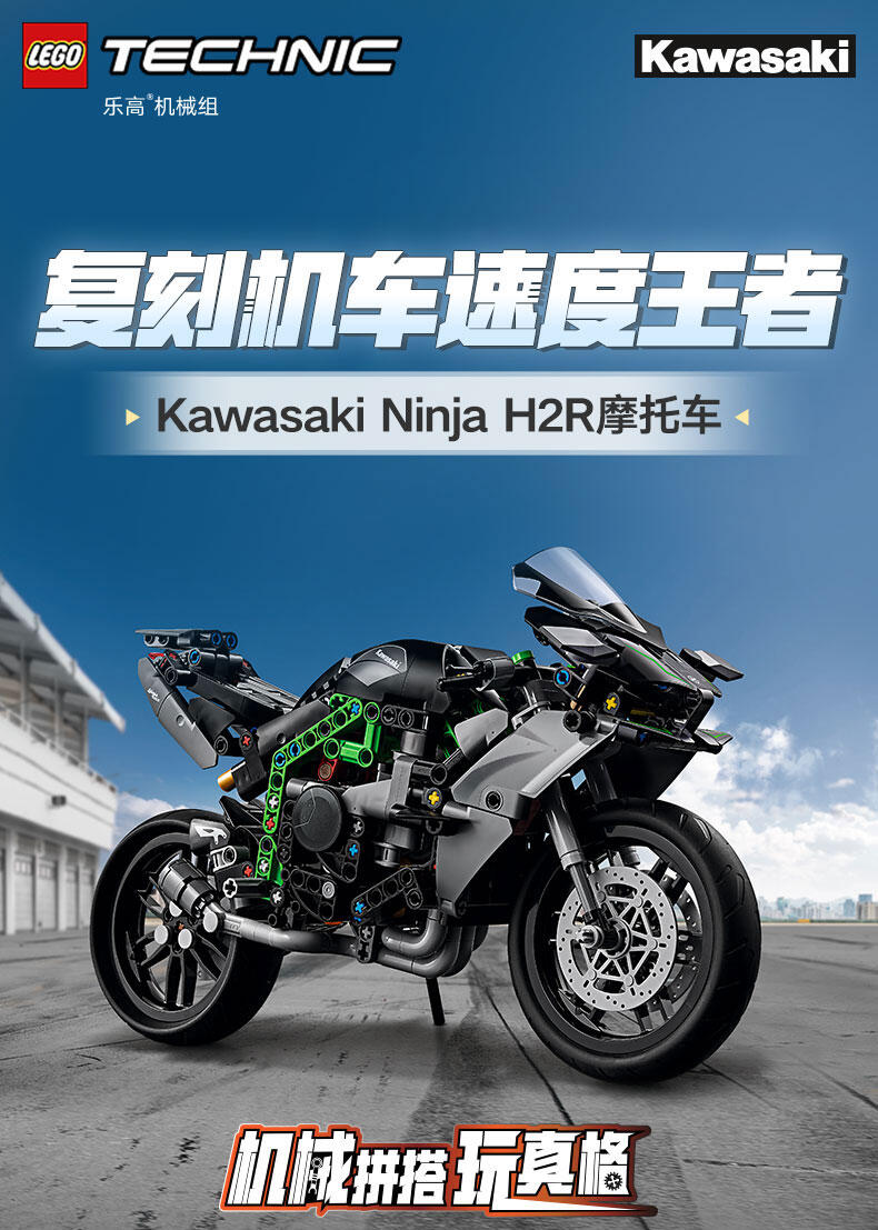 使用这款专为 10 岁及以上孩子准备的乐高 机械组 Kawasaki Ninja H2R 摩托车 (42170) 玩具,启发他们探索工程和技术的世界。这款拼搭套装一丝不苟地重现了世界上速度最快的摩托车之一 (Kawasaki Ninja H2R) 的细节。