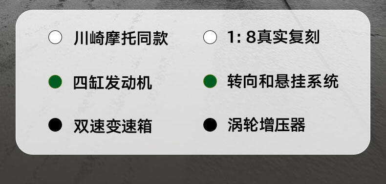 这款 1:8 比例的模型摩托车礼物专为孩子准备,拥有转向装置、悬挂系统、双速变速箱、4 缸发动机和涡轮增压器。特殊的挡风玻璃组件带有定制式装饰,油箱两侧均带有 Kawasaki 标识。孩子们可以重现系列特征,尝试不同的功能,然后用撑脚架自豪地展示他们的摩托车模型。