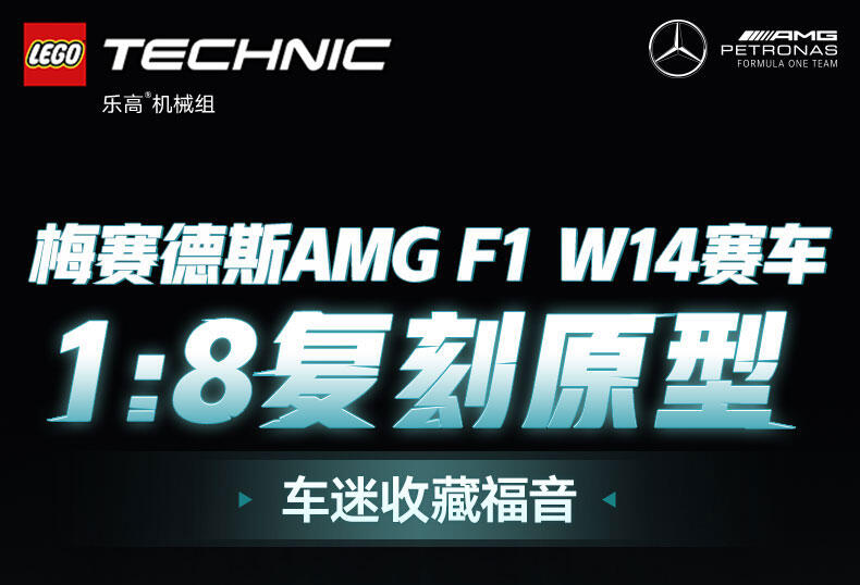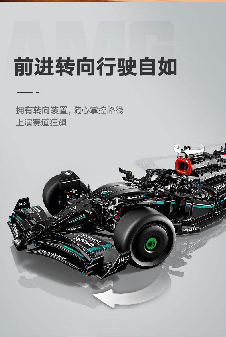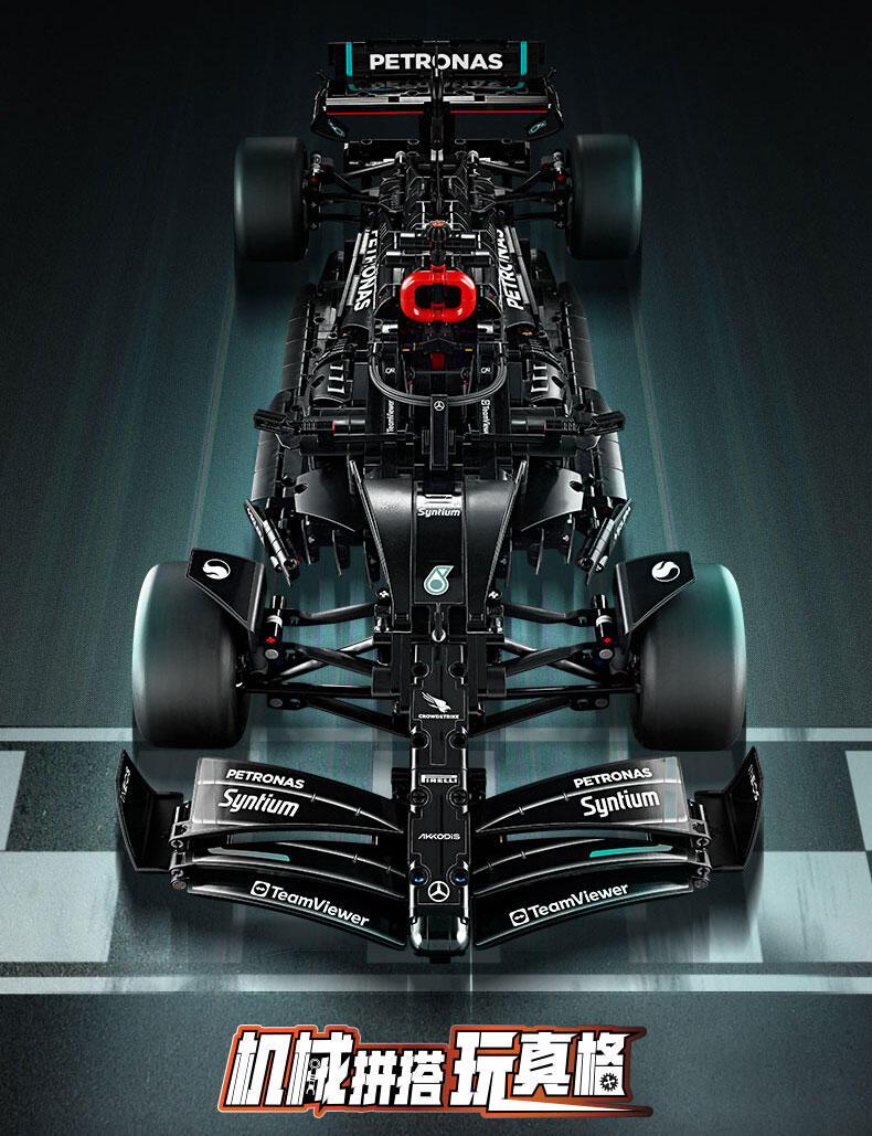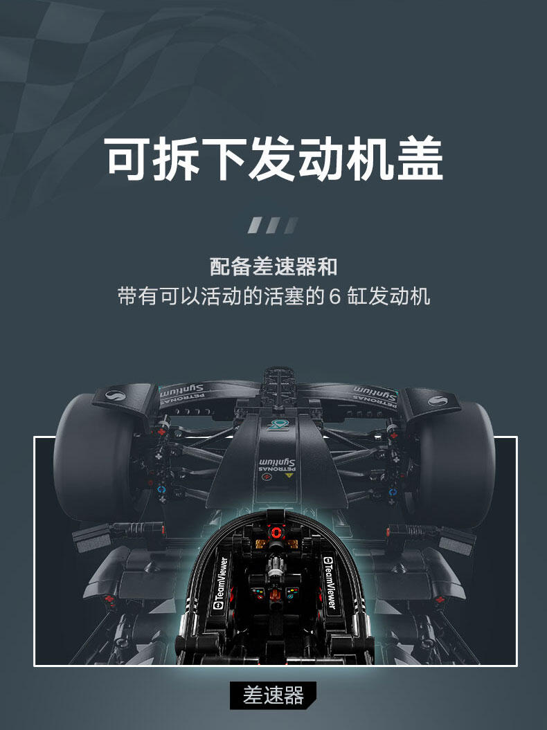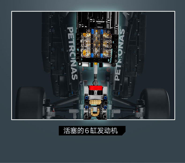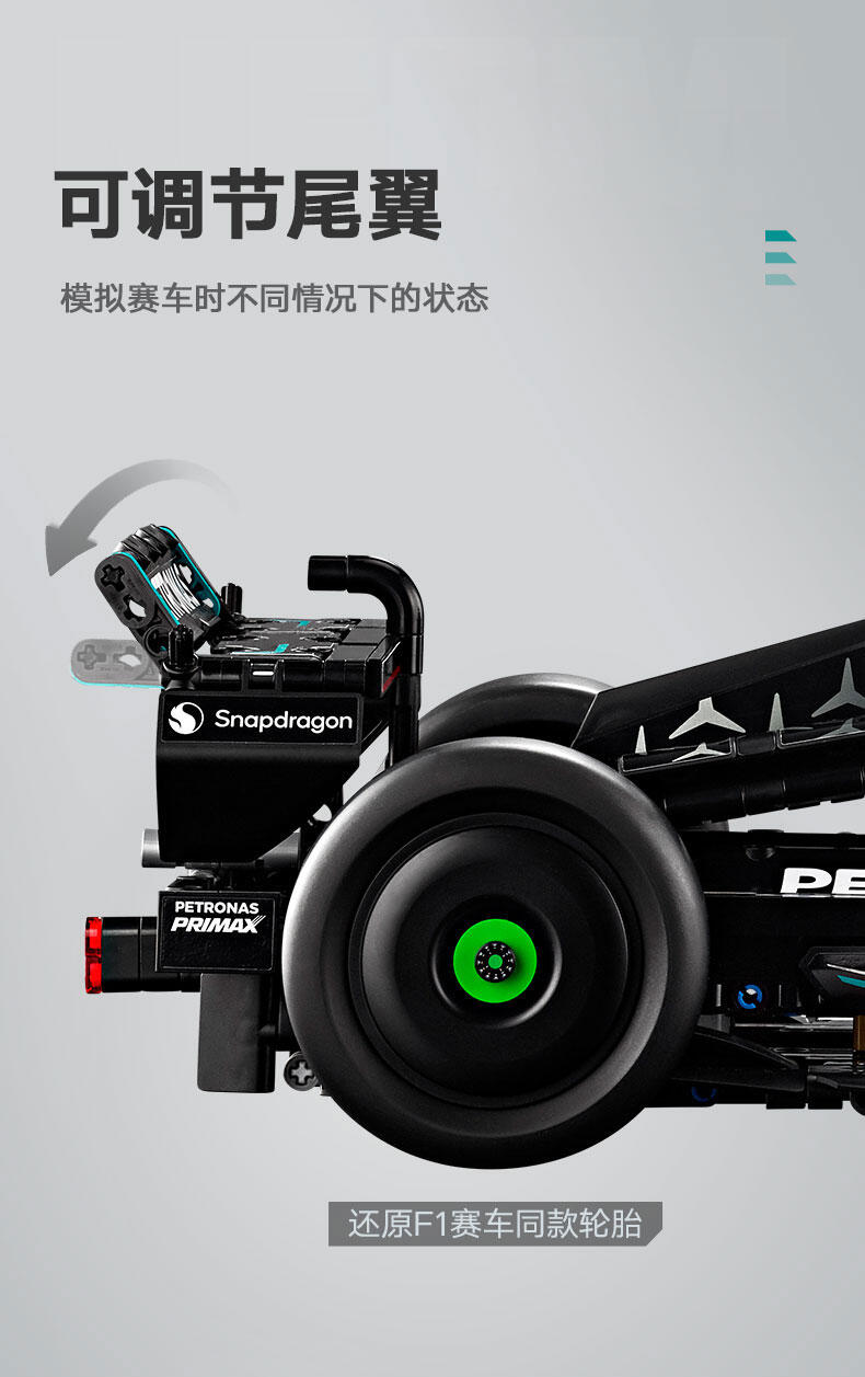 - 系列功能中包括转向功能,其可由转向轮或车顶的旋钮控制。可以移除发动机盖,显露出差速器和带有可以活动的活塞的 6 缸发动机。这款模型非常注重细节,还拥有可以打开的尾翼,其设计灵感源自真实汽车的可调式尾翼 (DRS)。这款专为成人准备的 Mercedes F1 赛车模型拼搭套装可作为喜爱很酷乐高套装的赛车迷的很棒礼物。