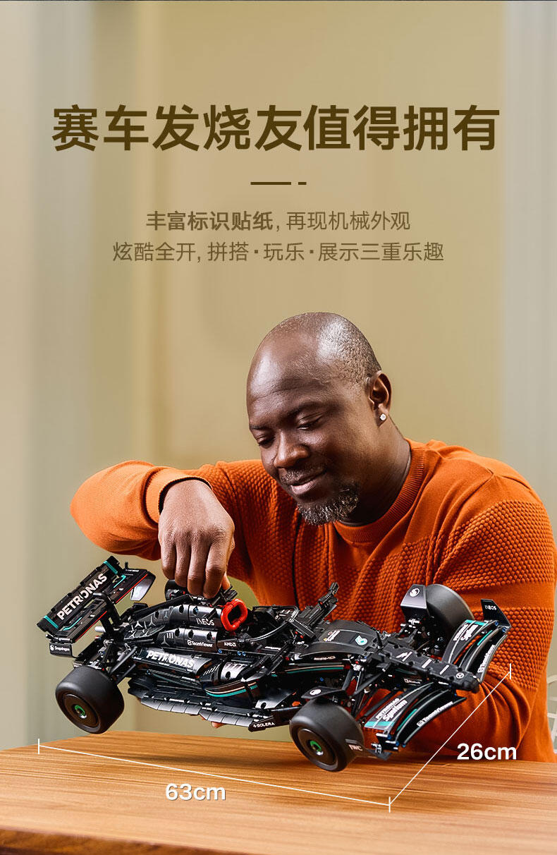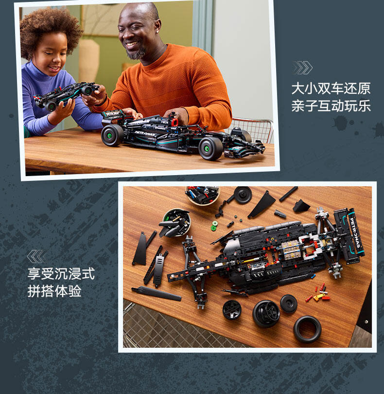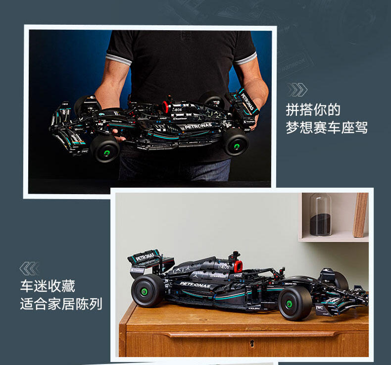 - 适合成人的赛车礼物项目——这款 Mercedes-AMG F1 W14 E Performance 赛车套装可作为喜爱挑战项目的成人赛车迷的很棒礼物,令其收获满满