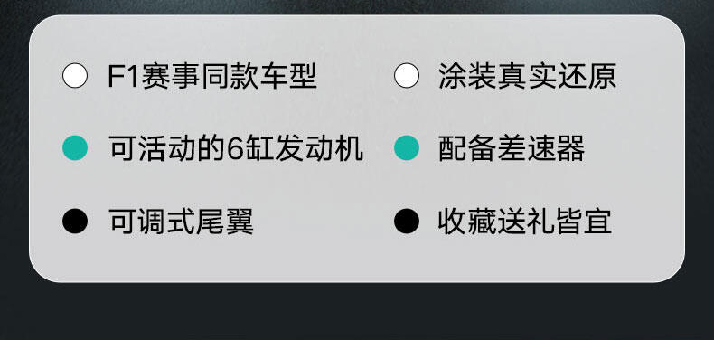 - 逼真的功能和细节——系列功能包括差速器、带有可以活动的活塞的 6 缸发动机,以及可以打开的尾翼,其设计灵感源自真实汽车的可调式尾翼