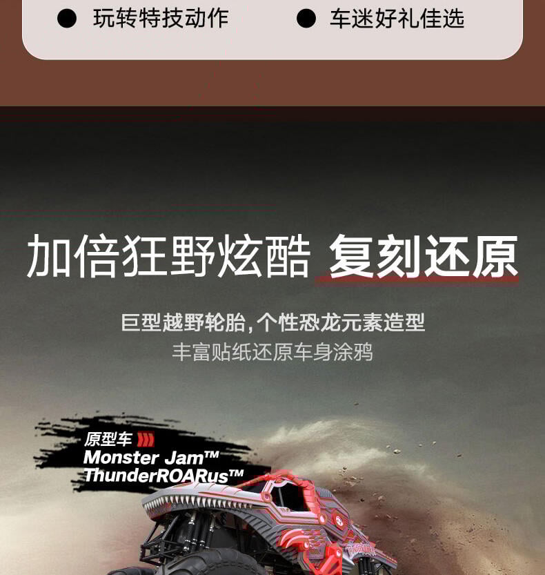 利用这款激动人心的回力车,为喜爱 Monster Jam 玩具的孩子带来激动人心的快速动作乐趣。孩子们会喜欢上在玩乐中发挥创造力,并培养自己的拼搭技能。回拉然后释放,让这辆越野车加速前进。尝试有趣的竞技场风格的特技和驾驶技巧。查看 ThunderROARus 的尖刺、鳞片和牙齿。