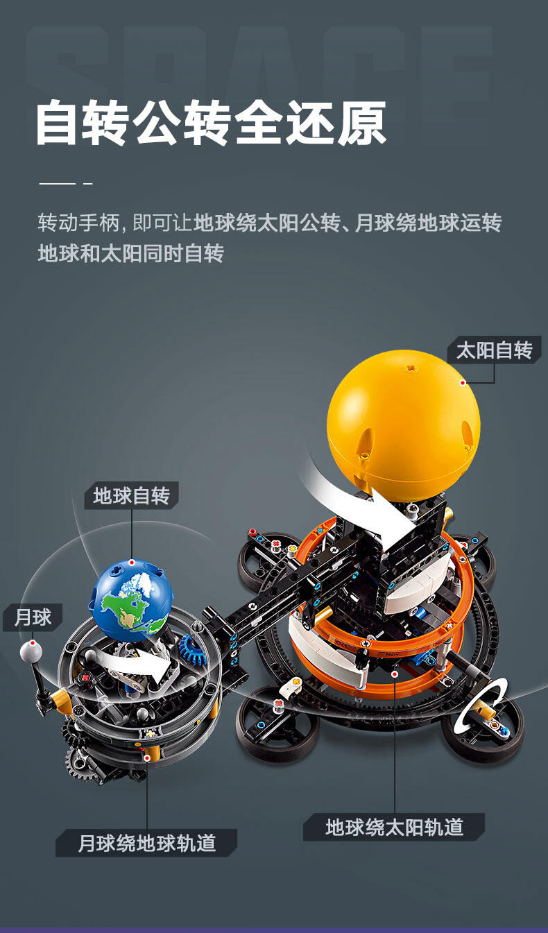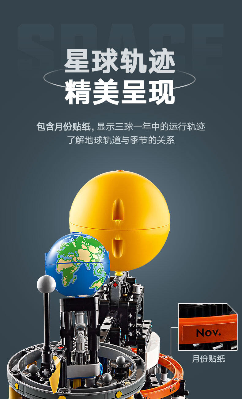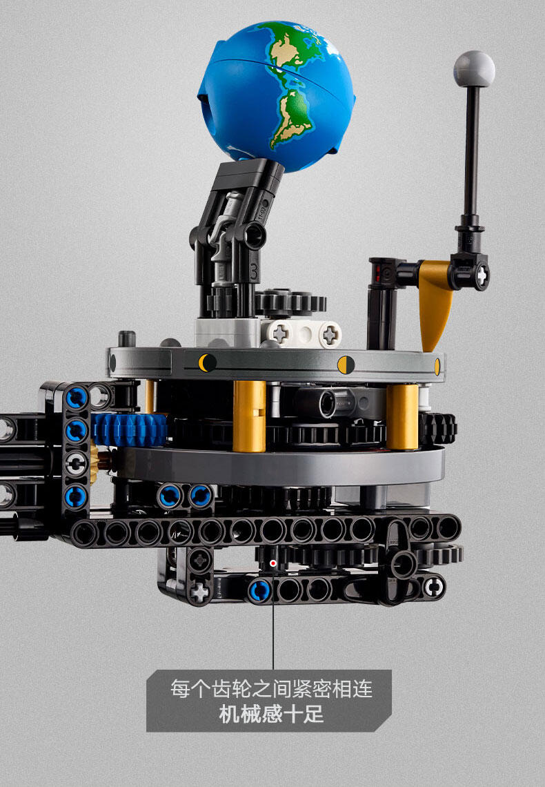 拼搭这款交互式乐高 机械组地球和月亮轨道运转模型,了解地球、太阳和月亮的关系。查看月亮如何绕地球旋转,而同时地球如何绕太阳旋转。可以转动曲柄,观察地球和月亮沿着逼真的轨道旋转。印制精美的月份和月相显示了地球、太阳和月球在一年中的轨迹。