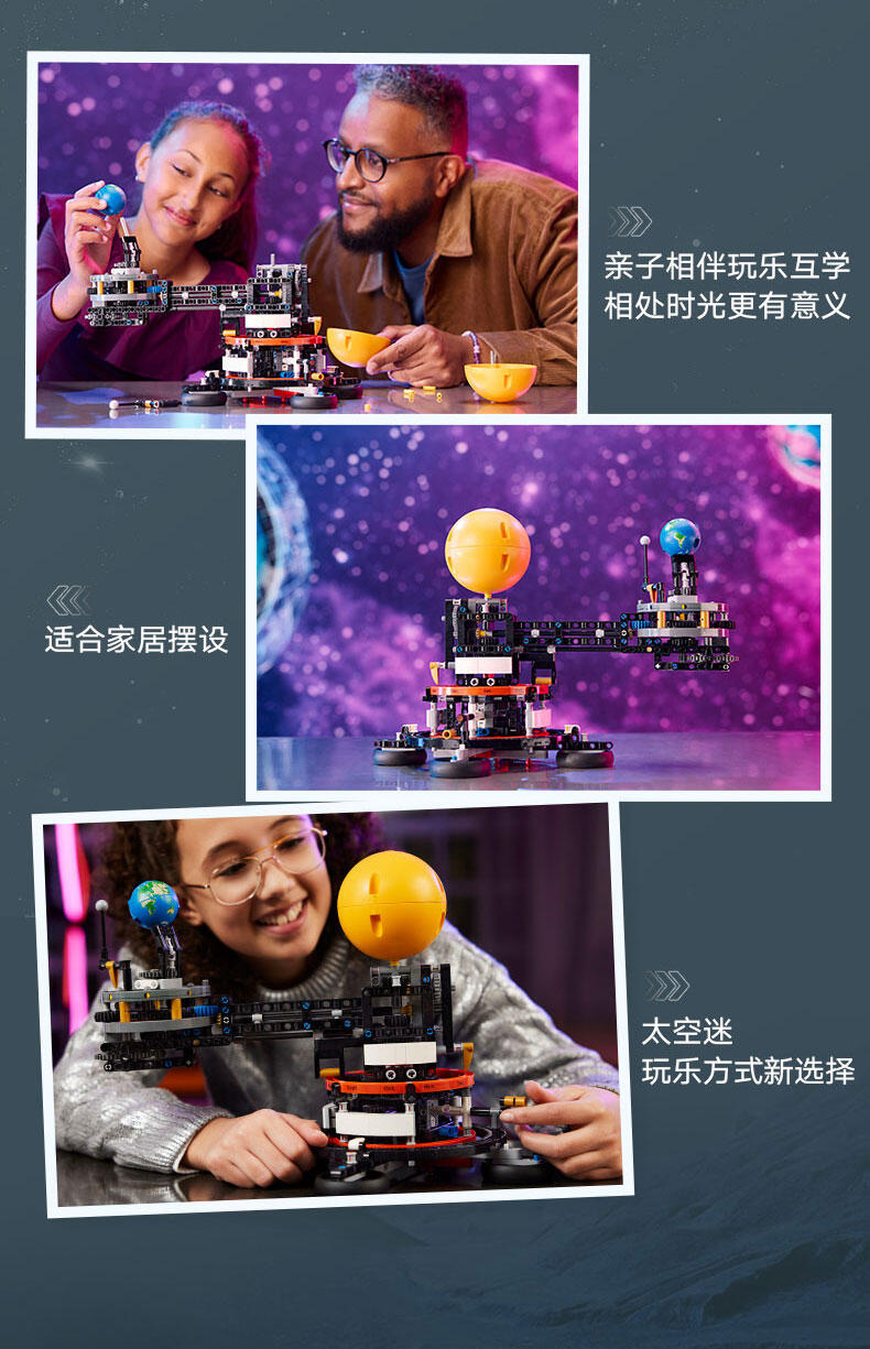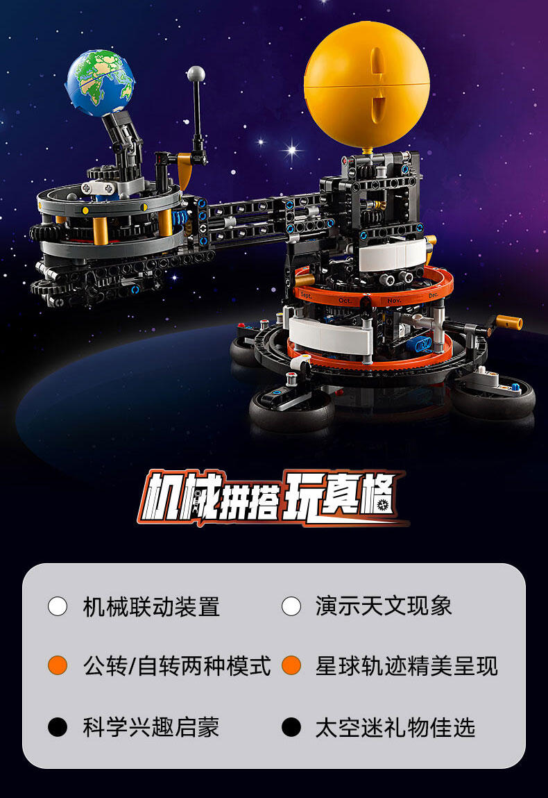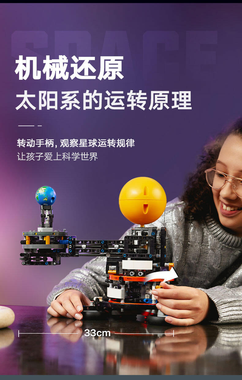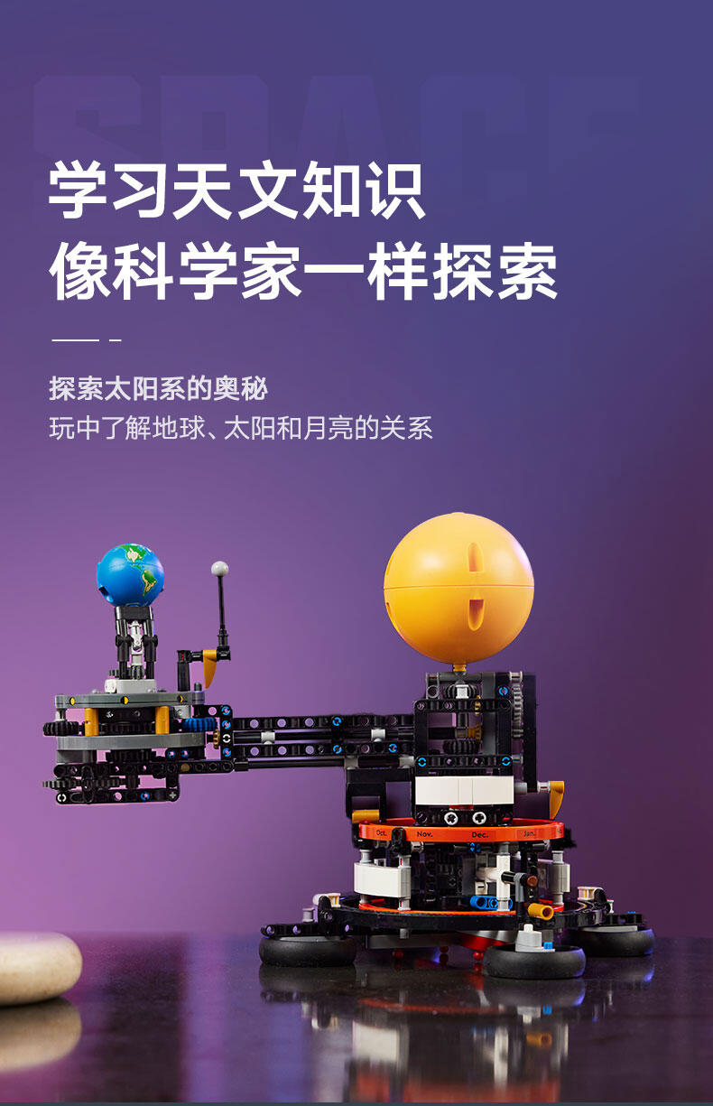 拼搭这款交互式乐高 机械组地球和月亮轨道运转模型,了解地球、太阳和月亮的关系。查看月亮如何绕地球旋转,而同时地球如何绕太阳旋转。可以转动曲柄,观察地球和月亮沿着逼真的轨道旋转。印制精美的月份和月相显示了地球、太阳和月球在一年中的轨迹。