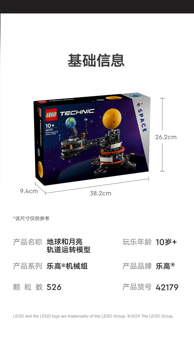 - 玩乐这款乐高 机械组地球和月亮轨道运转模型 (42179) 太空玩具套装,10 岁及以上充满好奇心的孩子会喜欢上深入了解我们的太阳系。这款交互式套装会使不同的概念容易理解,像地球和月亮的运转轨道、地球重力以及地球旋转如何影响季节。系列很酷的功能中包括一根曲柄,可供男孩和女孩转动,产生星球运转的效果。还提供印制精美的月份和月相,显示了地球、太阳和月球在一年中的轨迹。本套装可作为喜爱星球玩具的孩子的很棒礼物。可以关注更多乐高机械组太空礼物(单独出售)。 适合孩子的乐高机械组拼搭玩具拥有逼真的细节,能够通过创意玩乐将年轻的乐高拼搭师们带入工程的世界。借助 LEGO Builder 应用程序,让孩子踏上轻松直观的拼搭探险之旅,他们可以在其中缩放和旋转三维模型,保存套装,以及跟踪进度。