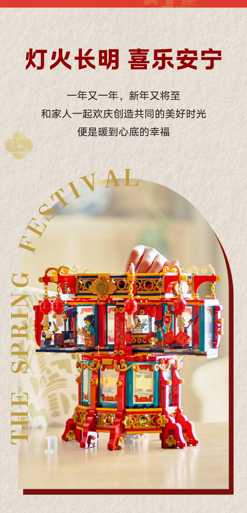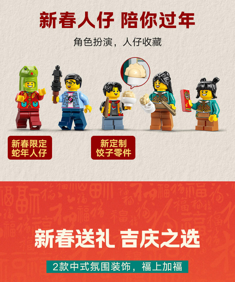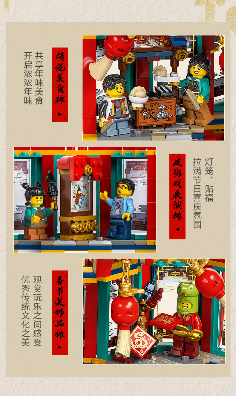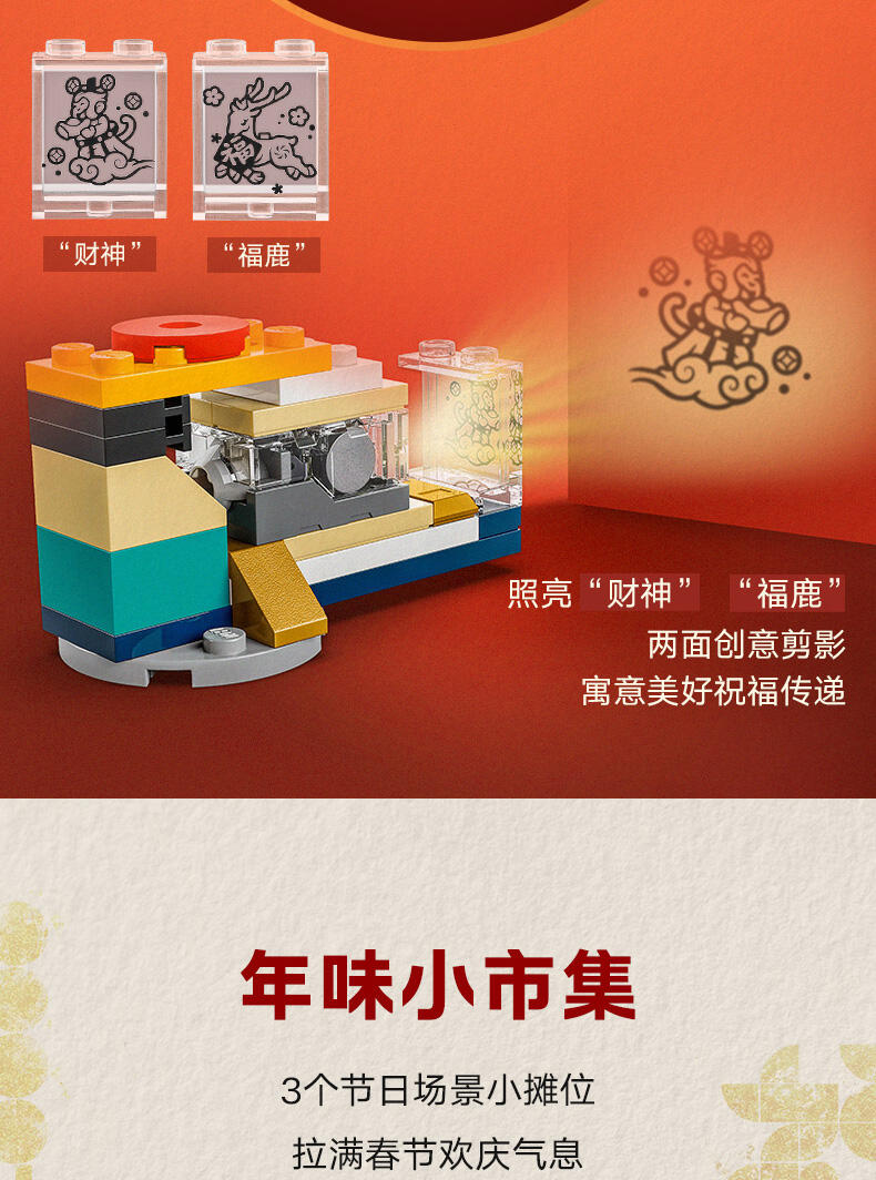 使用这款趣味十足的乐高 示模型点亮家庭春节庆祝活动。孩子们可以拼搭这款细节丰富的模型,表演蛇年故事,并了解文化传统。从 2 个备选的剪影罩子中进行选择。开启乐高 光积木。包含一个身穿蛇年服装的角色。打开可拆卸式顶层,会显露出 3 个节日场景。小人仔比例的场景包括皮影戏。包括美食摊和装饰品摊。