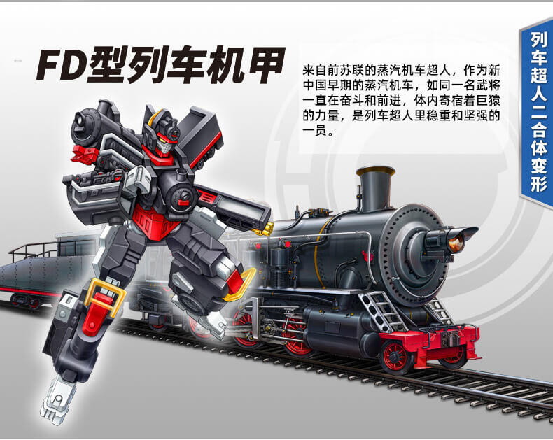 FD型列车机甲,来自前苏联的蒸汽机车超人,作为新中国早期的蒸汽机车,如同一名武将一直在奋斗和前进,体内寄宿着巨猿的力量,是列车超人里稳重和坚强的一员。