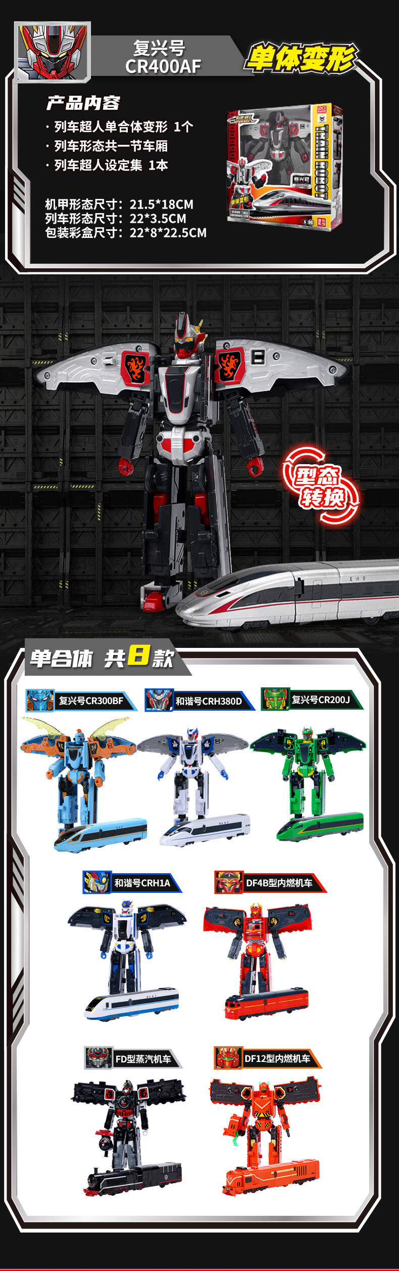 复兴号CR400AF型列车机甲,以“红”神龙命名的它设计时速350公里,试验时速420公里。拥有令人骄傲的强大输出动力和一流水准的速度。体内寄宿着龙的力量,而且善良而乐于助人,是列车超人种类似队长的存在。