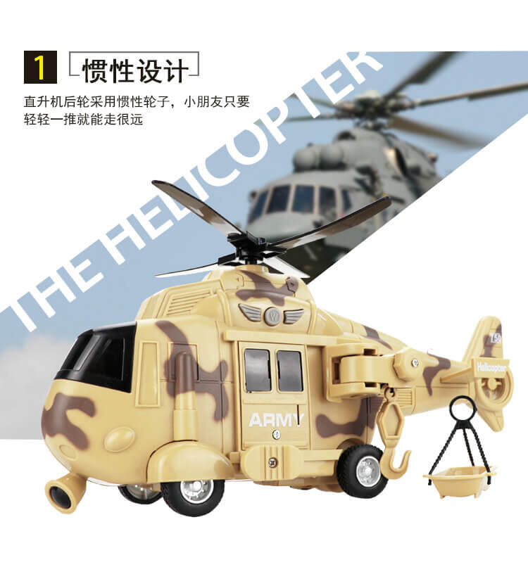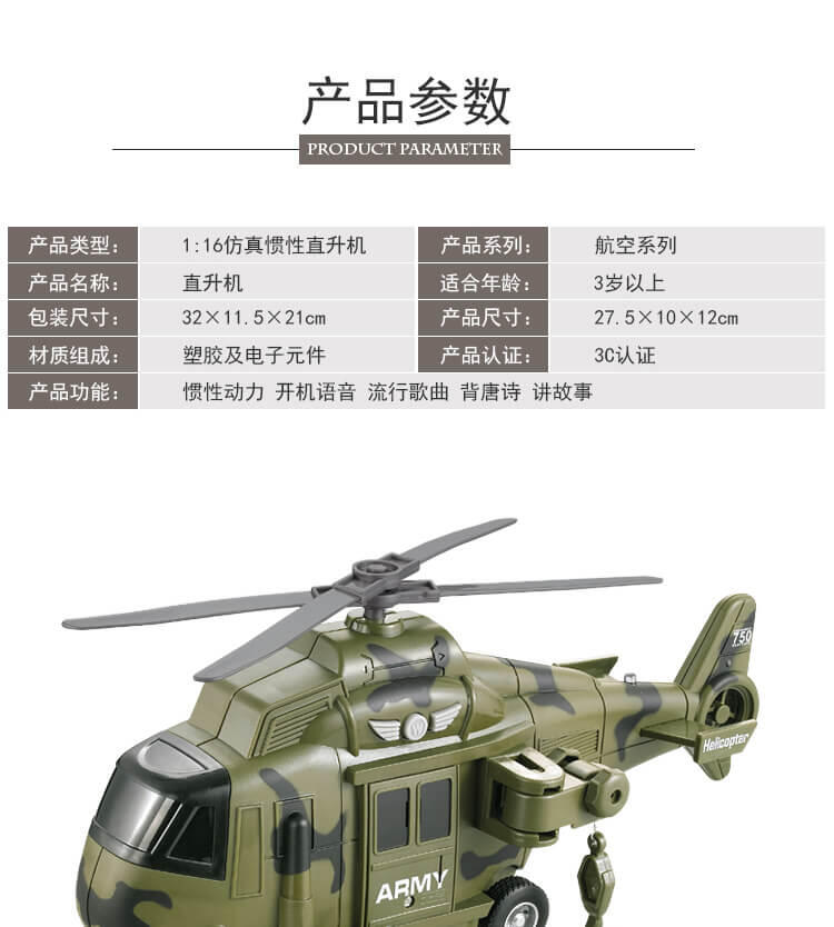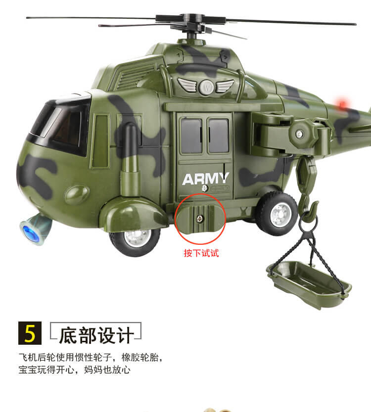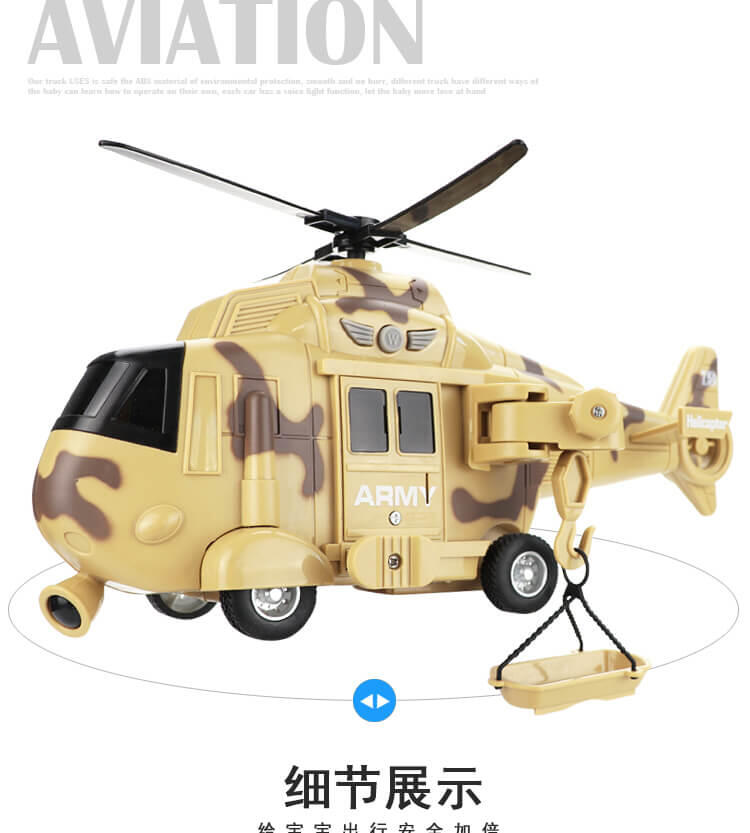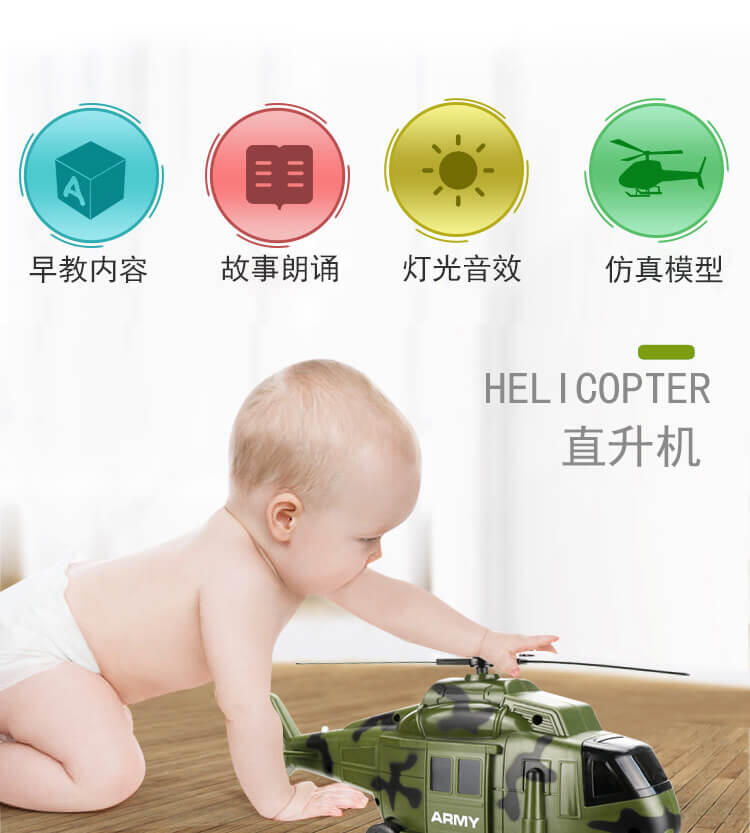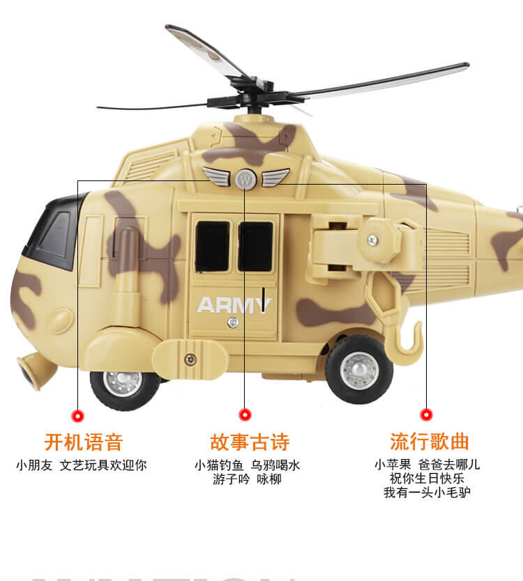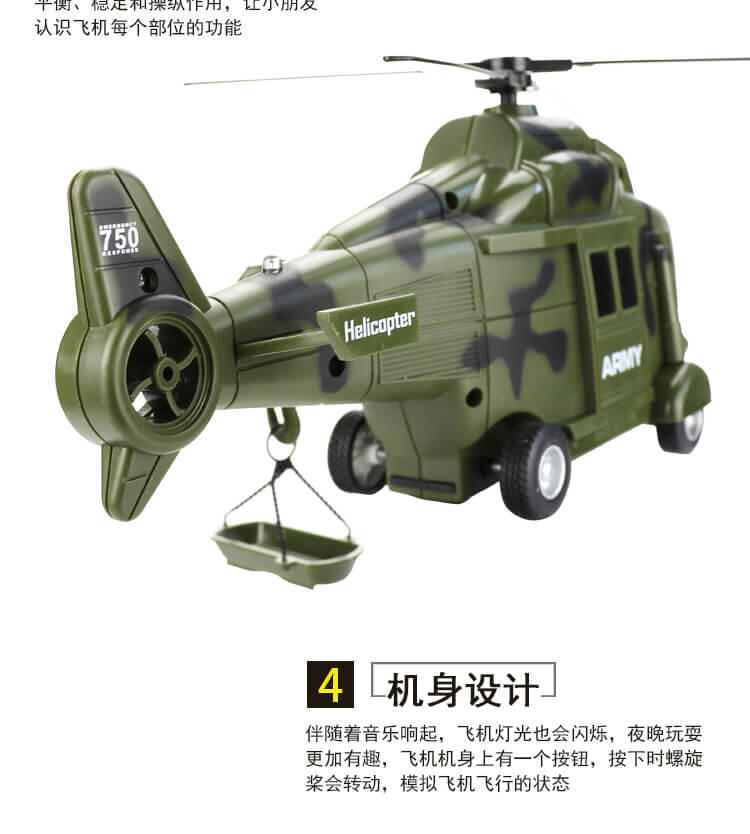 1.车轮带惯性功能 2.车顶螺旋桨可通过按压旋转 3.车身有3个按钮,按下去会有不同的故事歌曲,还伴有灯光闪烁 4.每只飞机都带有一个篮子,可通过飞机身上的钩子旋转来控制绳子的长短玩耍