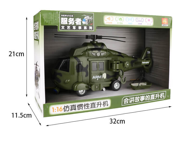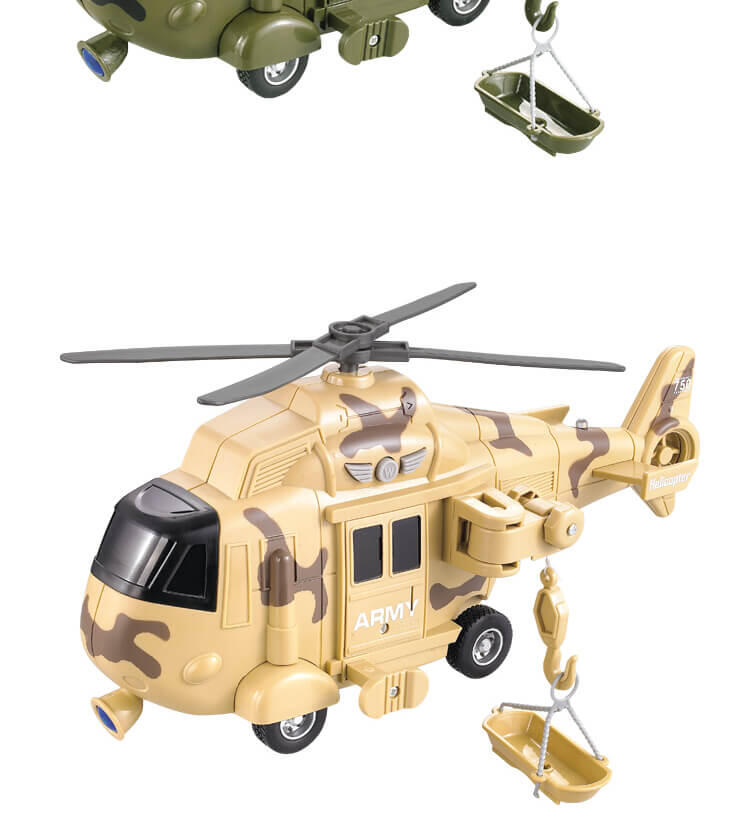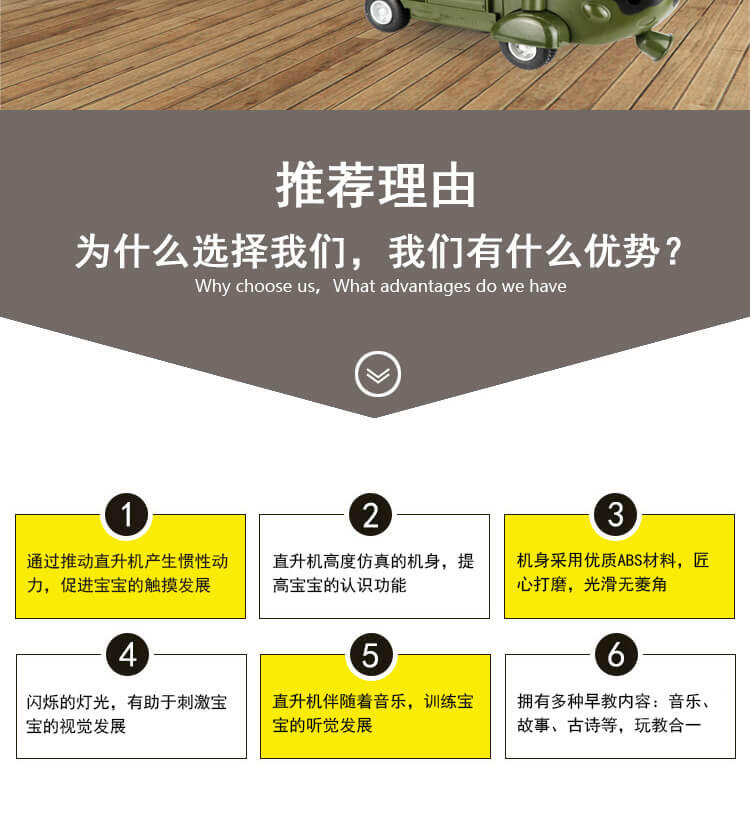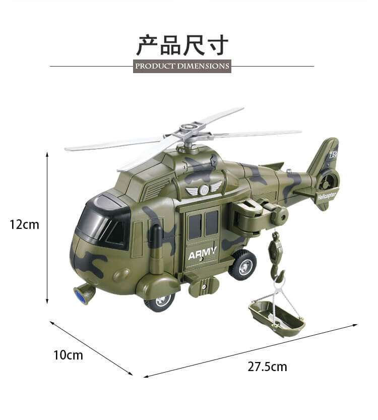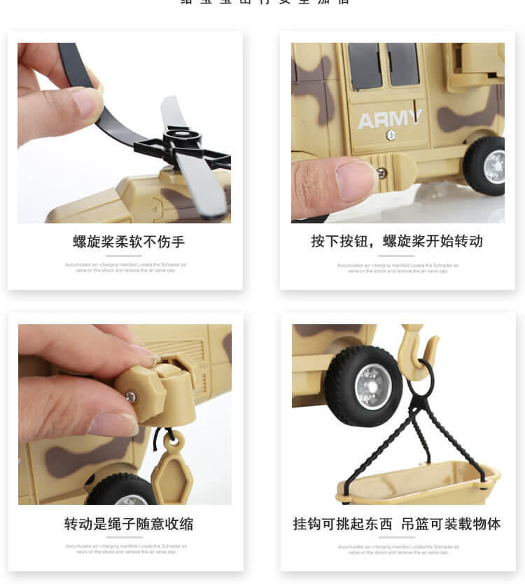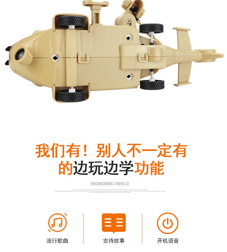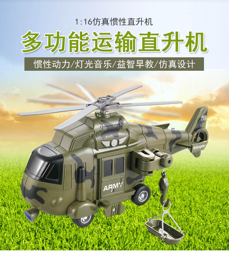 1.车轮带惯性功能 2.车顶螺旋桨可通过按压旋转 3.车身有3个按钮,按下去会有不同的故事歌曲,还伴有灯光闪烁 4.每只飞机都带有一个篮子,可通过飞机身上的钩子旋转来控制绳子的长短玩耍