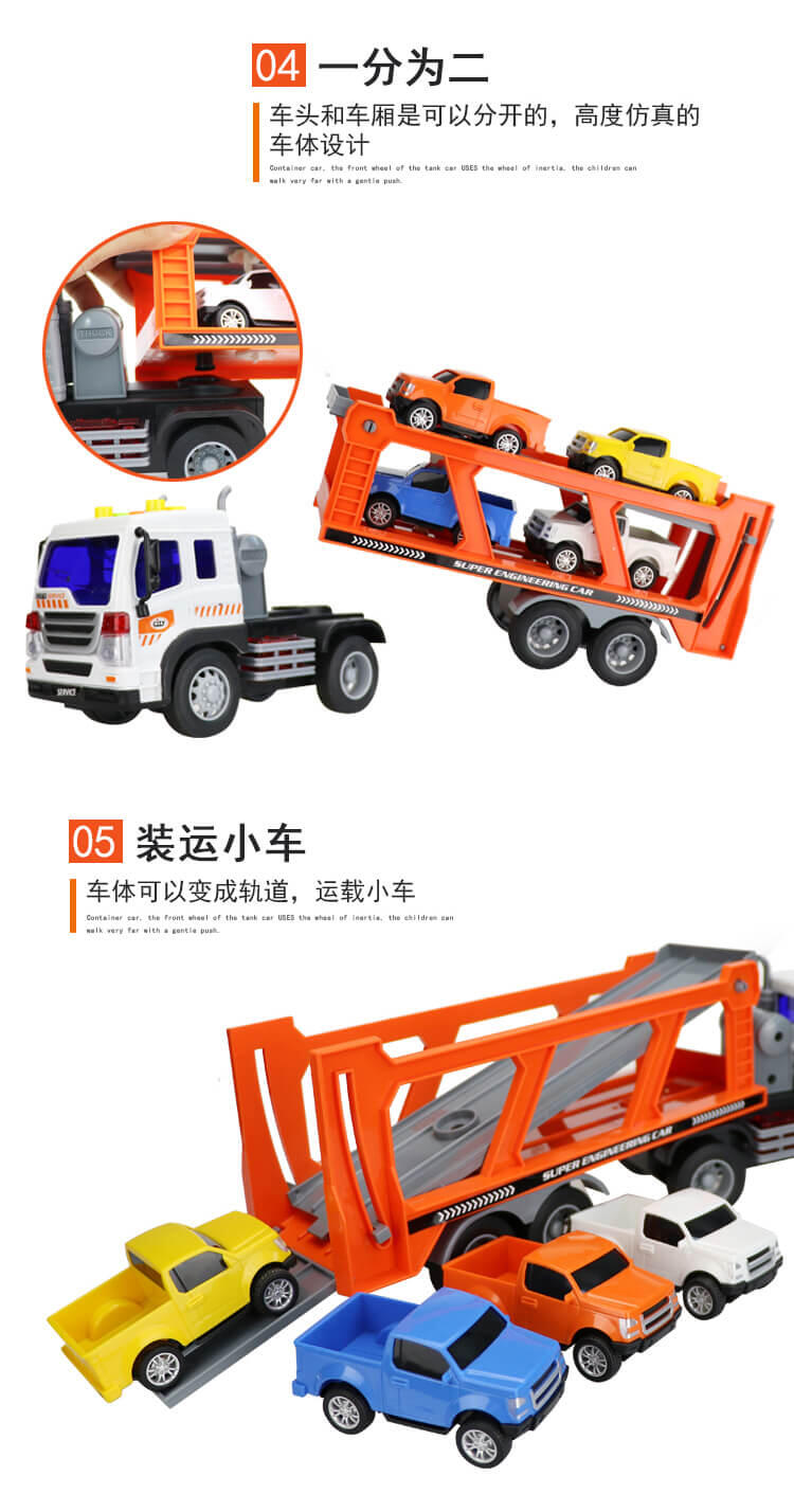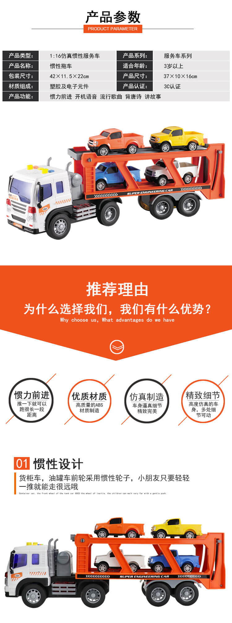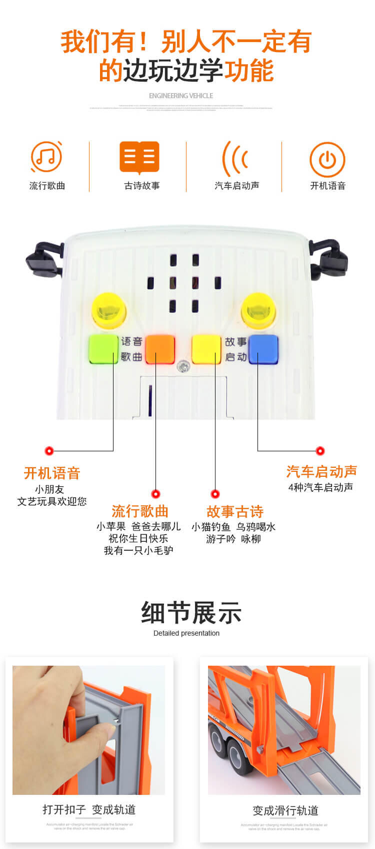 环保材质。安全,放心。拖板车的车板可以下放形成滑行跑道,随机赠送四个滑行小车,一个玩具,多种玩法,让宝宝玩耍起来爱不释手。车顶有丰富的功能按键,包括语音歌曲故事以及启动。