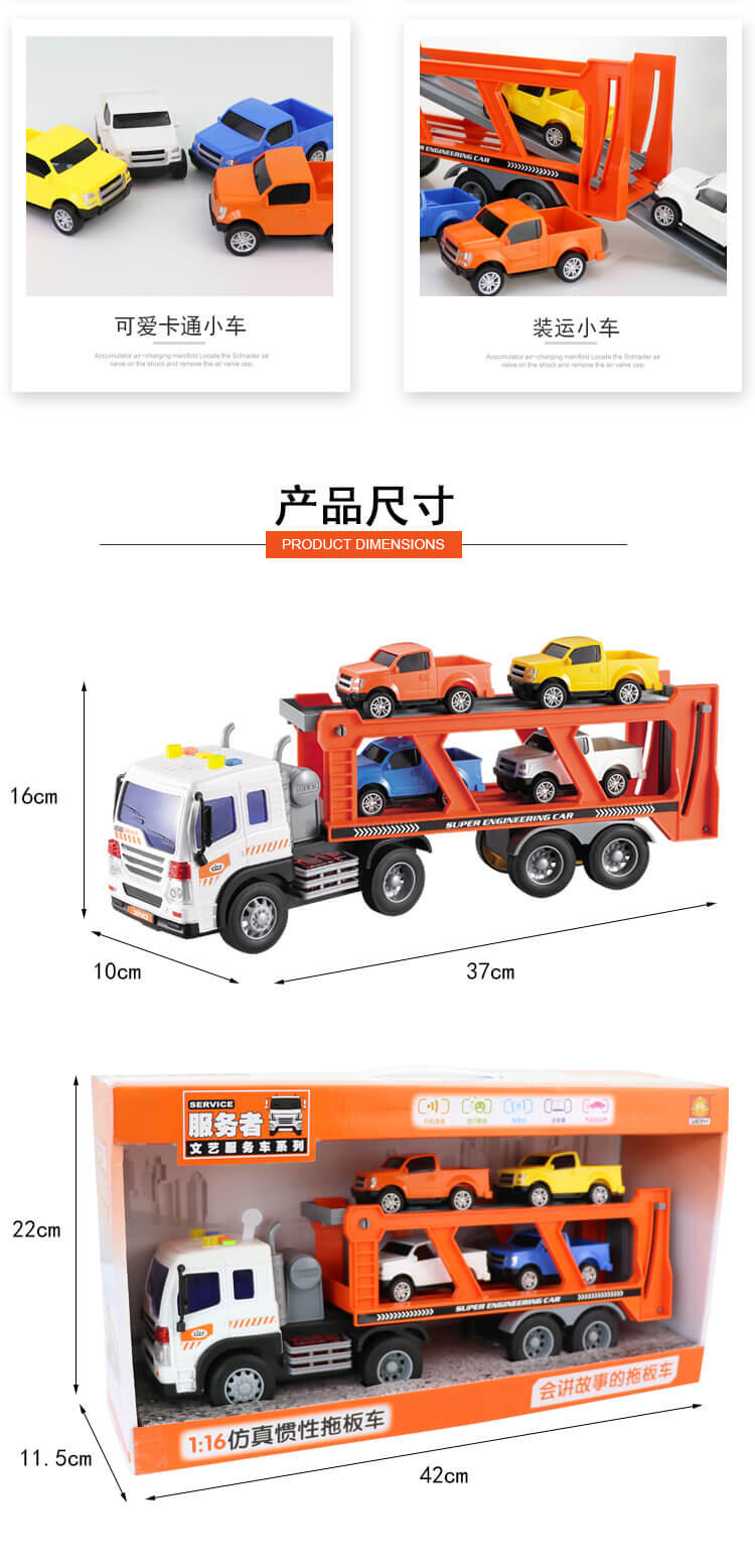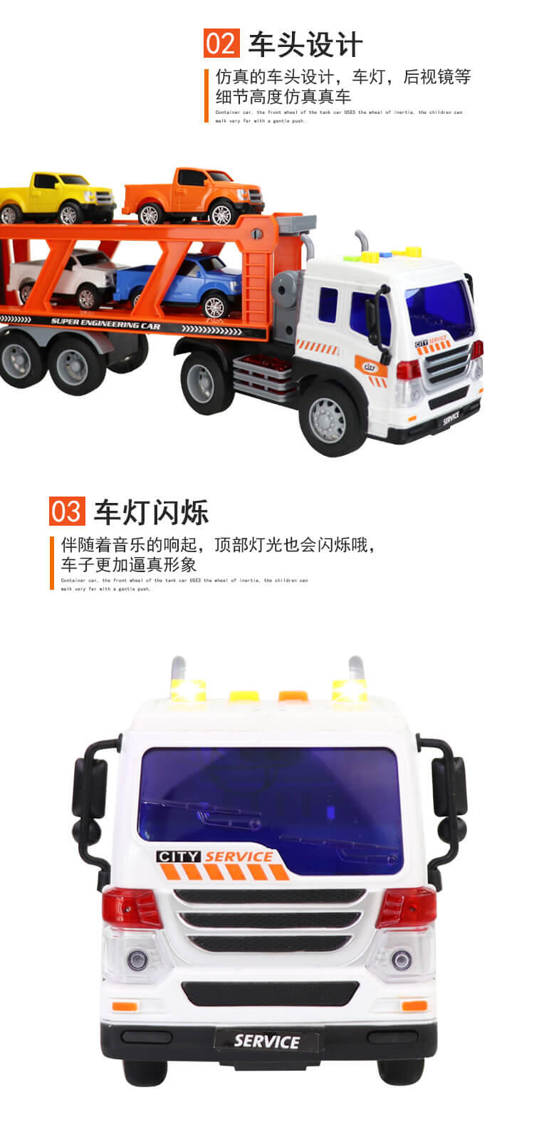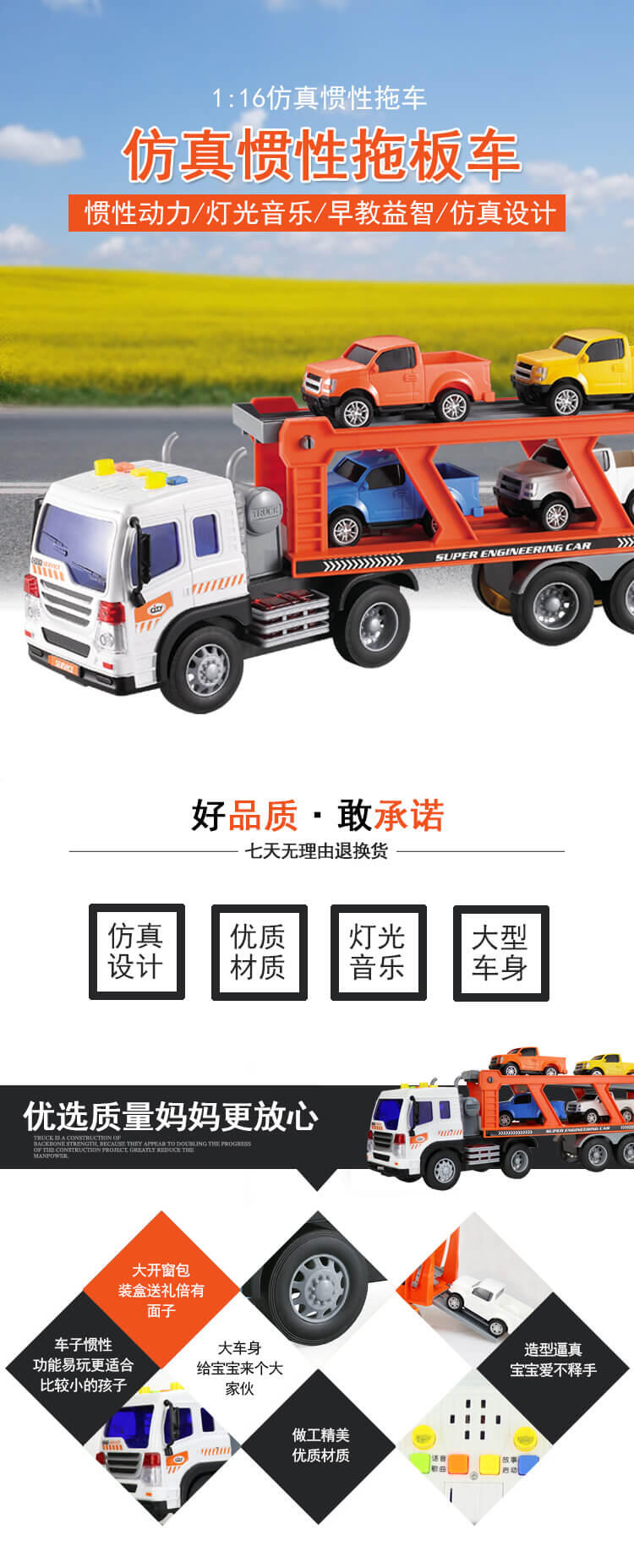 环保材质。安全,放心。拖板车的车板可以下放形成滑行跑道,随机赠送四个滑行小车,一个玩具,多种玩法,让宝宝玩耍起来爱不释手。车顶有丰富的功能按键,包括语音歌曲故事以及启动。