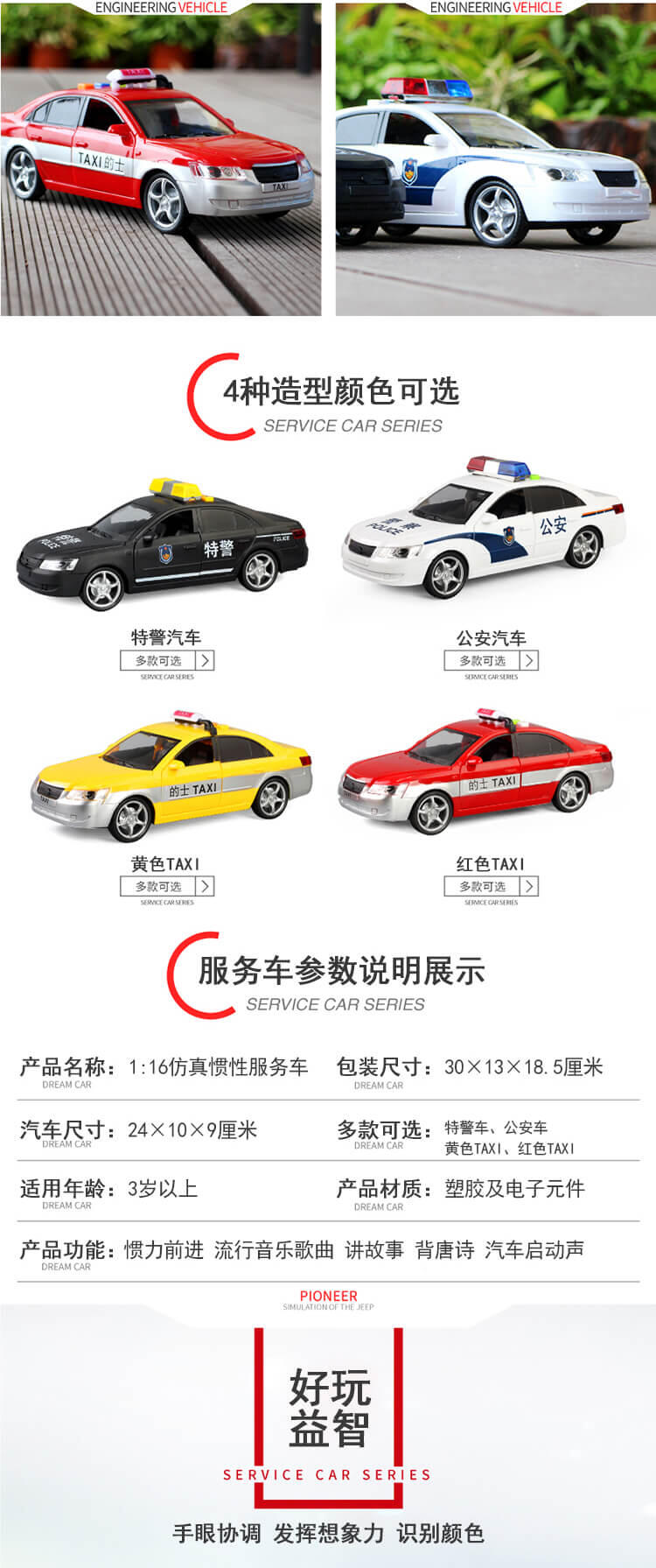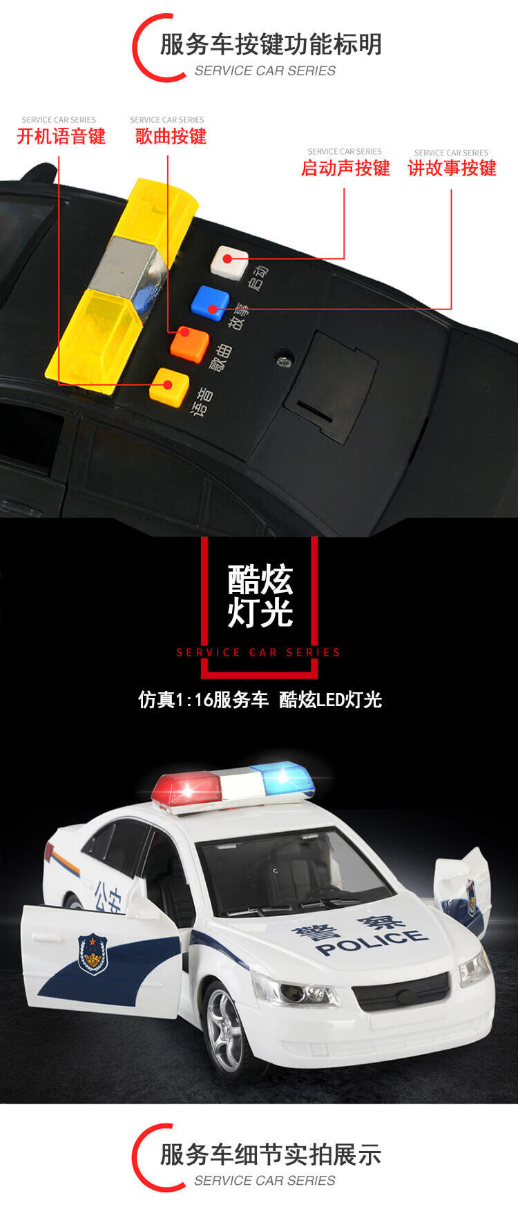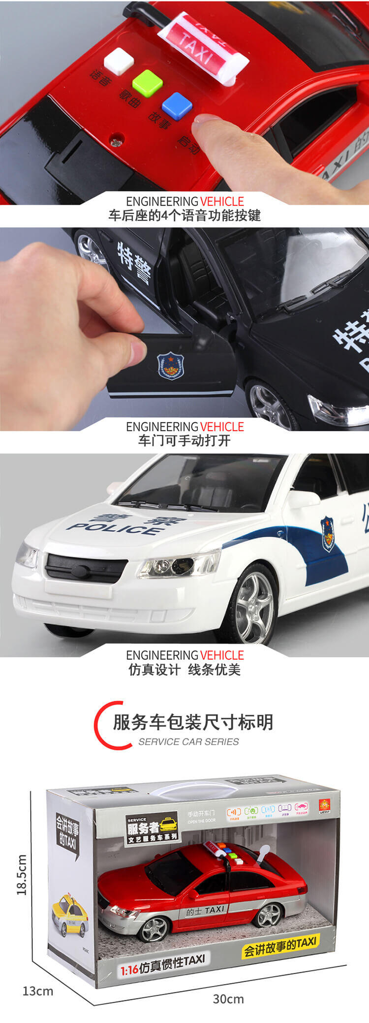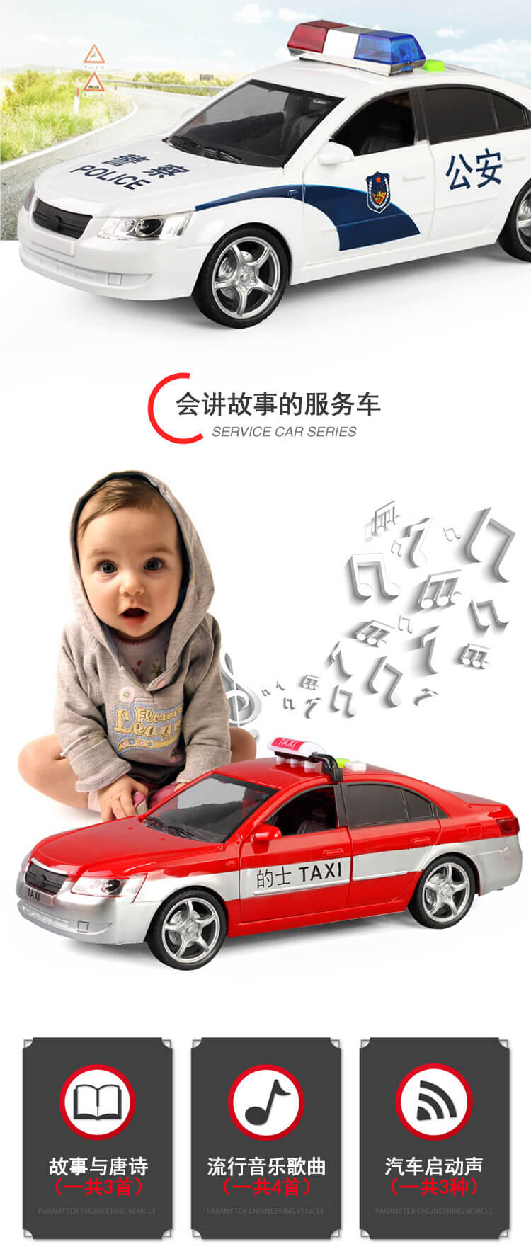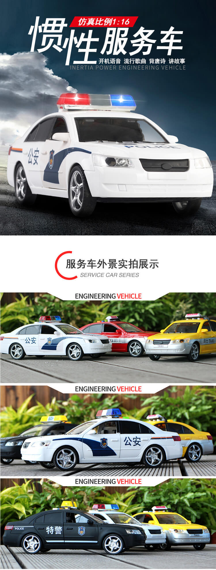 三种车型可选,益智早教双互动,带有声光音乐功能按键,仿真打造仿真警车1:16比例打造炫彩灯光,逼真警车音效。自带歌曲,故事以及启动键。惯性轮行驶。动力强,一推可行驶很远