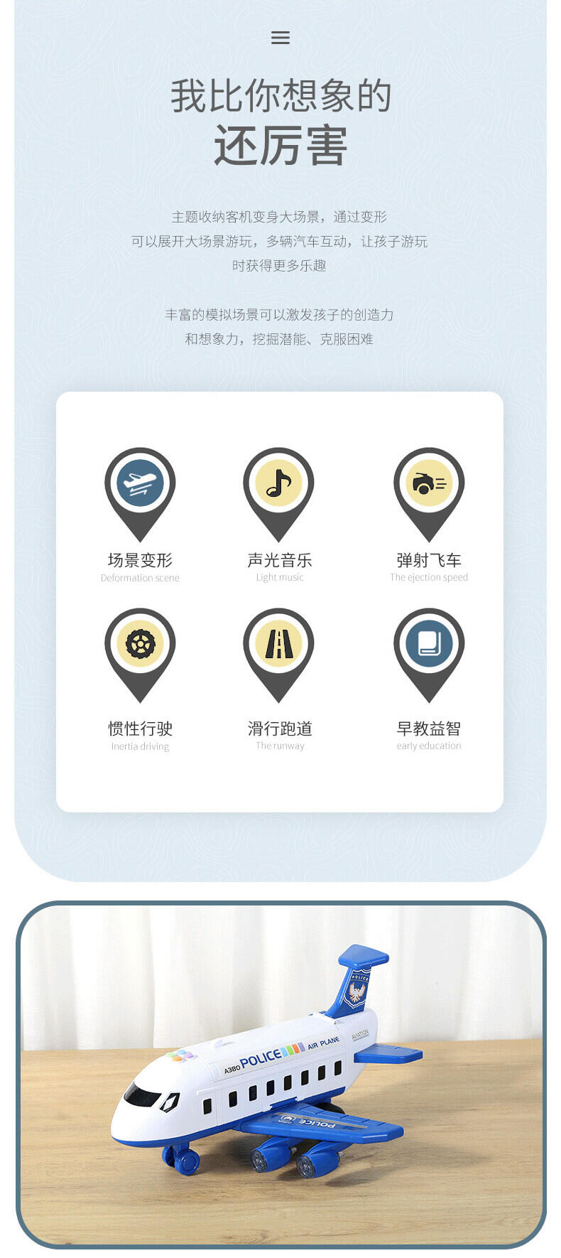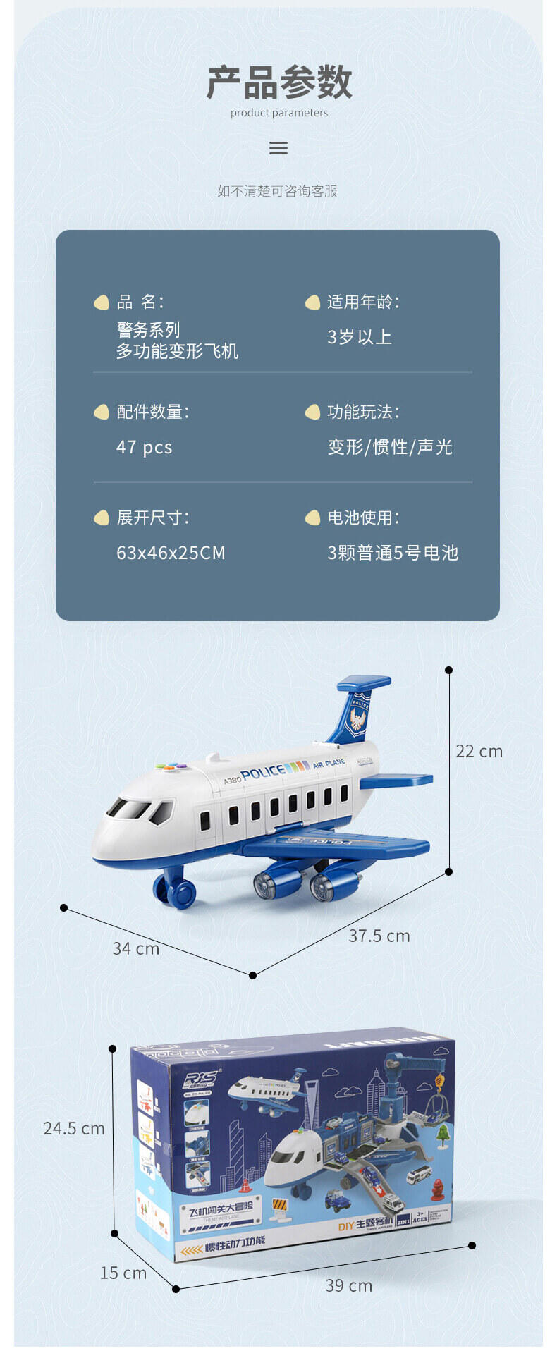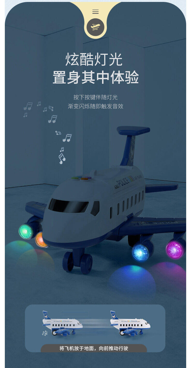 颜色 蓝/白;打开开关,玩具可播放故事,音乐,并伴有灯光,通过惯性驱使玩具飞机行驶玩耍。
