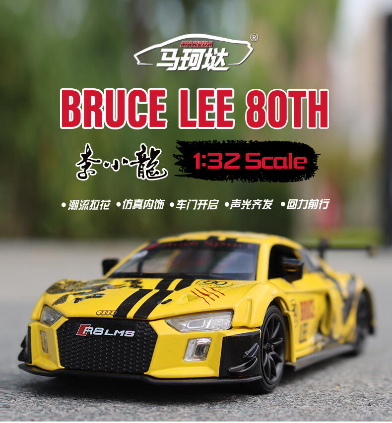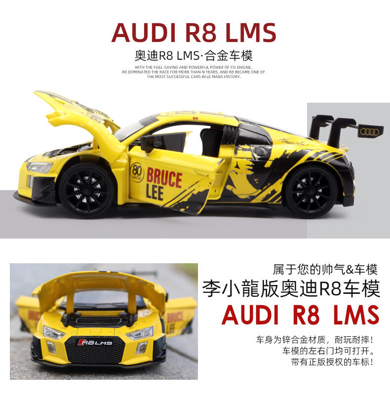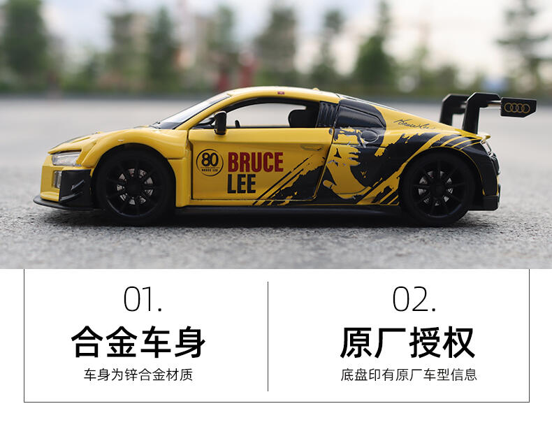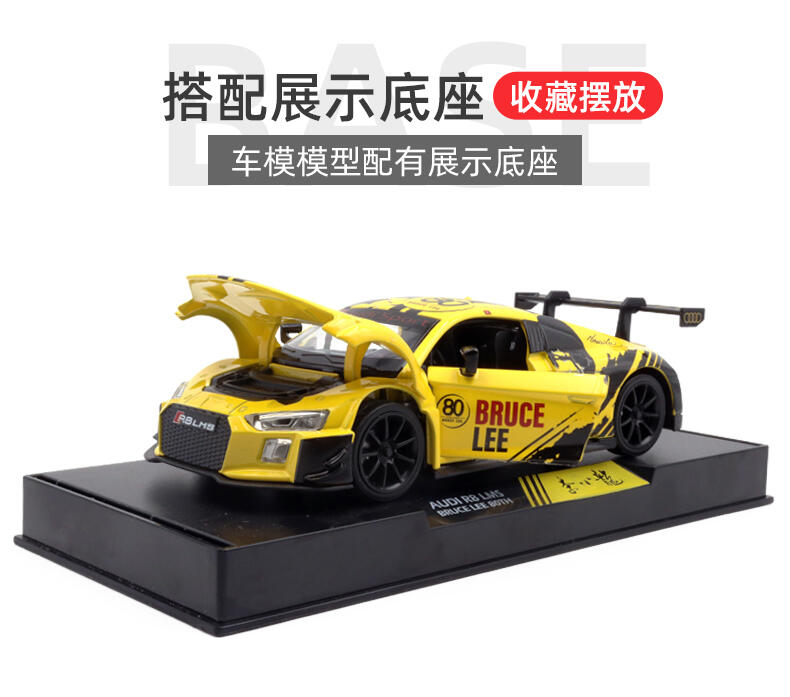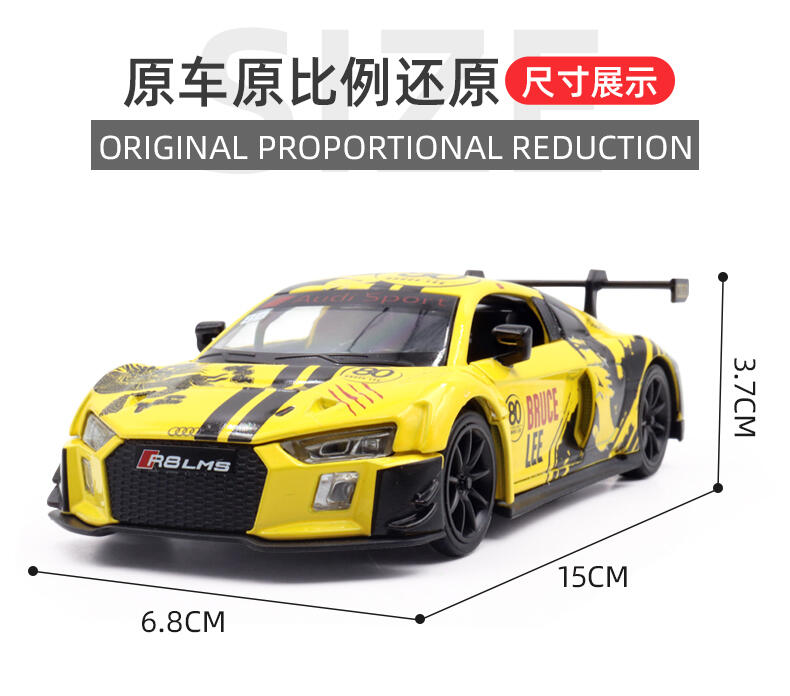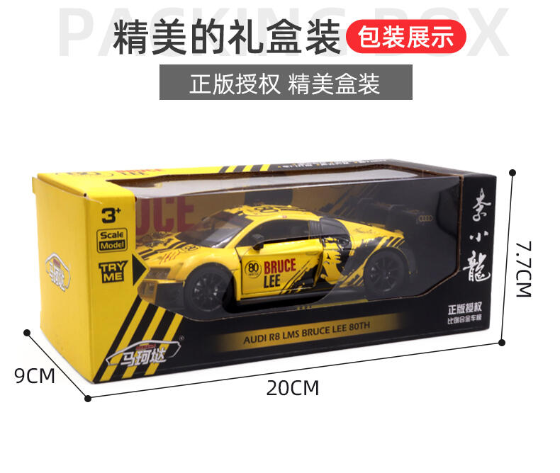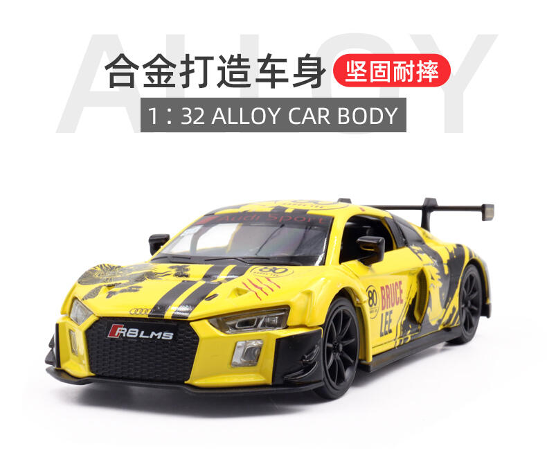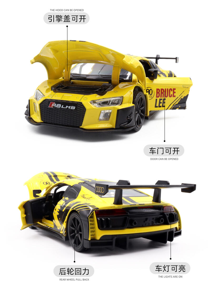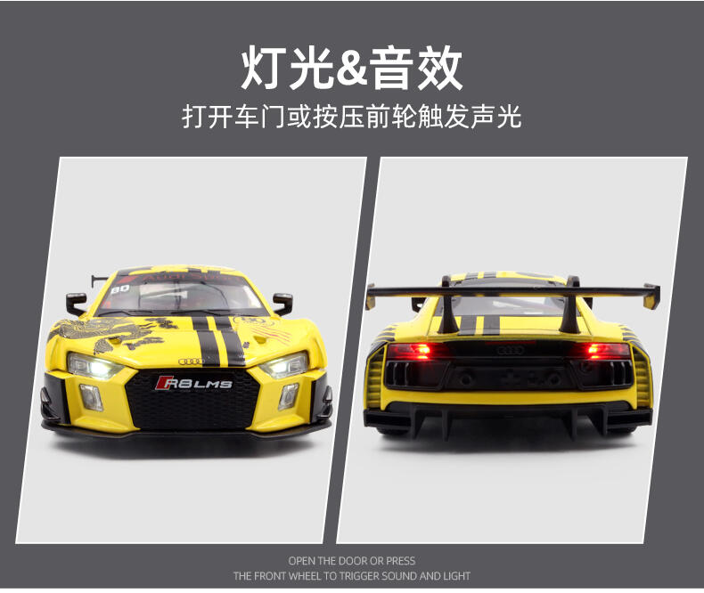 1:32合金打造车身,坚固耐摔。打开车门或按压前轮会有声光发出.