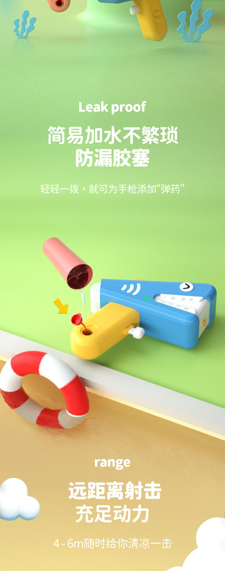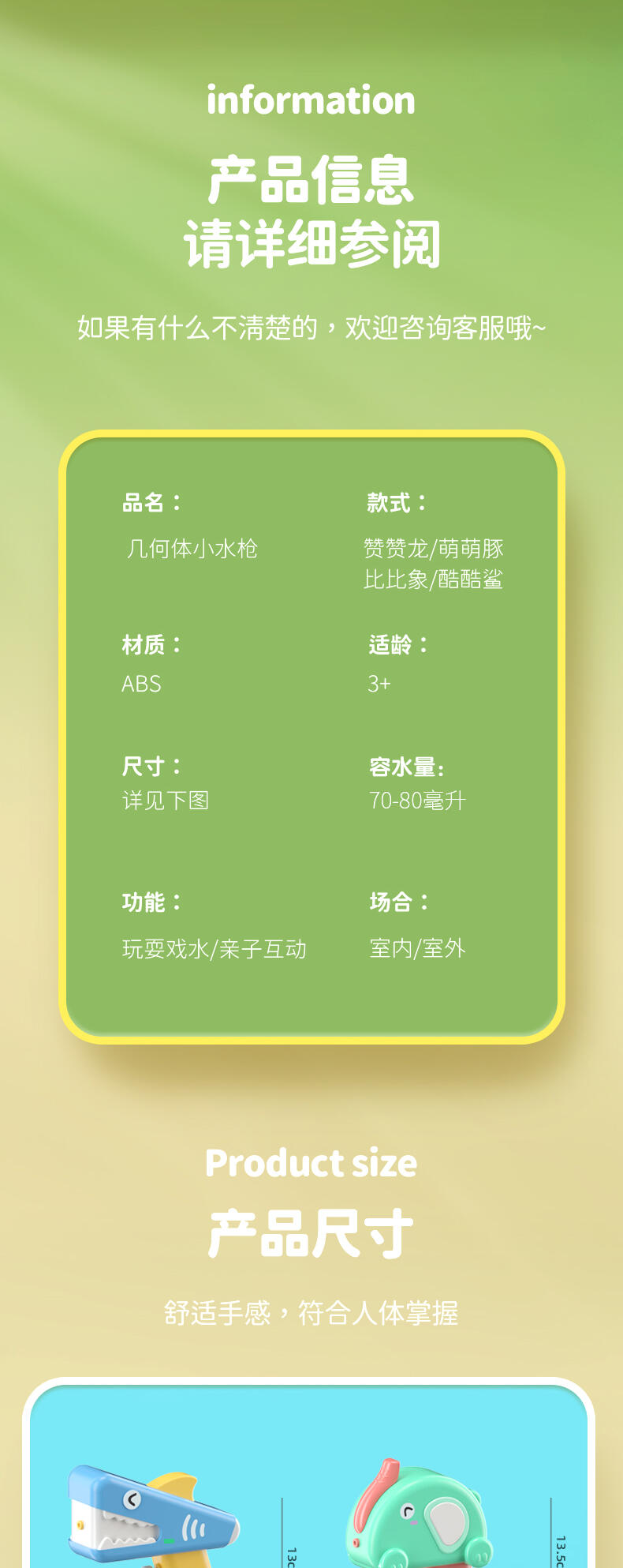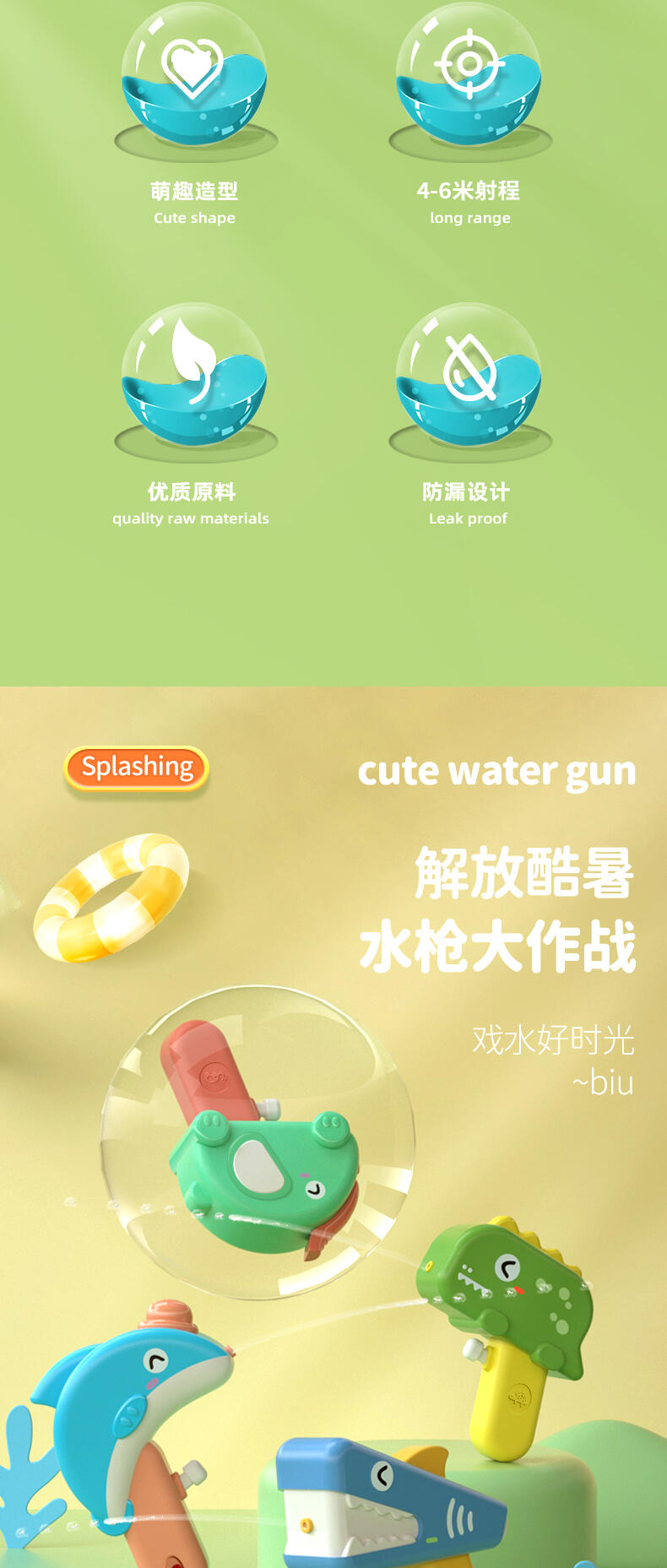 专利原创设计;装水量50ml ;迷你尺寸,方便携带;舒适按压 不手痛;边角光滑工艺;加厚密封不漏水;ABS材料 耐摔耐压;4-5米安全射程;适合:2-6岁