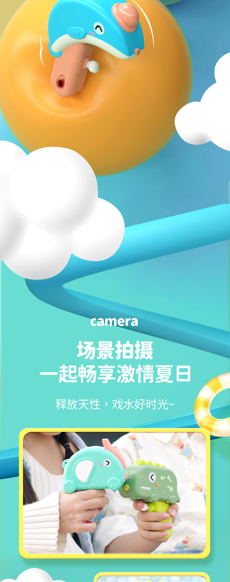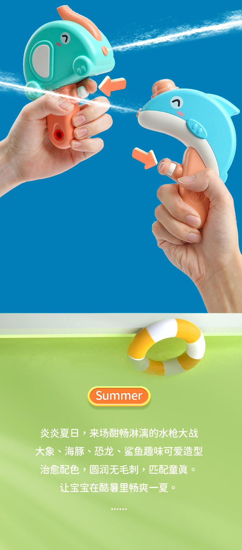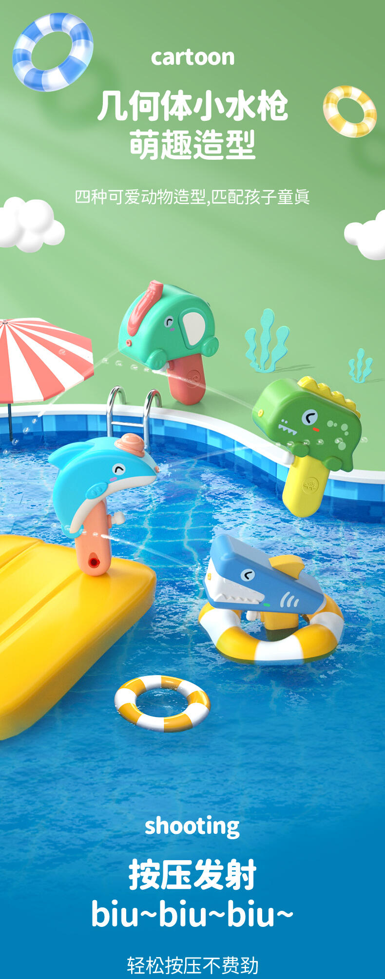 专利原创设计;装水量50ml ;迷你尺寸,方便携带;舒适按压 不手痛;边角光滑工艺;加厚密封不漏水;ABS材料 耐摔耐压;4-5米安全射程;适合:2-6岁