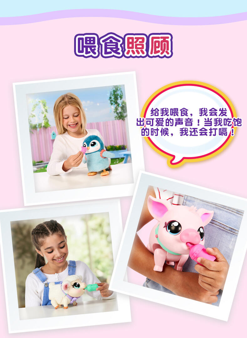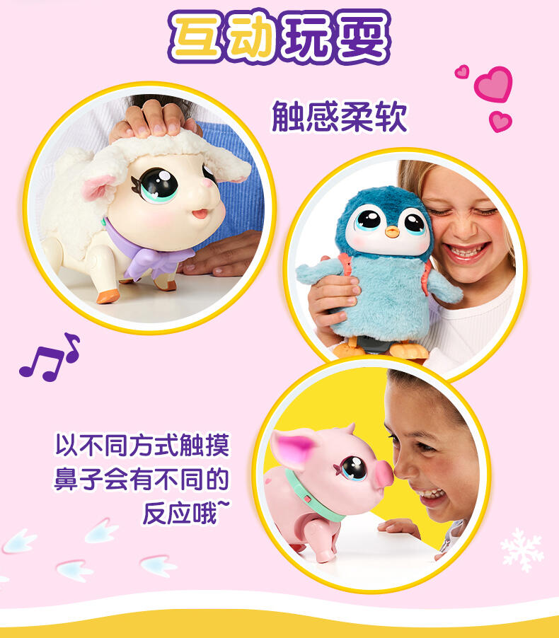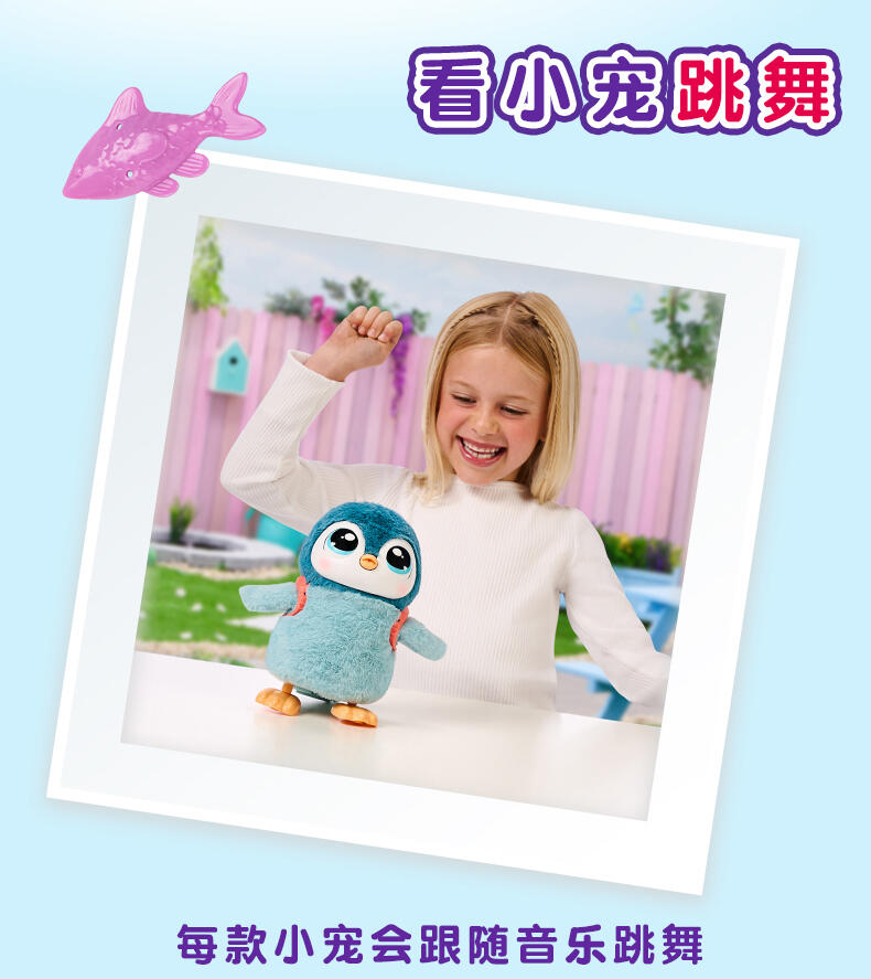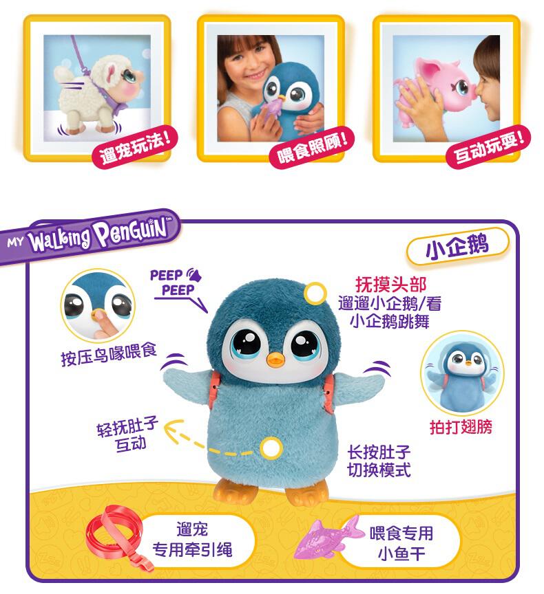 Waddles是一只全身覆盖柔软绒毛的互动式小企鹅,它动作和声音都像一只真正的小企鹅。给Waddles喂食、和它一起玩耍,然后遛着它去散步吧! 1. 超过25种声音和反应,小企鹅会叫会走路还会拍打翅膀 2. 有趣的遛宠玩法 3. 跳舞模式:小企鹅会跟着音乐“跳舞” 3. 传统照顾玩法:可以照顾和喂食,摸摸小企鹅的肚子和它互动吧