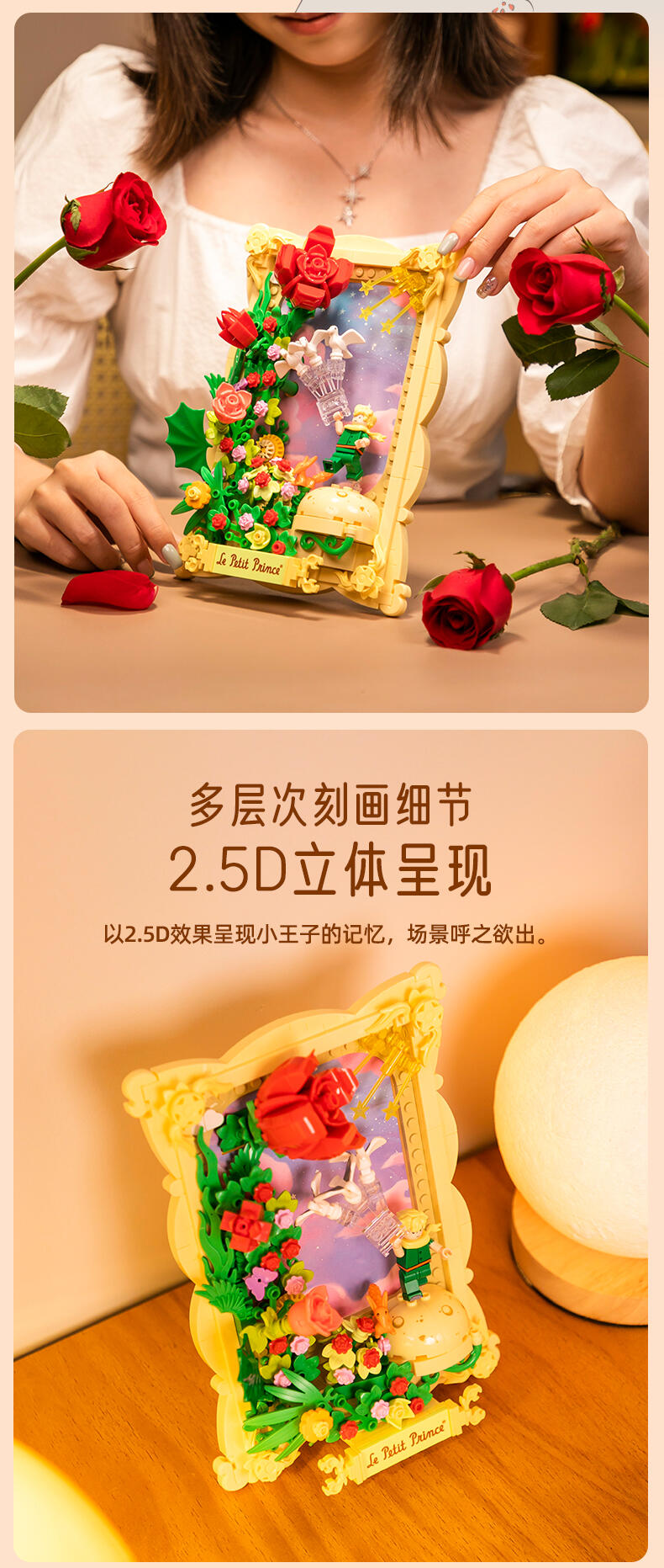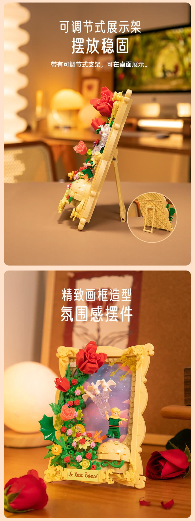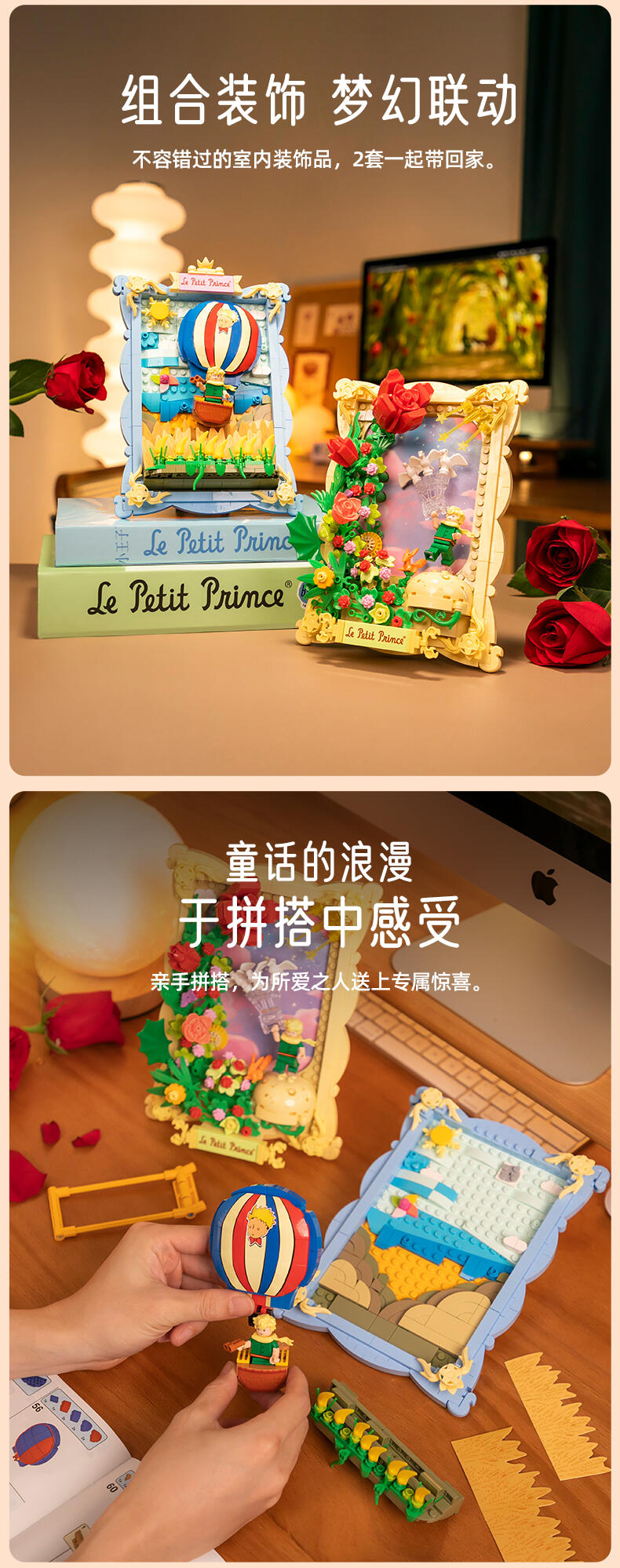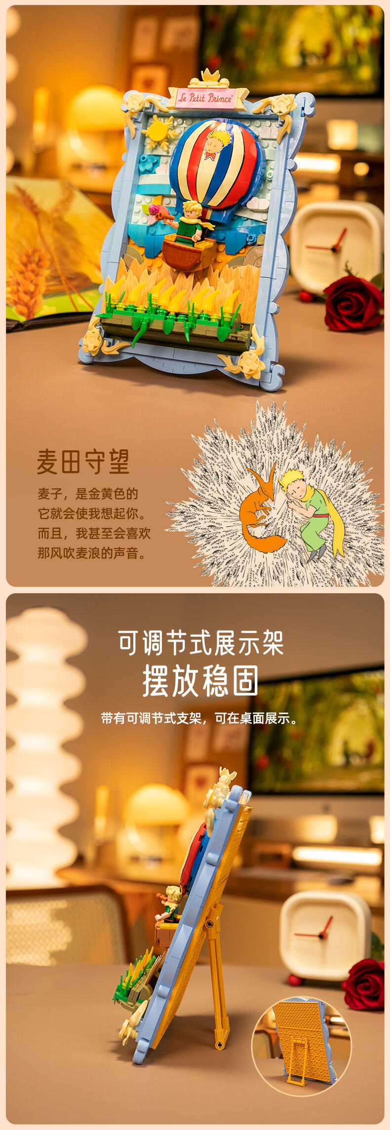 多层次刻画细节,以2.5D的立体效果呈现小王子的记忆,场景呼之欲出,可调节稳定展示架,支持摆放功能,不容错过的拼搭装饰,亲手拼搭,为爱人送上专属惊喜