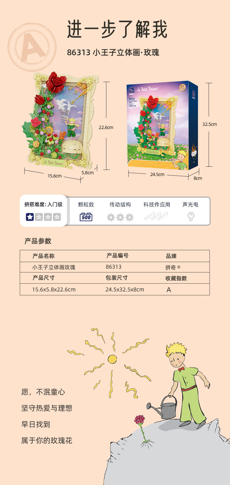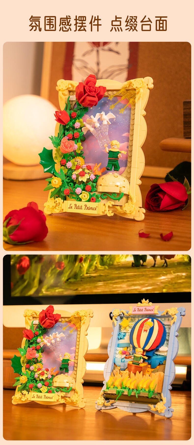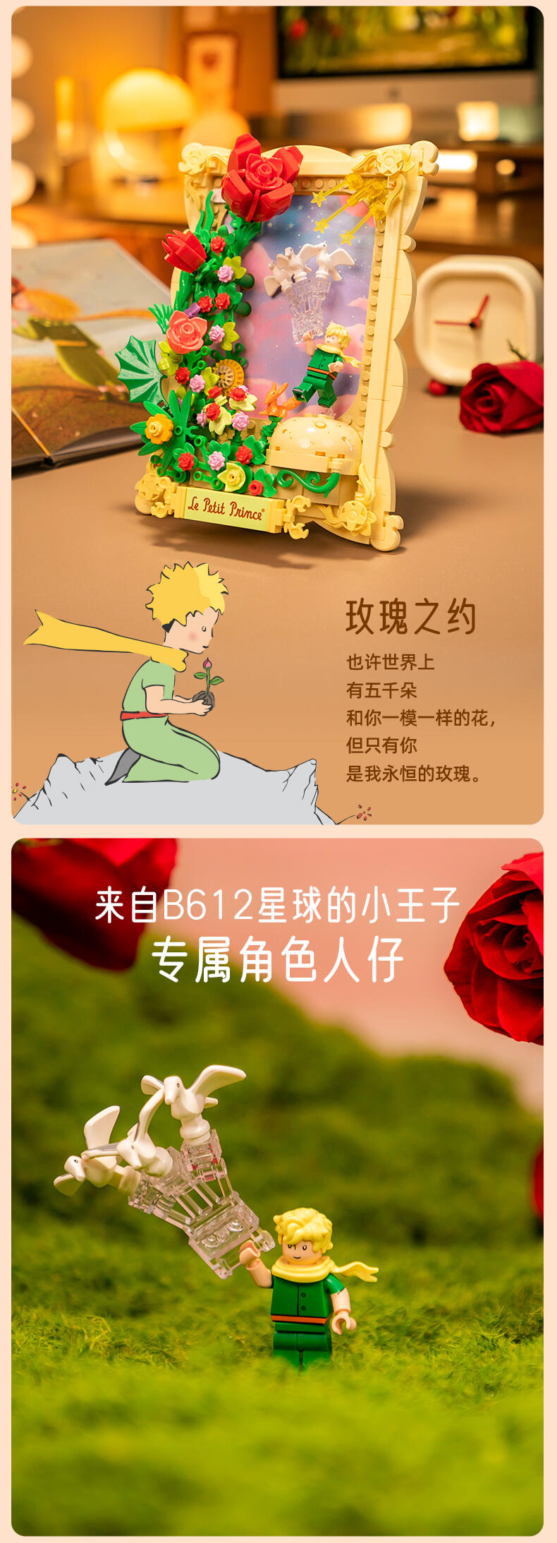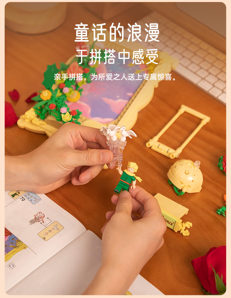 多层次刻画细节,以2.5D的立体效果呈现小王子的记忆,场景呼之欲出,可调节稳定展示架,支持摆放功能,不容错过的拼搭装饰,亲手拼搭,为爱人送上专属惊喜