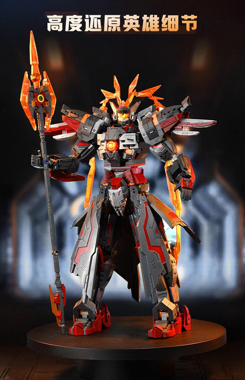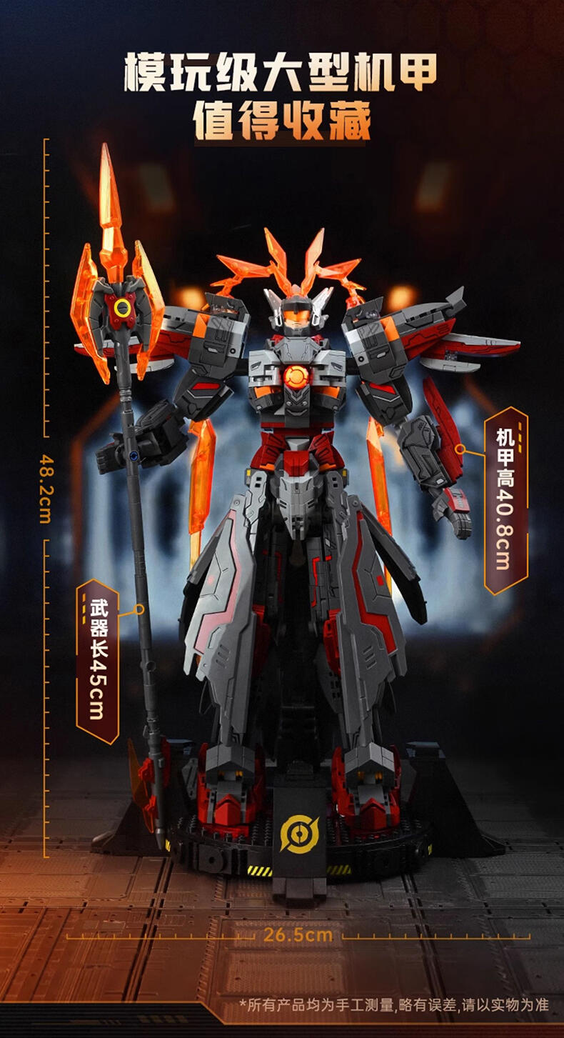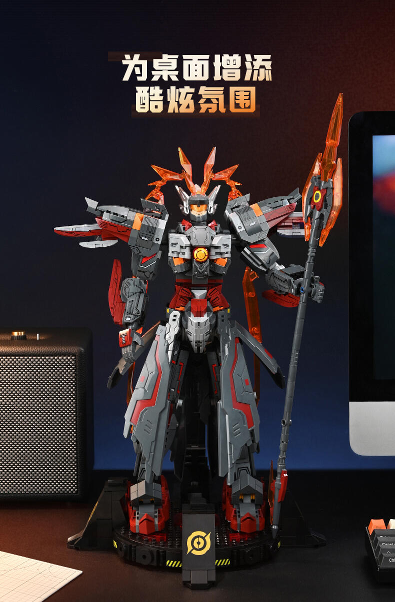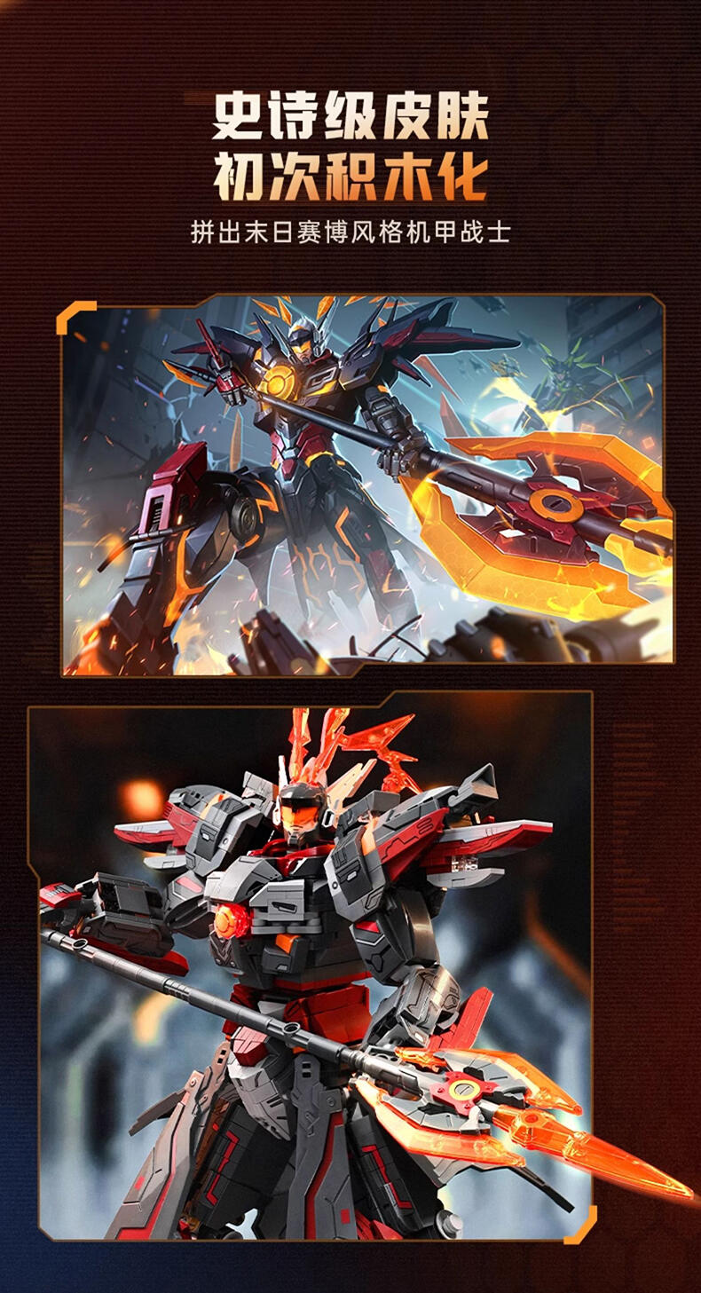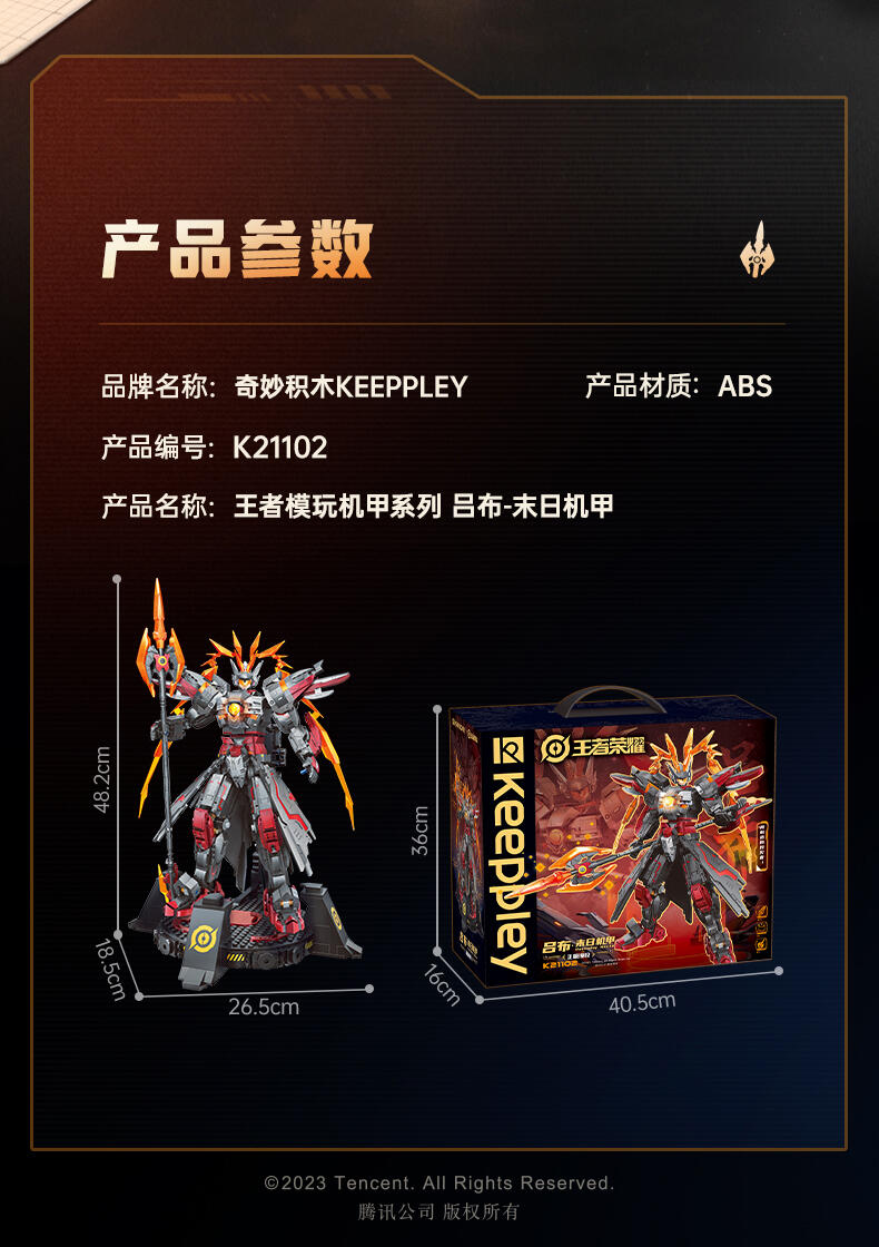 角色原型为三国名将吕布,有“三英战吕布”的历史典故,皮肤设定为暴走的魔神机甲。身着金属战甲,散发橙色光芒,手持方天画戟,酷炫的机械元素与满满的科技感相融合。 正版授权,还原人气机甲皮肤 大尺寸造型,霸气全开 大零件拼装,丝滑拼搭 英雄专属大武器,还原英雄气概 超强可动,重现英雄战斗姿势