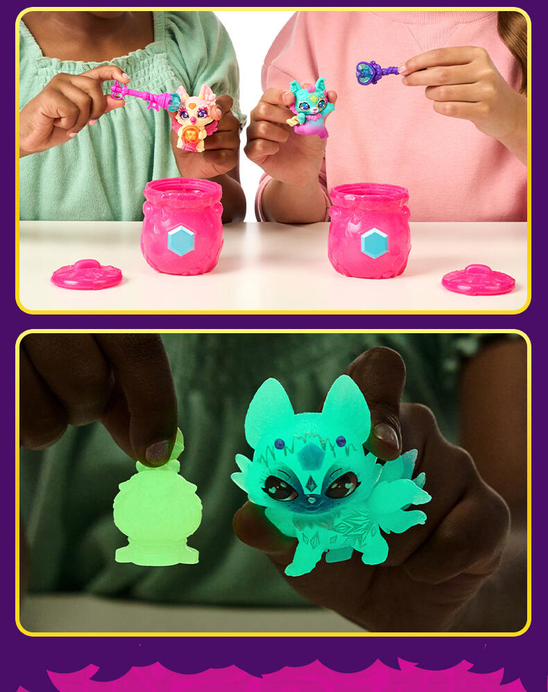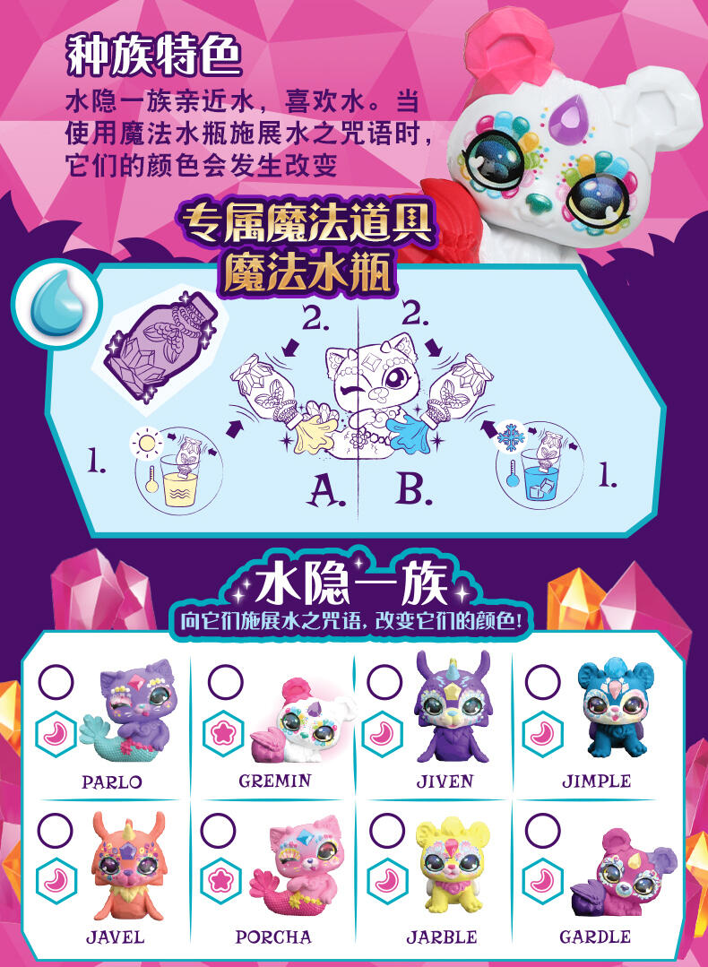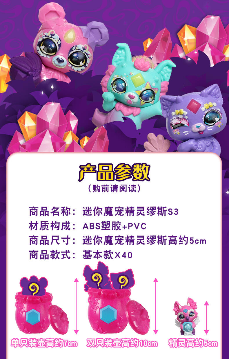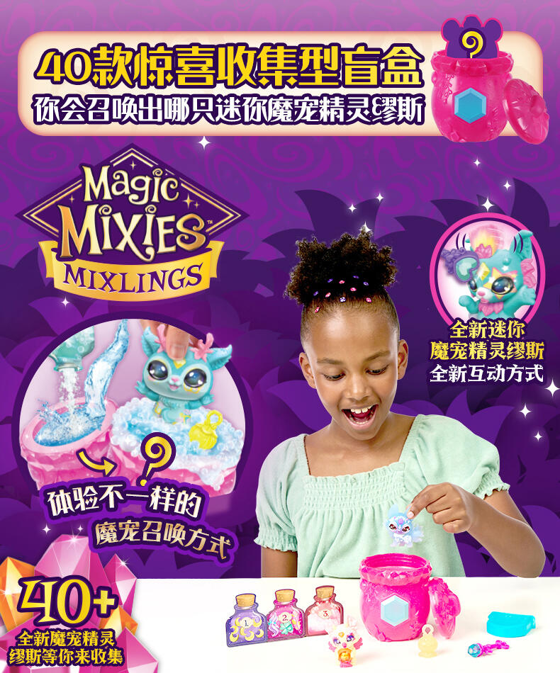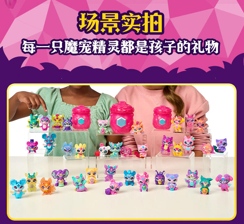 迷你魔宠精灵缪斯与魔宠精灵缪斯同属一个家族! 两只装共有40款迷你魔宠精灵缪斯可供收集 (每只都来自不同的魔法族群)。只需加入神奇的药水配料,就能召唤出其中两款迷你魔宠精灵缪斯!然后,使用壶中附带的魔法道具来让迷你魔宠精灵缪斯展示它的魔力!
