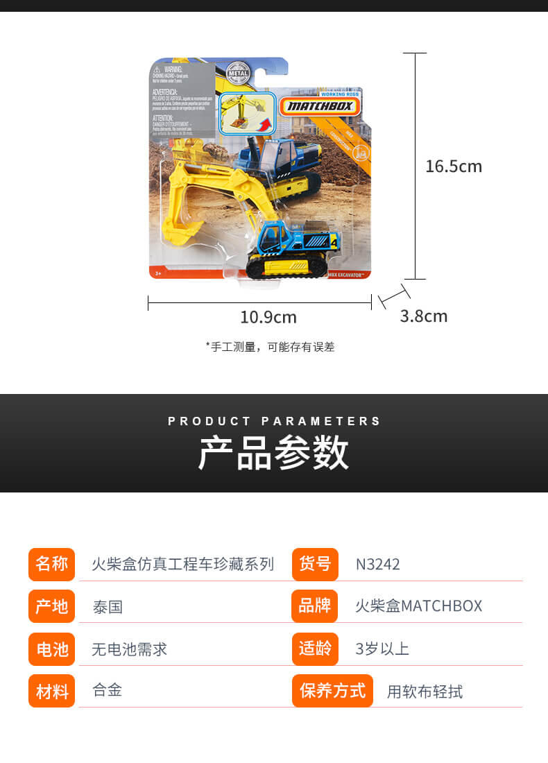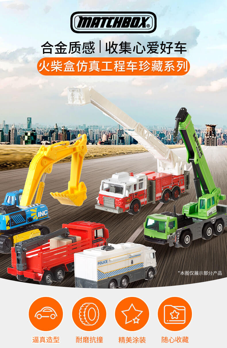 玩和收集!保留颜色和设计的变化。不适用于所有火柴盒套件。所有款式均单独出售。适合3岁以上儿童。包含带有运动部件的大型车辆。儿童和收藏家的乐趣。