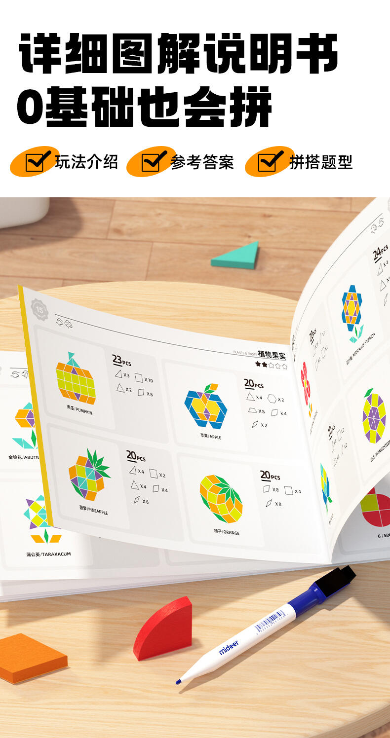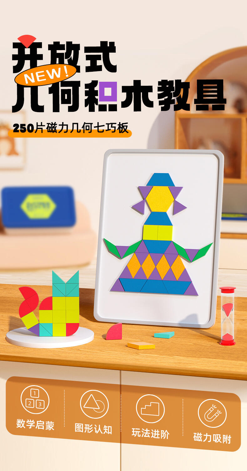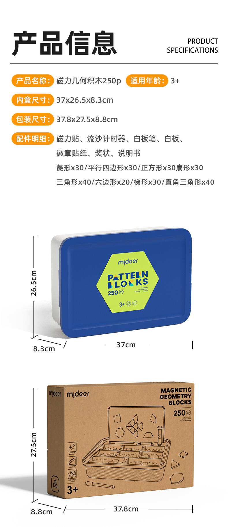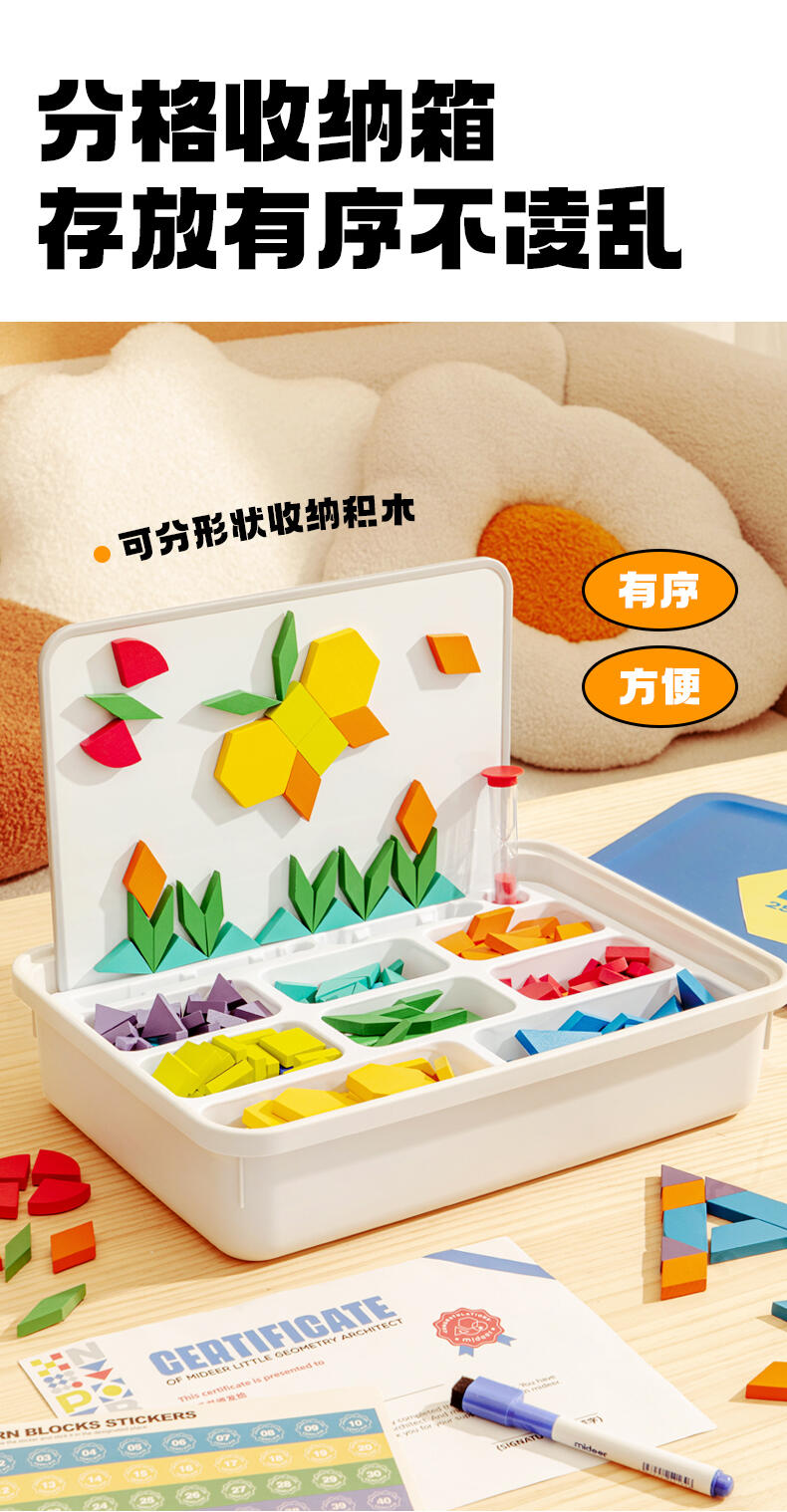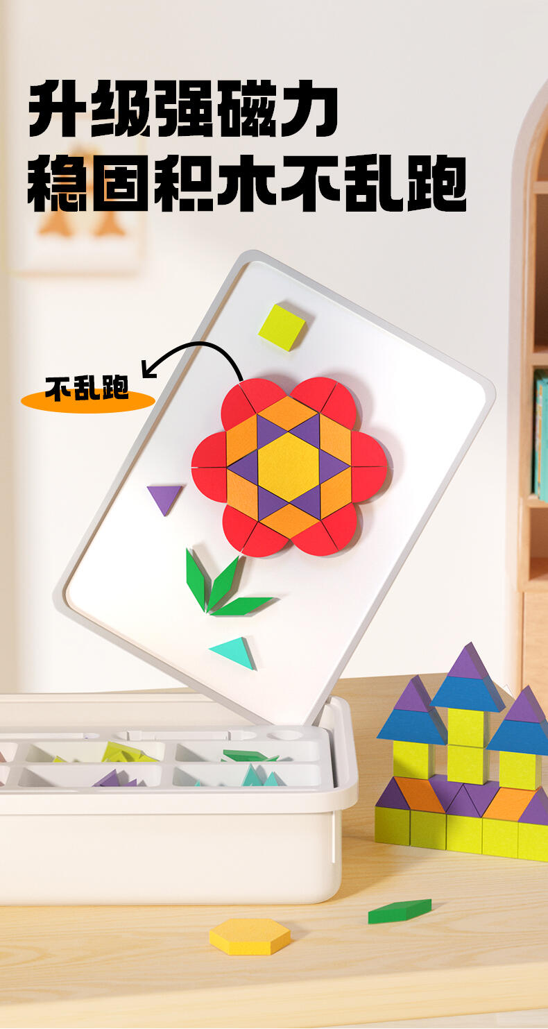 | 足足250片,各种图案都能拼,提供进阶玩法,由简到难做引导。1:1磁力贴,稳固积木不乱跑。360°打磨,每一块都光滑。白板+白板笔,在家就能做早教,分格收纳箱,存放有序不凌乱 |