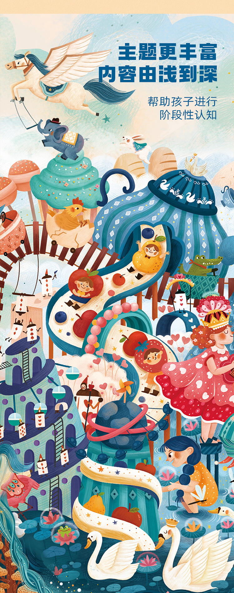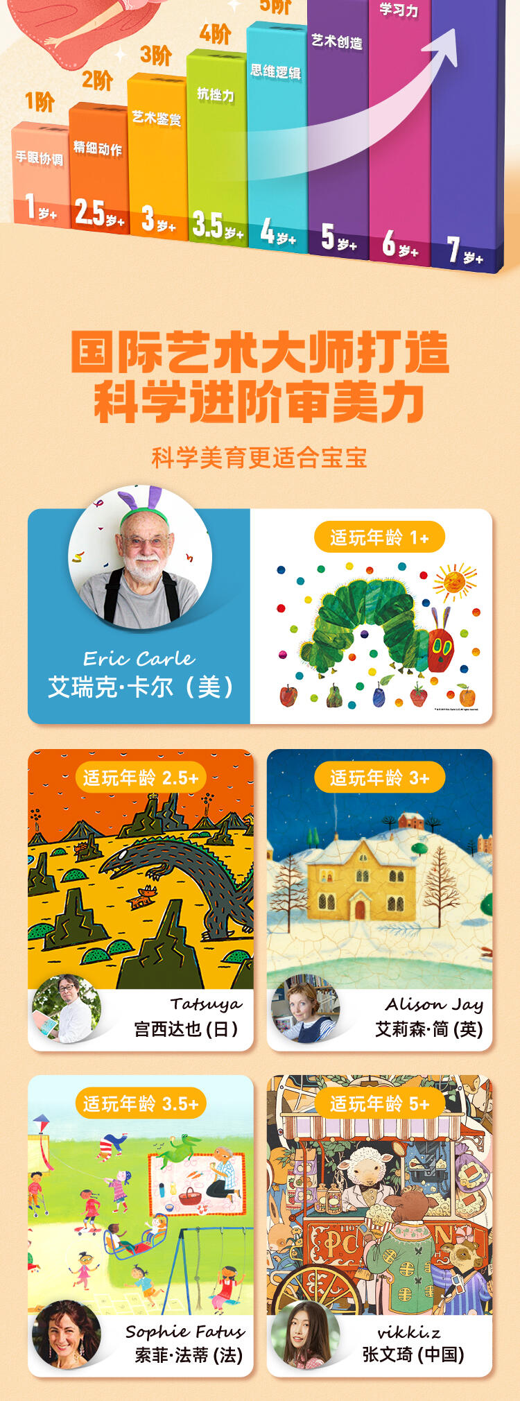 2)内容从简到繁,匹配认知规律根据宝宝各个阶段的认知水平,进阶式美育拼图里的插画。内容从单一的动物到更宏伟的场景,一步步提升孩子的认知力。贴合孩子心理的插画风格,让孩子在美的熏陶下开展大脑的思维活动。