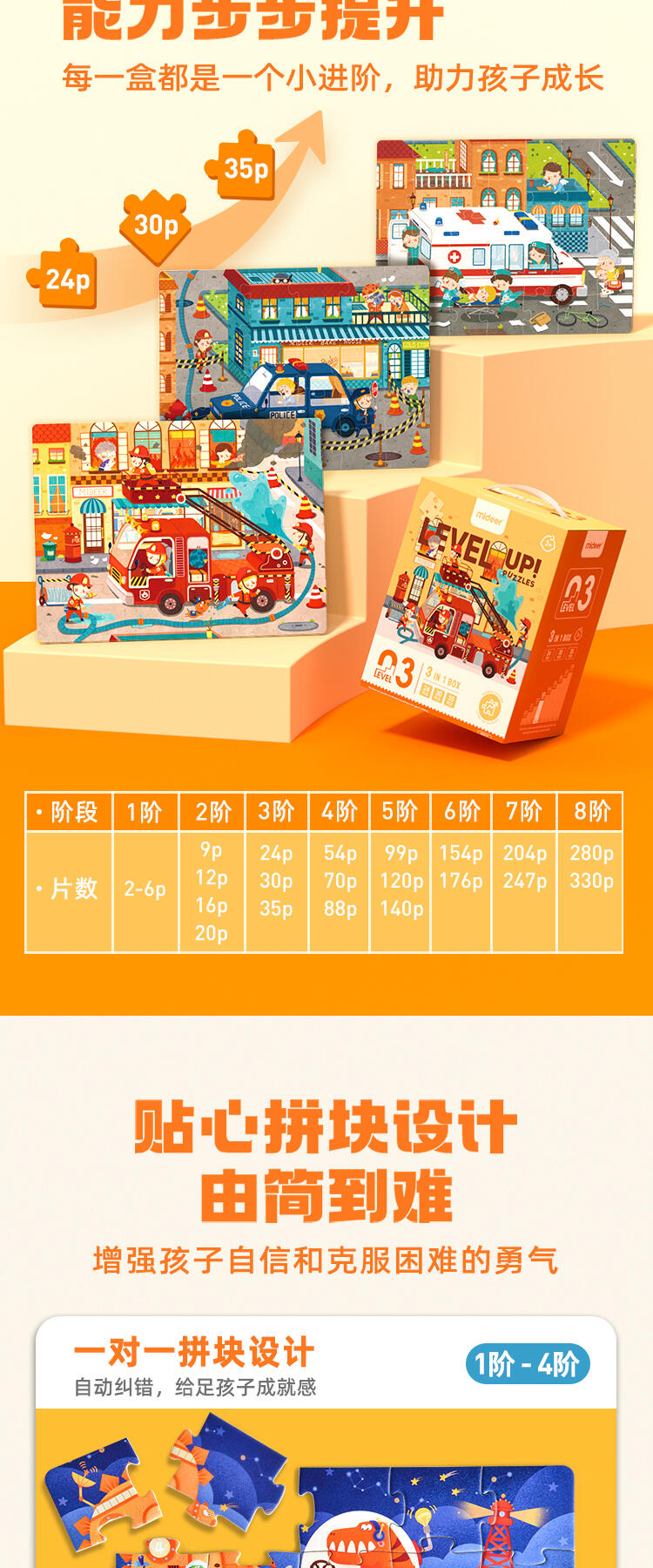1)国际教育专家科学定制,拼块数量逐级递增,满足每个孩子在不同阶段的块数需求。适合1~7岁全年龄段,逐步培养逻辑思维力。