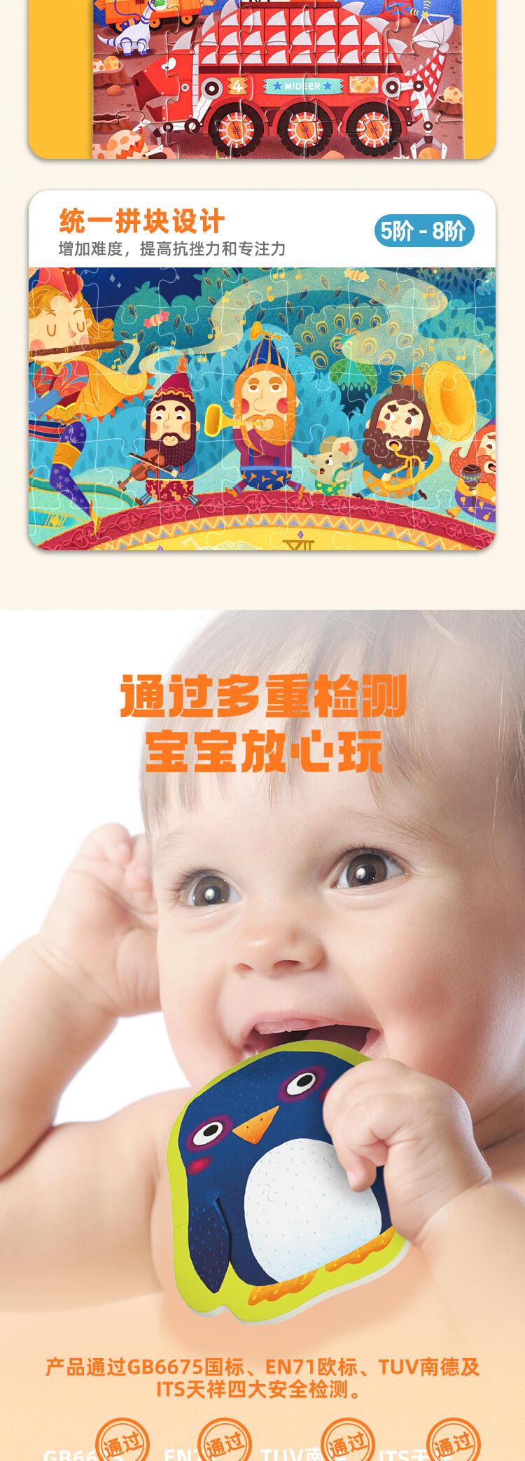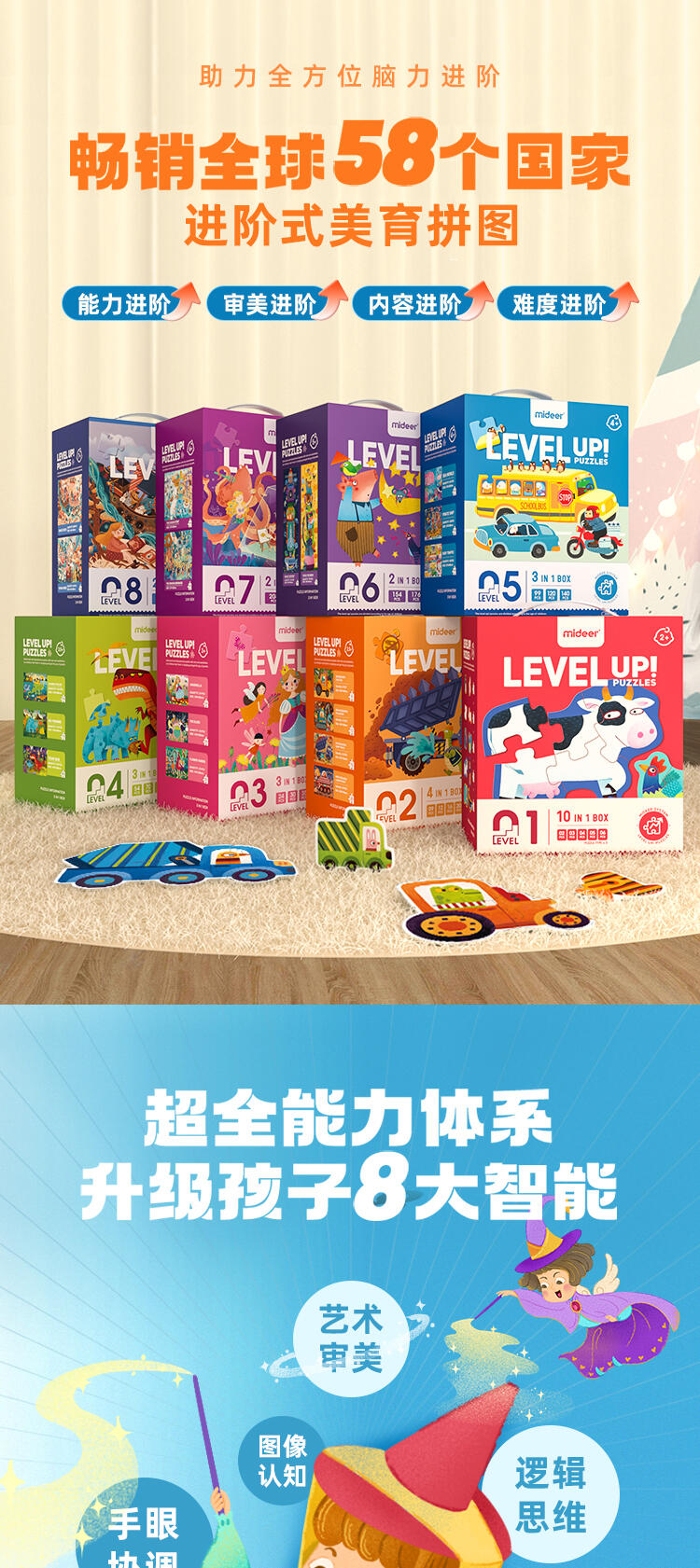 2)内容从简到繁,匹配认知规律根据宝宝各个阶段的认知水平,进阶式美育拼图里的插画。内容从单一的动物到更宏伟的场景,一步步提升孩子的认知力。贴合孩子心理的插画风格,让孩子在美的熏陶下开展大脑的思维活动。