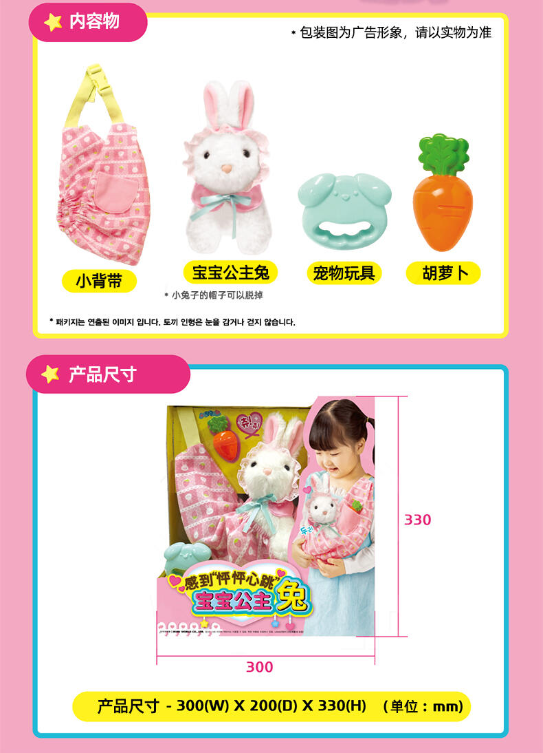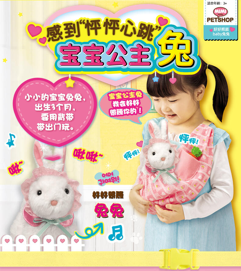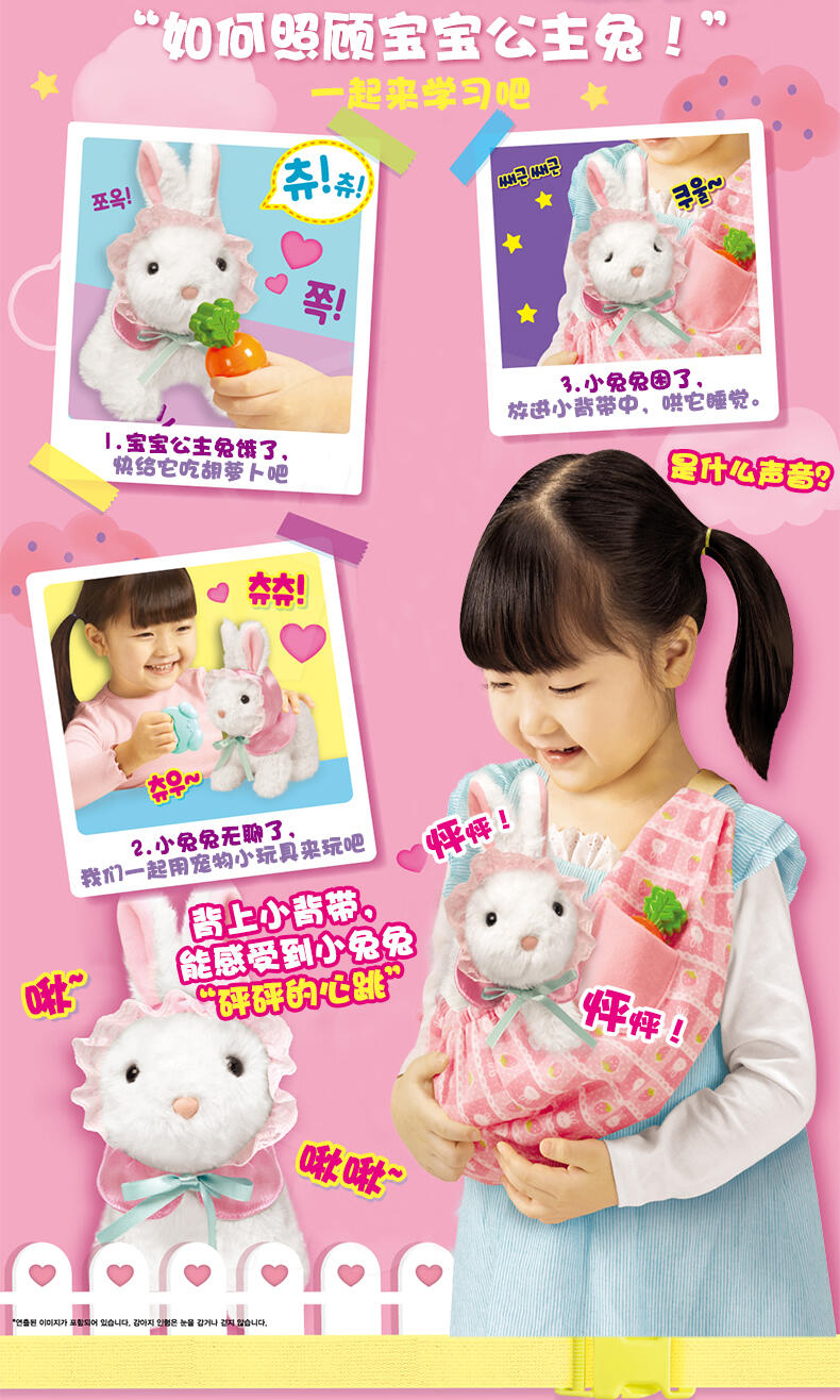 宝宝公主兔形态模拟仿真真实白色兔子,让小朋友体验照顾小动物,提升小朋友的爱心。宝宝公主兔的心脏可以怦怦跳的震动。