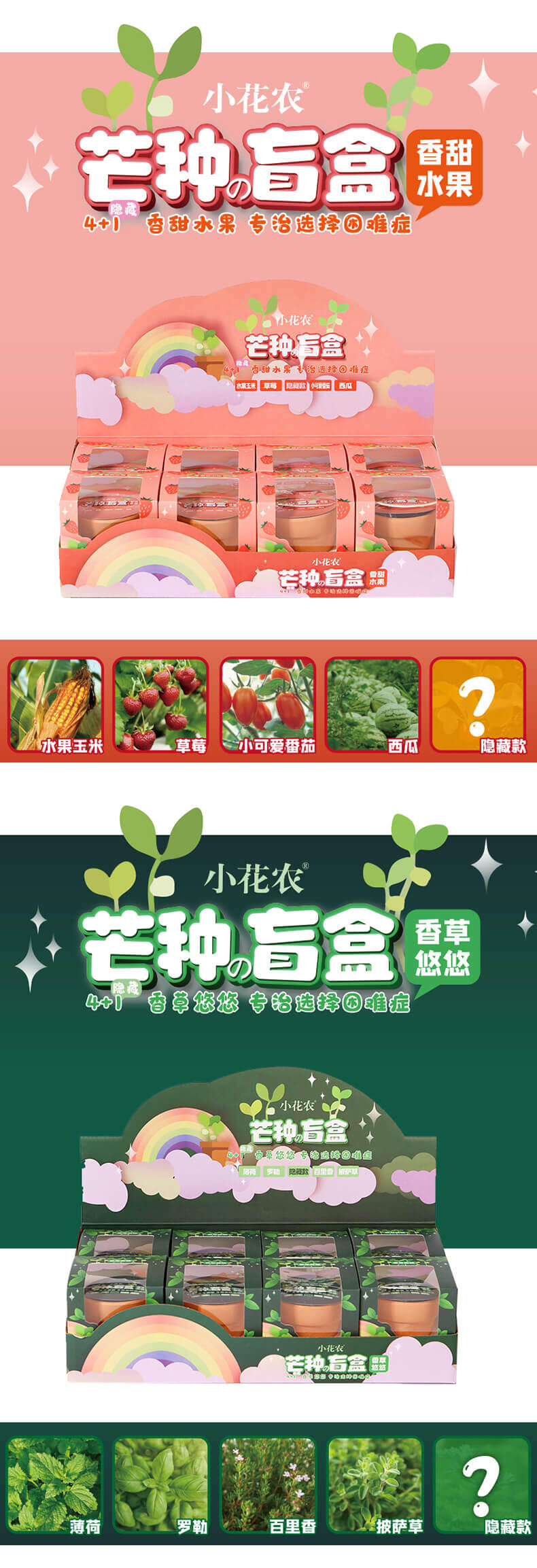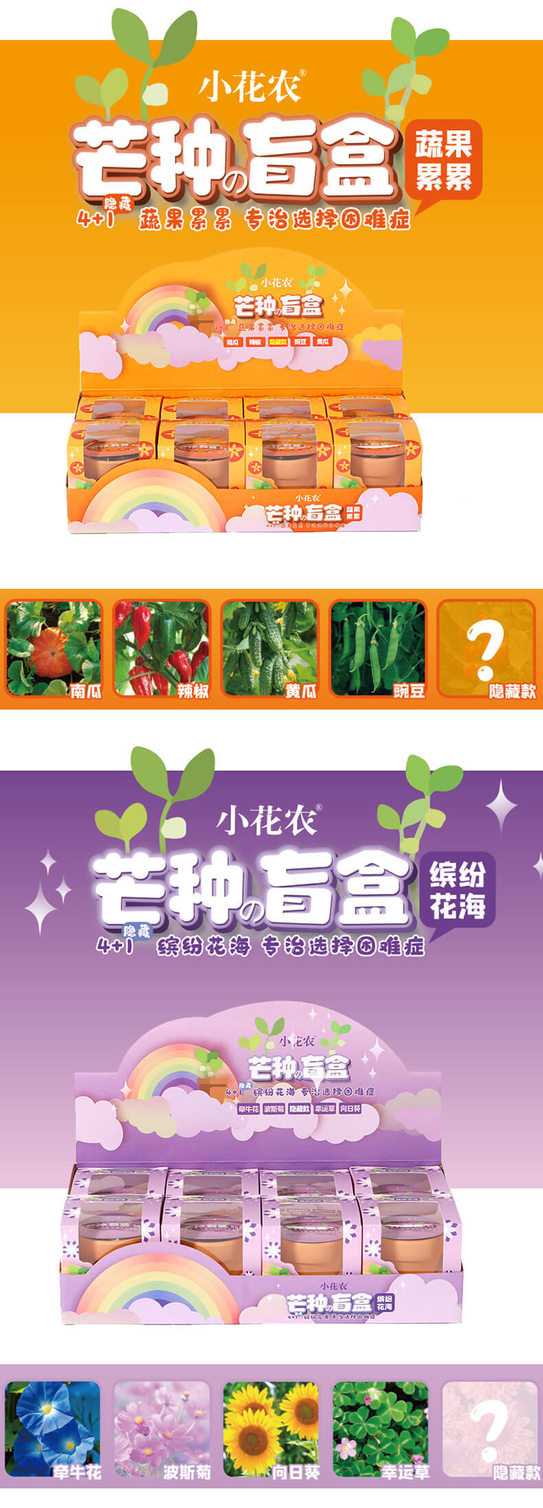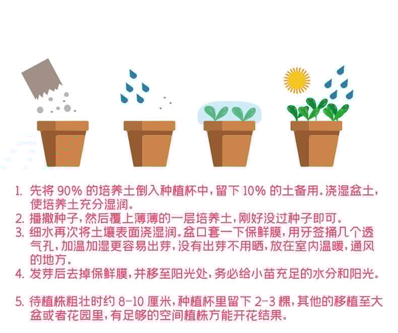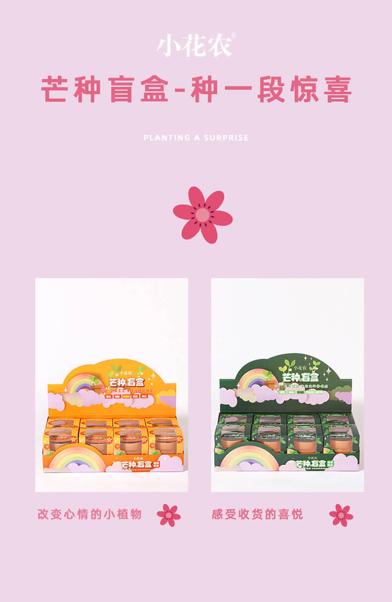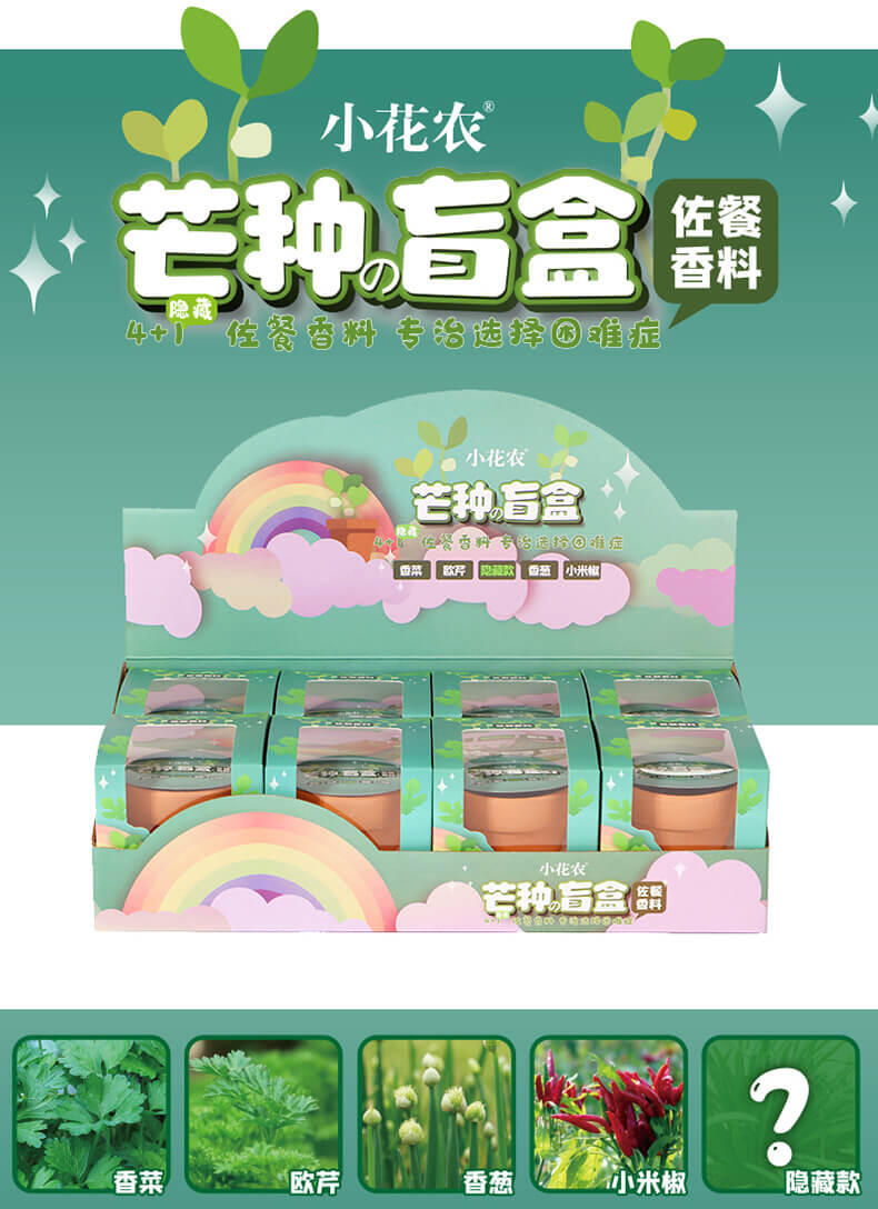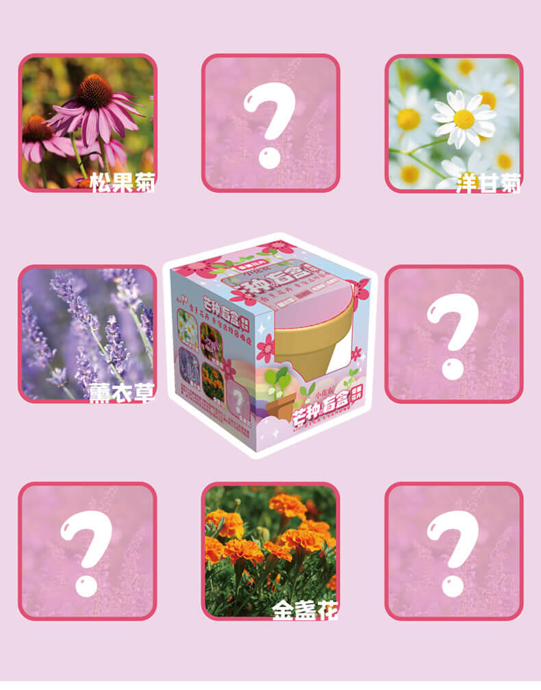 产品里面配件齐全,种子发芽率高,易种植发芽,产品花品种多样化,分蔬果、花卉、香料等总有6个系列,盲盒装,没有明确表示是哪一个花种,待种子发芽后才知道,自带彩盒展示,包装外观色泽鲜艳,种子丰富,可选性大,发芽率90%以上.