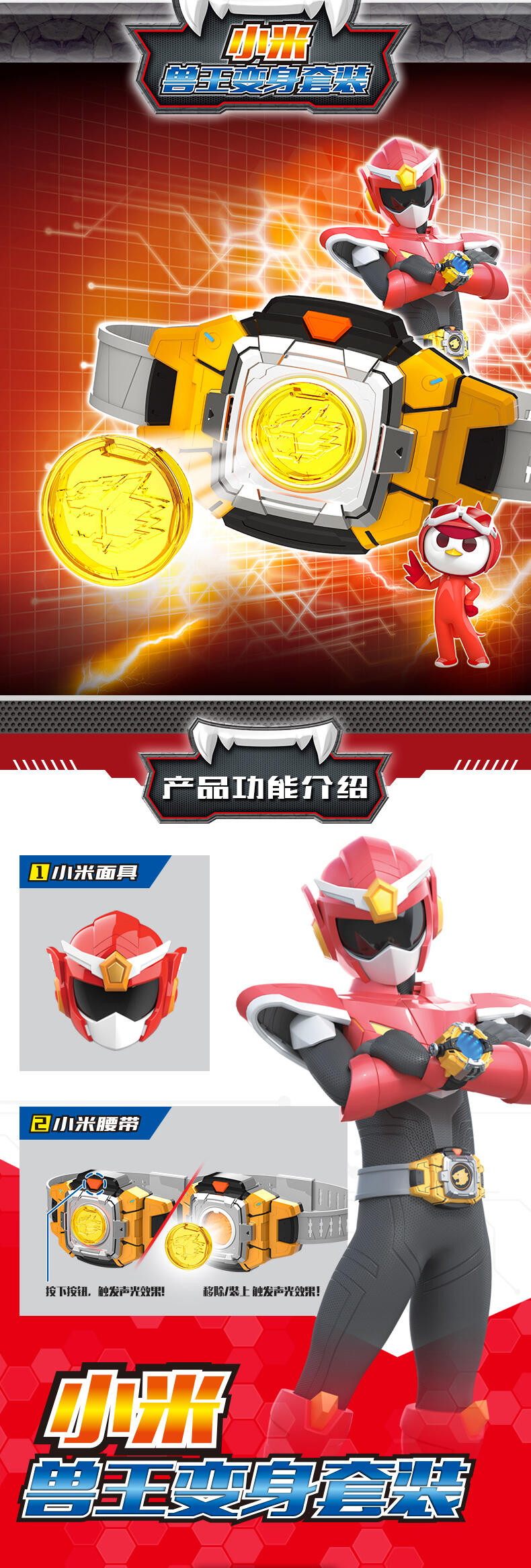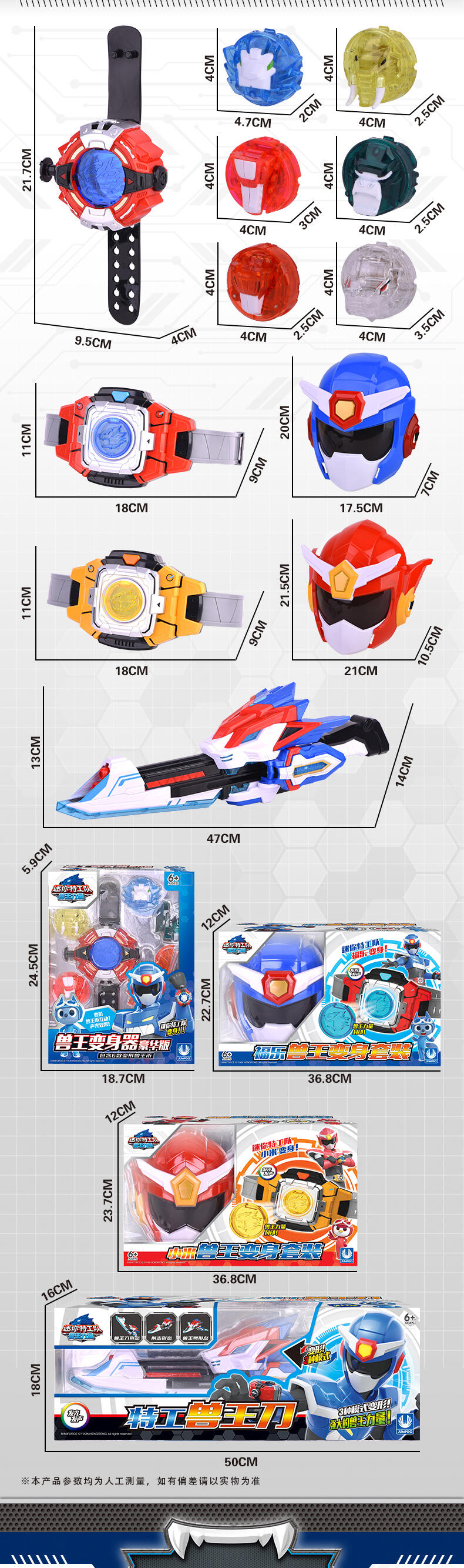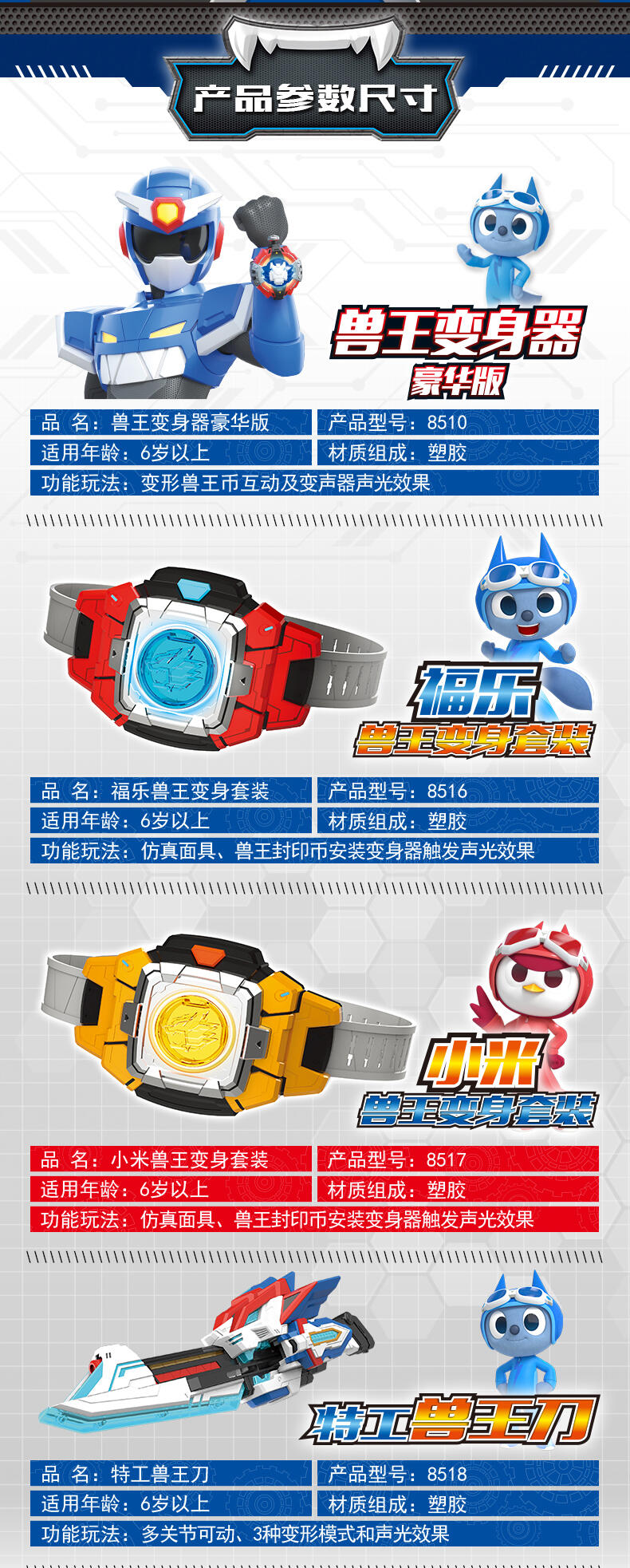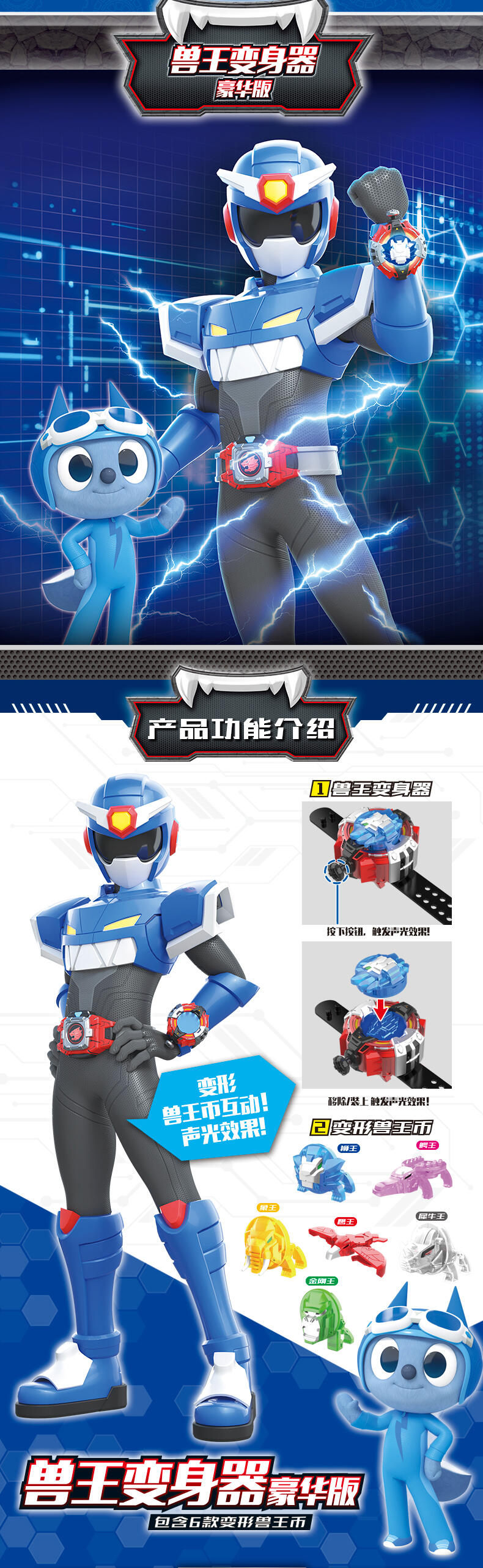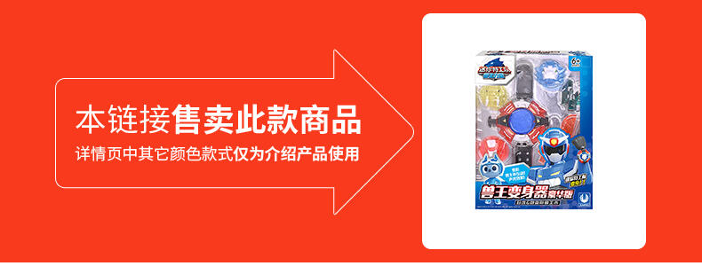 1.迷你特工队-兽王力量专属变身器; 2.兽王币装入变身器中,按键有声光效,模拟剧中兽王力量变身的场景; 3.包装内6枚兽王币,各自有单独的变形功能,可以变形成各自的兽王形态。
