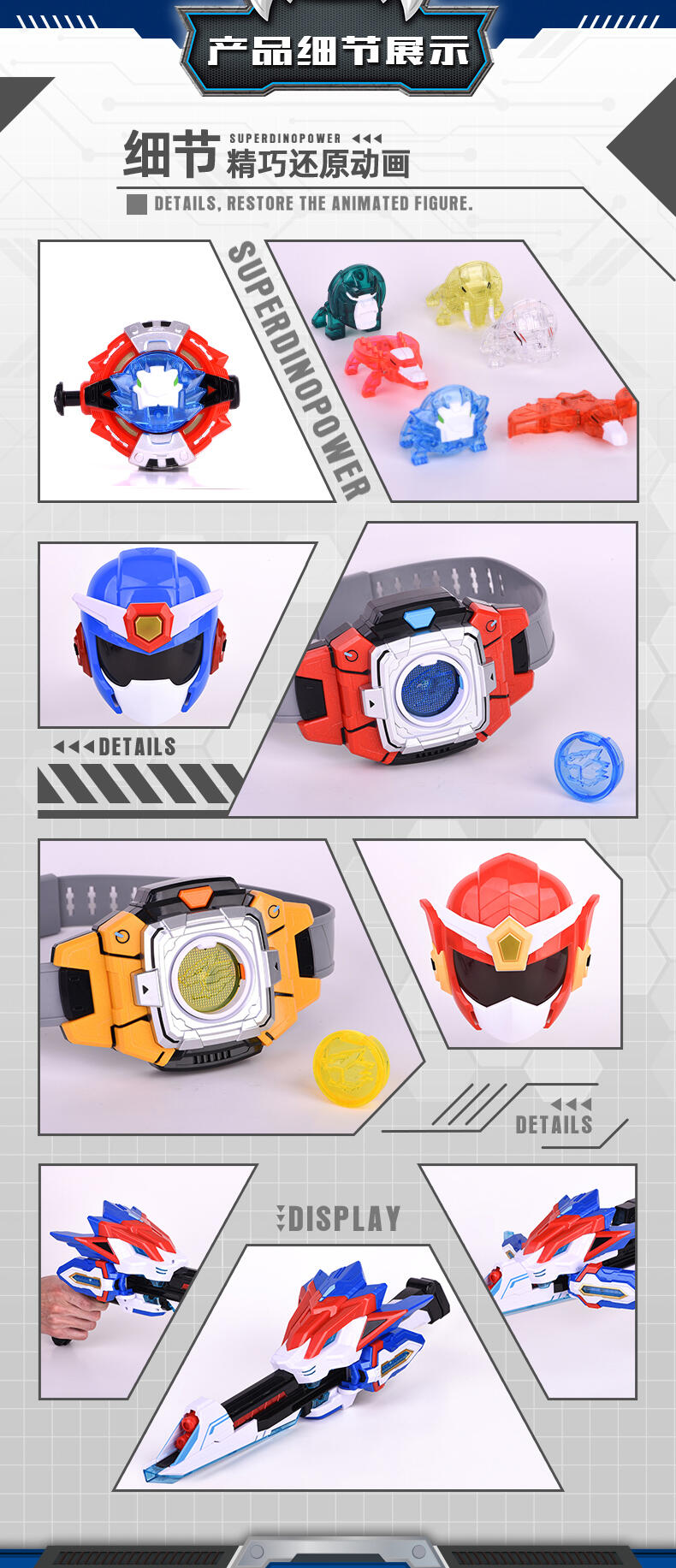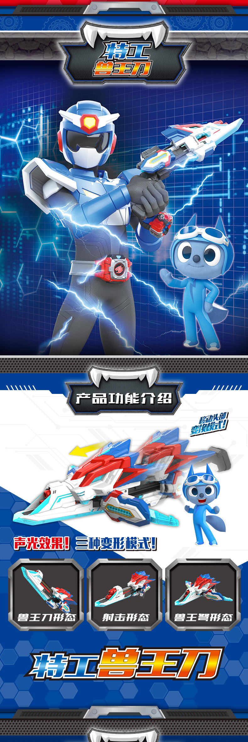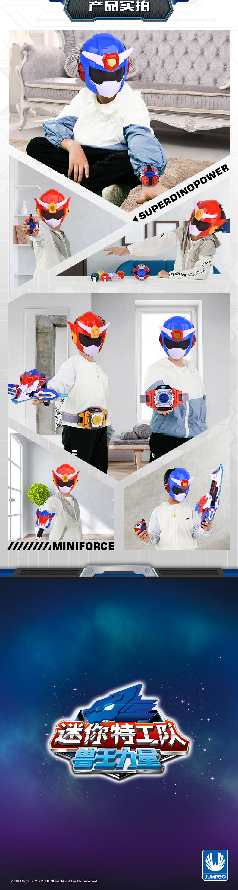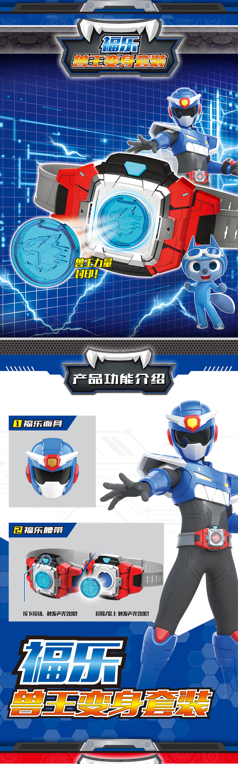1.迷你特工队-兽王力量专属变身器; 2.兽王币装入变身器中,按键有声光效,模拟剧中兽王力量变身的场景; 3.包装内6枚兽王币,各自有单独的变形功能,可以变形成各自的兽王形态。