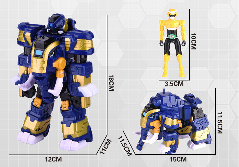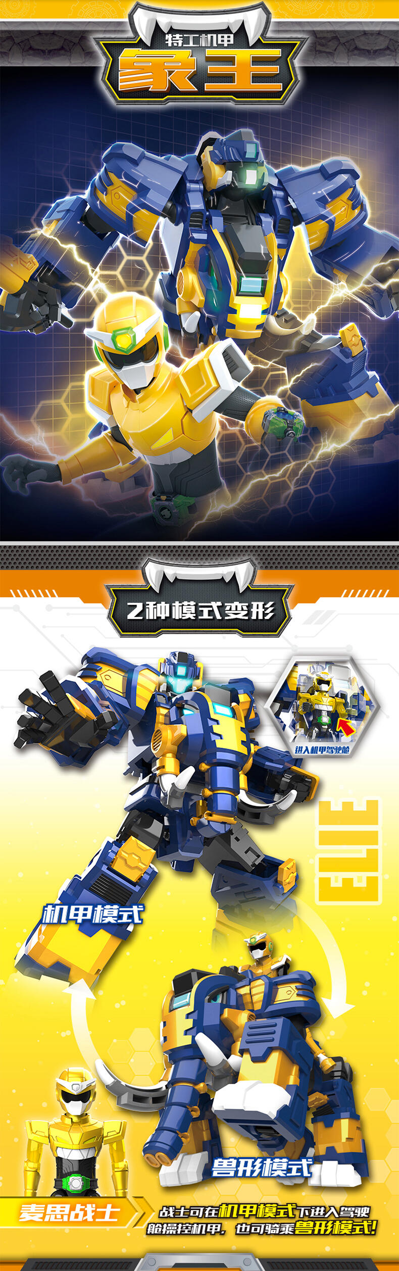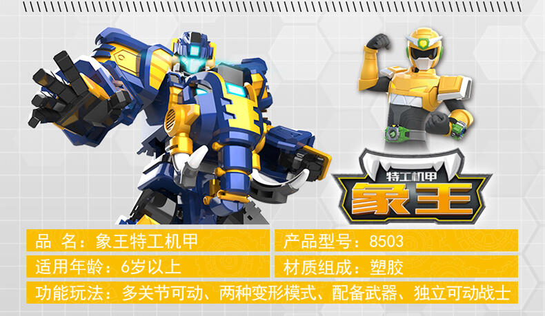 8503:1.麦思的兽王伙伴 2.象王形态与机甲形态自由变形互换,关节灵活,变形顺畅; 3.麦思公仔人偶可以骑乘在象王形态上,也可以安装进机甲形态的驾驶舱内;