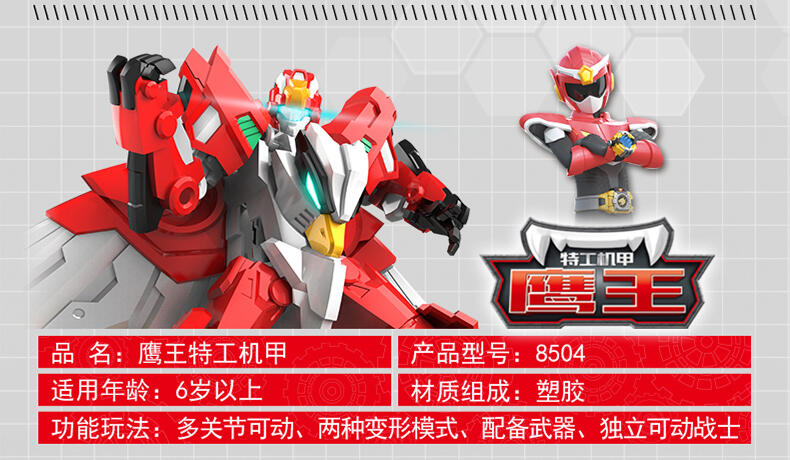 8504:1.小米的兽王伙伴 2.鹰王形态与机甲形态自由变形互换,关节灵活,变形顺畅; 3.小米公仔人偶可以骑乘在鹰王形态上,也可以安装进机甲形态的驾驶舱内;