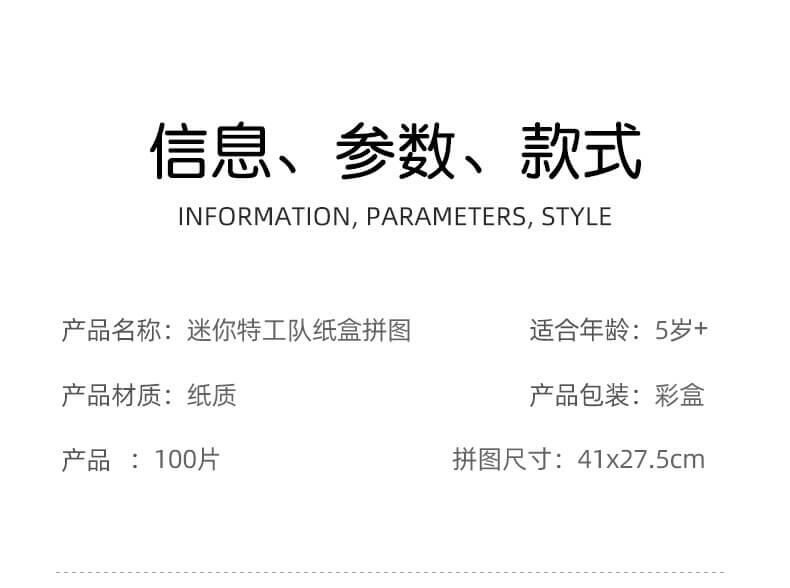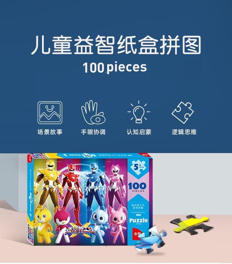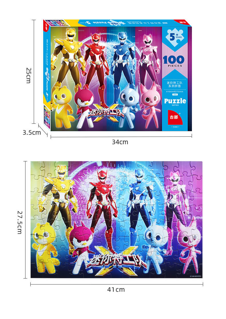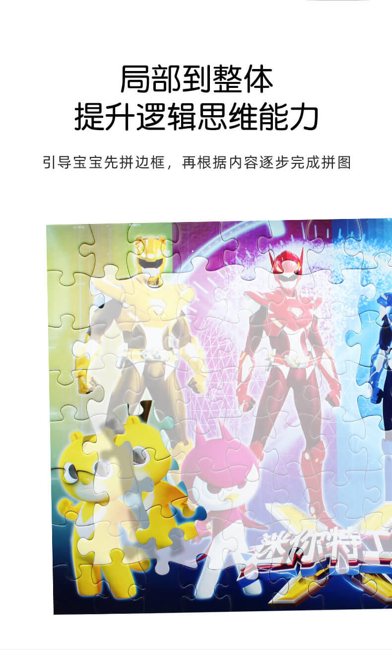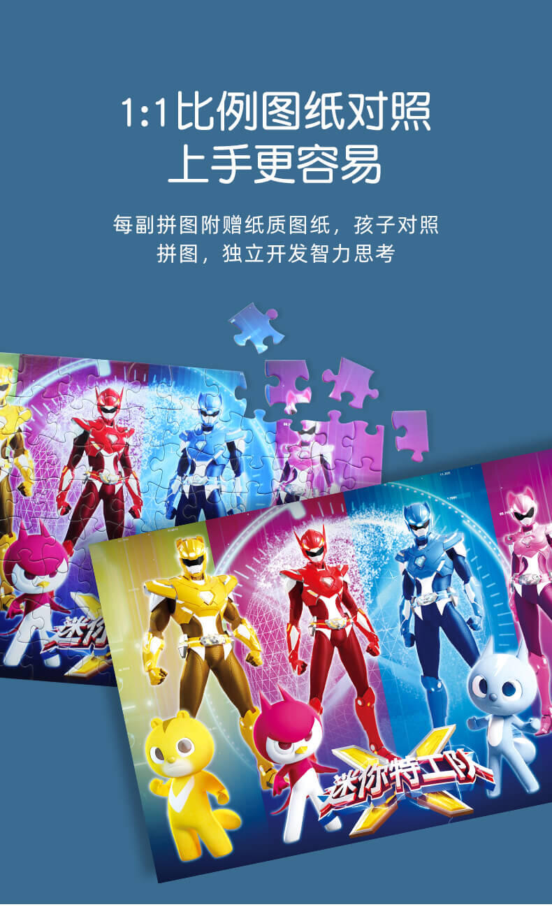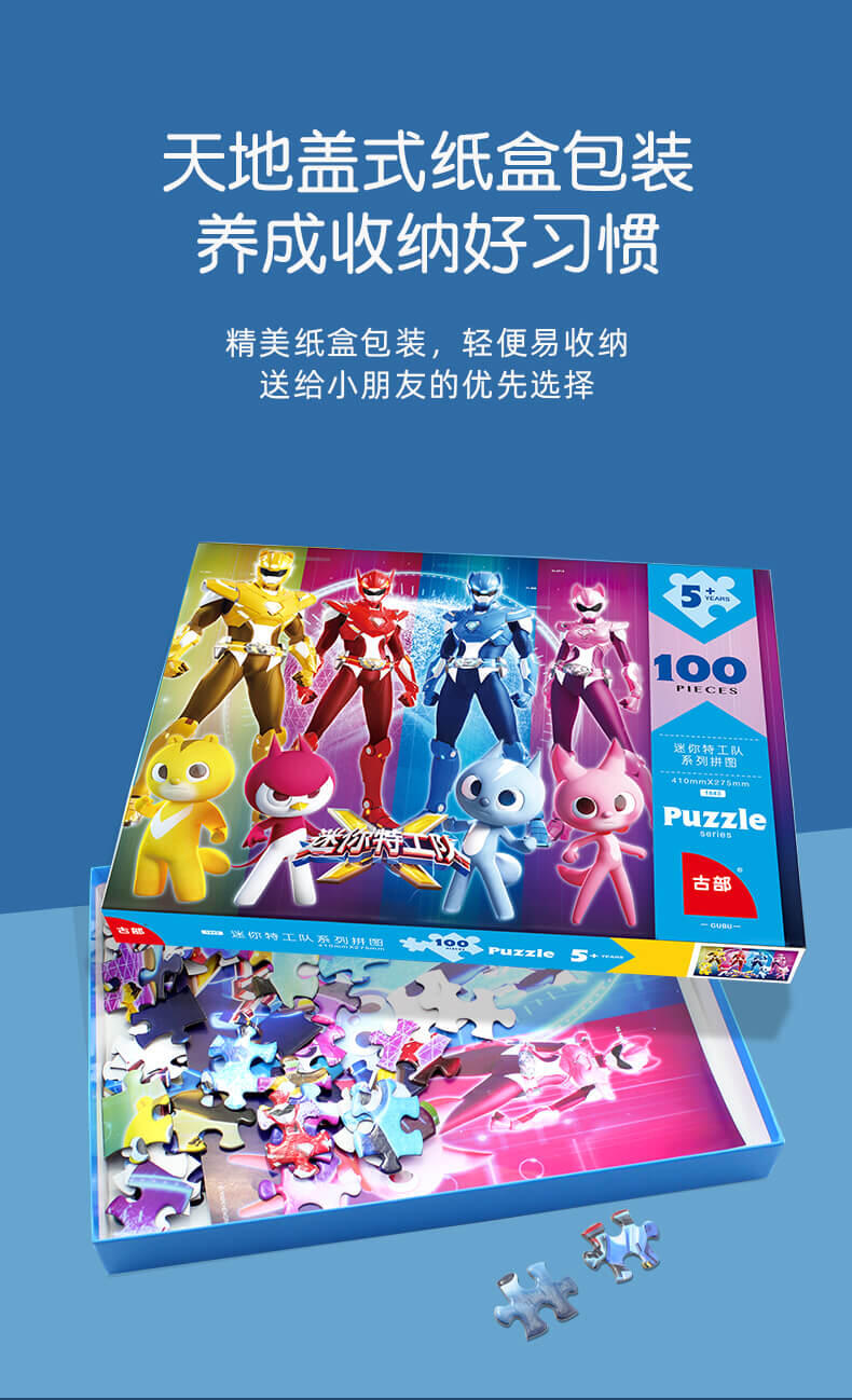 迷你特工队100片纸盒盒装拼图适合5-10岁儿童,采用正版卡通授权图案,培养孩子的色彩的观察力,专注力,及局部到整体拼合的逻辑思维能力,产品采用优质原生纸浆,加厚拼片更耐玩,切片圆润好手感,无毛刺不伤手,赠送高清图案1:1图纸,小朋友们可以对照图纸,进行拼图,拼图拼完后的尺寸大约有41cm*28cm ,整幅拼图看上去非常高质 ,图案高清、色彩亮丽,彩盒包装轻便,有利于儿童养成玩好收纳的好习惯。原生纸浆,压制紧密,切片圆润无毛刺。迷你特工队正版授权IP,品质保证。赠送1:1比例图纸,对照拼图上手更容易 高清印刷,图案精美。天地盖彩盒包装,养成收纳好习惯。材质: 纸质