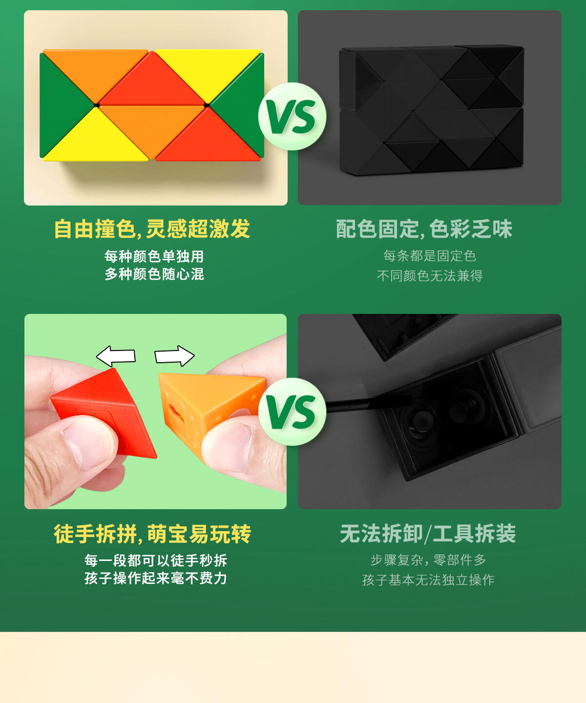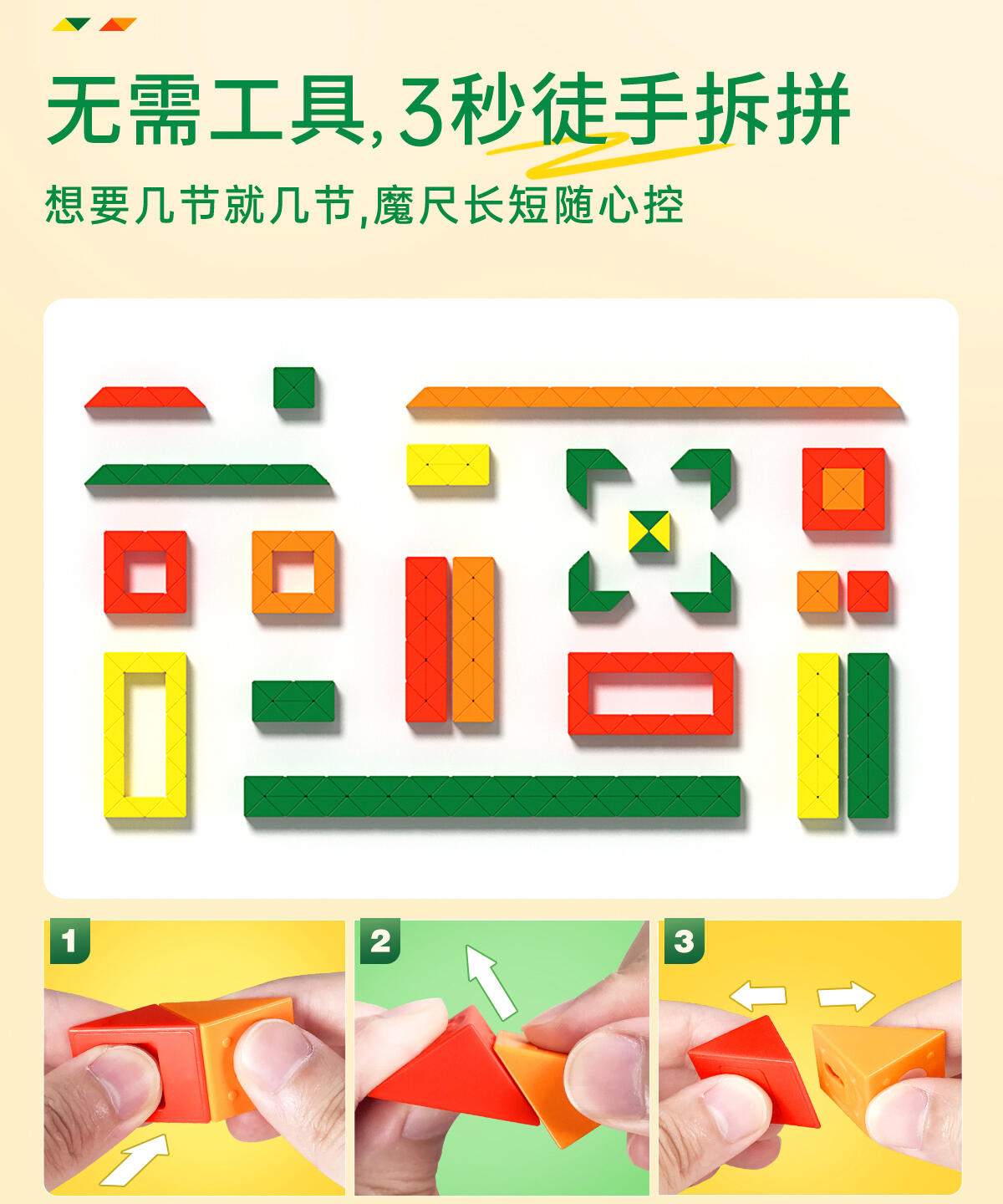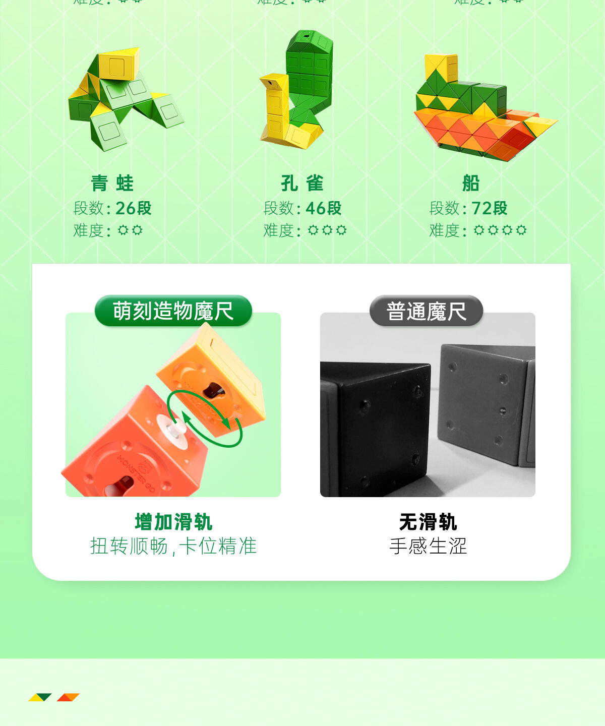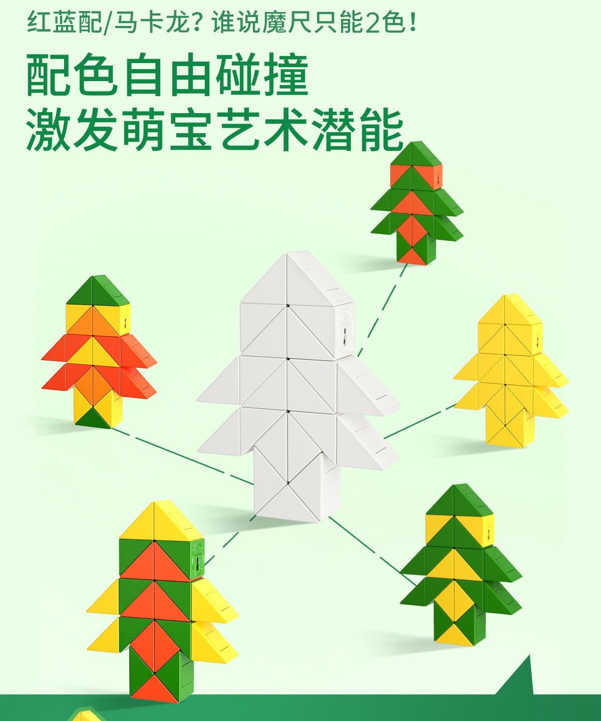 专利级拆拼设计,打破传统魔尺长度限制,长度自由肆意畅玩;扭/拼/叠多种玩法,200+造型随心造