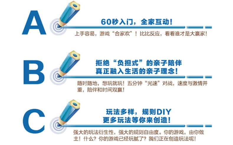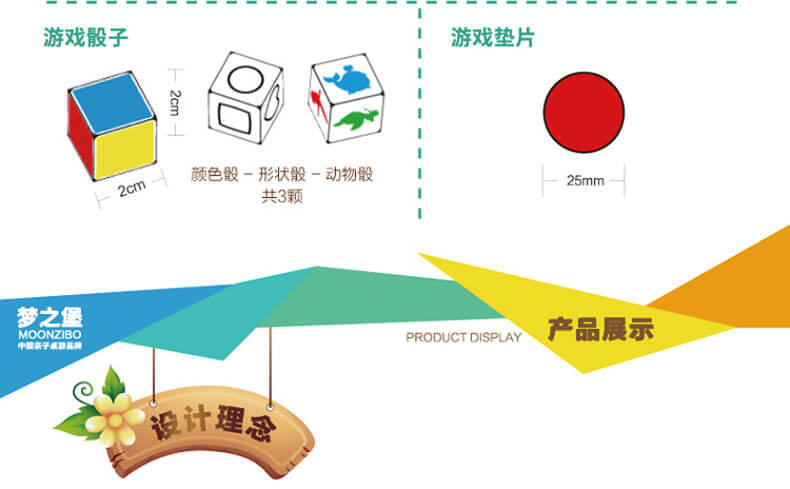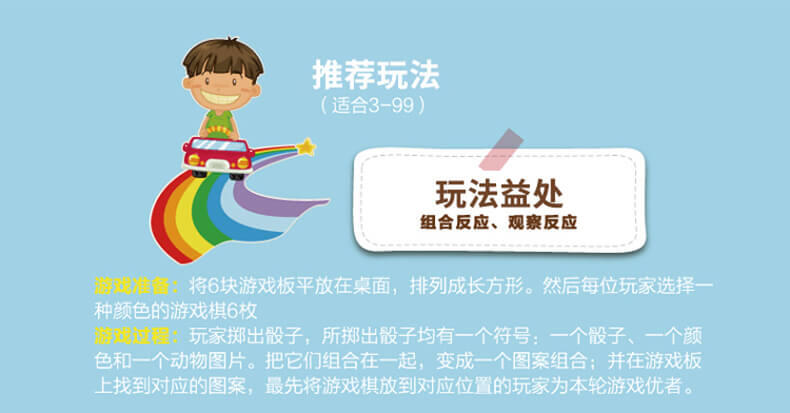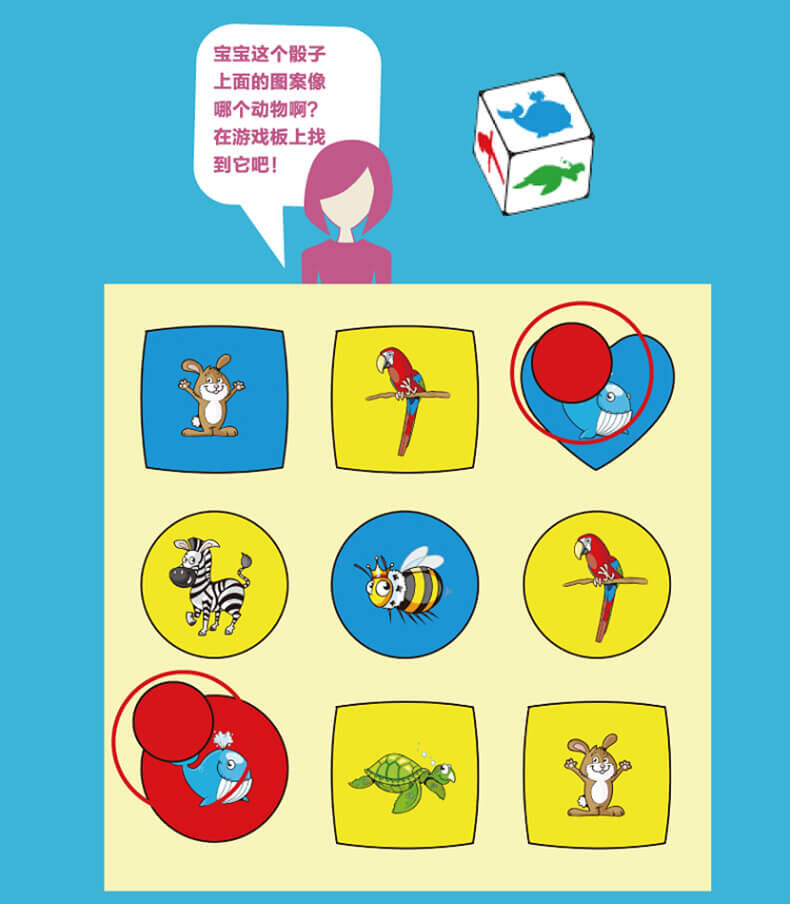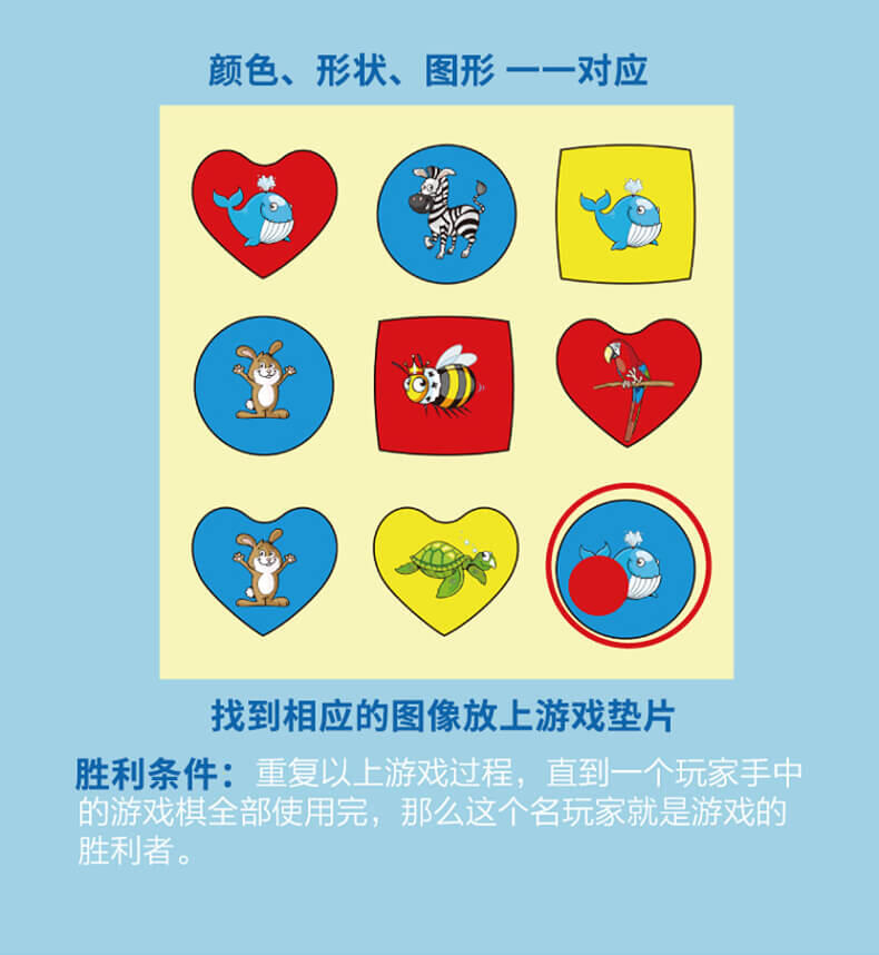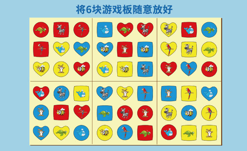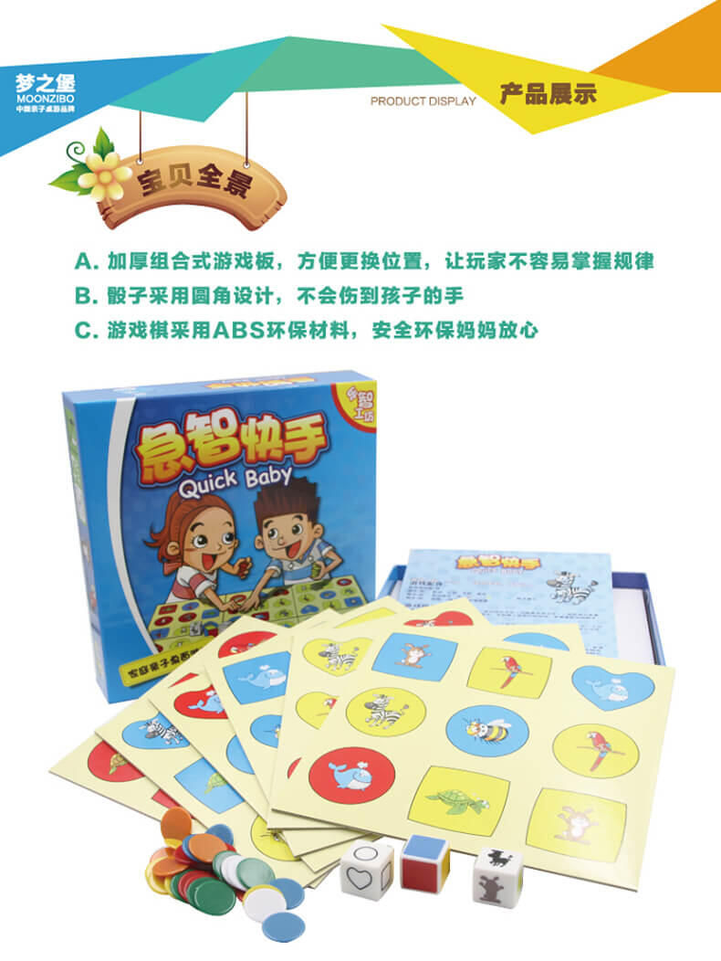 急智快手是一款观察反应游戏,3颗骰子上分别表示了形状、形状底色和动物图案,从掷出3颗骰子的组合提示,最快速度找到游戏板上对应的图形,把你的塑胶片放在对应的图形上。这款游戏能够极大程度锻炼孩子的观察力、反应力。游戏极富互动性,游戏过程欢乐不断。