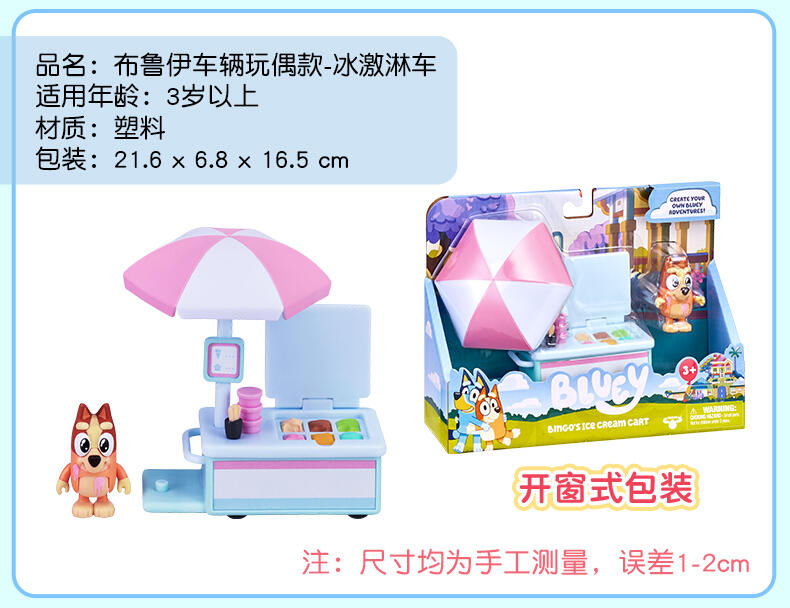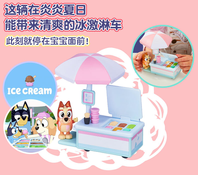 动画片《布鲁伊》讲述了爸爸班底特、妈妈奇莉和姐姐布鲁伊、妹妹宾果一家四口温馨快乐的家庭生活。动画片围绕孩子在游戏中学习和成长的童年时光,向观众展示了当今父母尽职、努力营造高质量亲子关系的过程。还原动画片里的雪糕车,雪糕车可以活动,快来和宾果玩买雪糕的游戏吧!